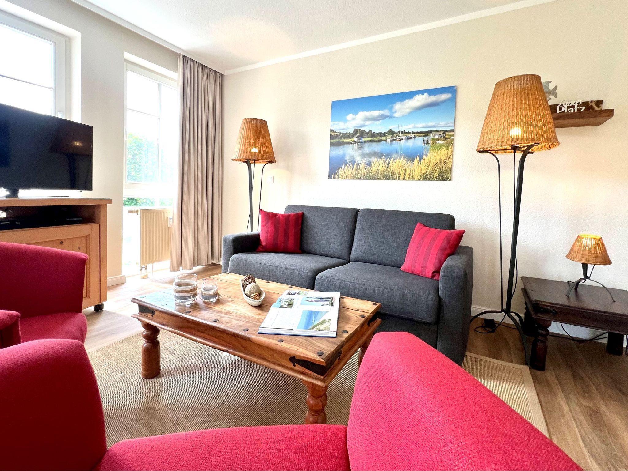 Das Schlafzimmer ist mit Verdunklungsmöglichkeiten und einem Doppelbett ausgestattet. Im gemütlichen Wohnzimmer sorgen eine bequeme Couch mit Schlaffunktion und Sessel für entspannte Fernsehabende. Zusätzlich sind 3 Sky-Sender im Fernseher inklusive. Der Esstisch bietet Platz für gemeinsame Mahlzeiten.