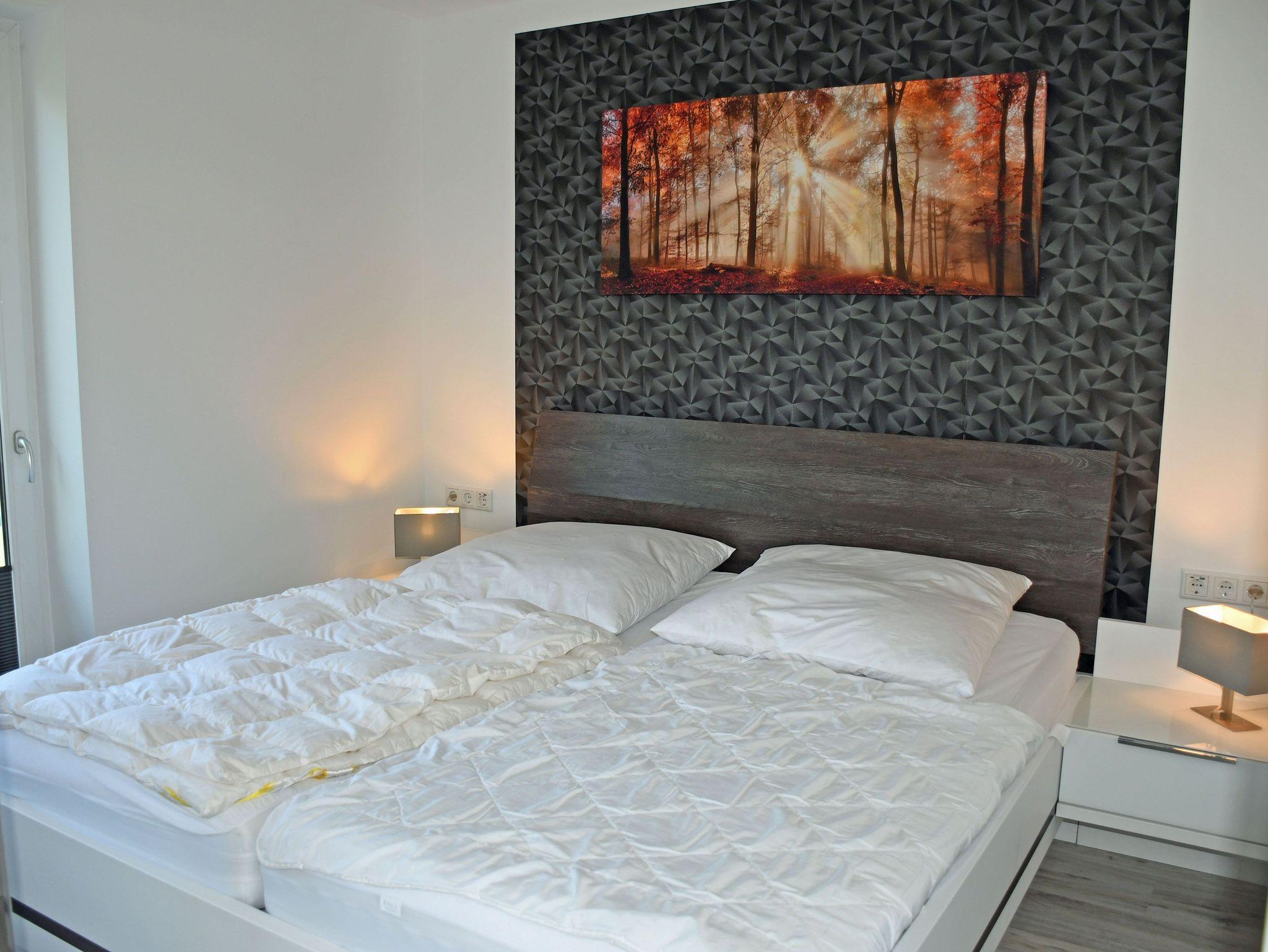 Im Schlafzimmer befinden sich ein bequemes Doppelbett mit Nachttischen und Leselampen sowie einem Kleiderschrank.