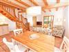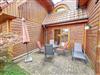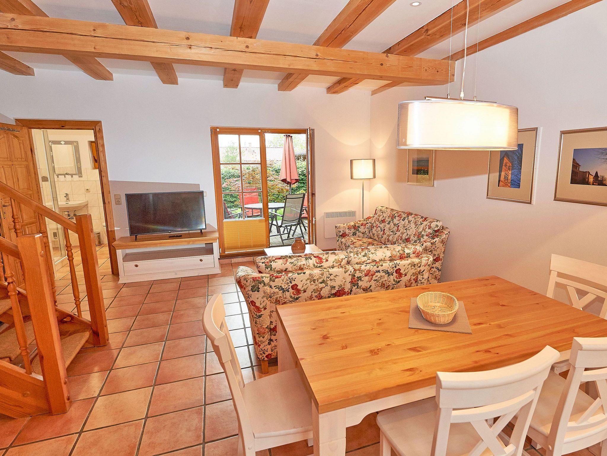 Die Haushälfte 2 erstreckt sich auf zwei Etagen über ca. 100 m² Wohnfläche und verfügt im Erdgeschoss über ein großes und funktional eingerichtetes Wohnzimmer, das durch die offenen Balken besonders gemütlich wirkt. Die Terrasse zur Westseite ist mit Sonnenliegen und Sitzgruppe ausgestattet.