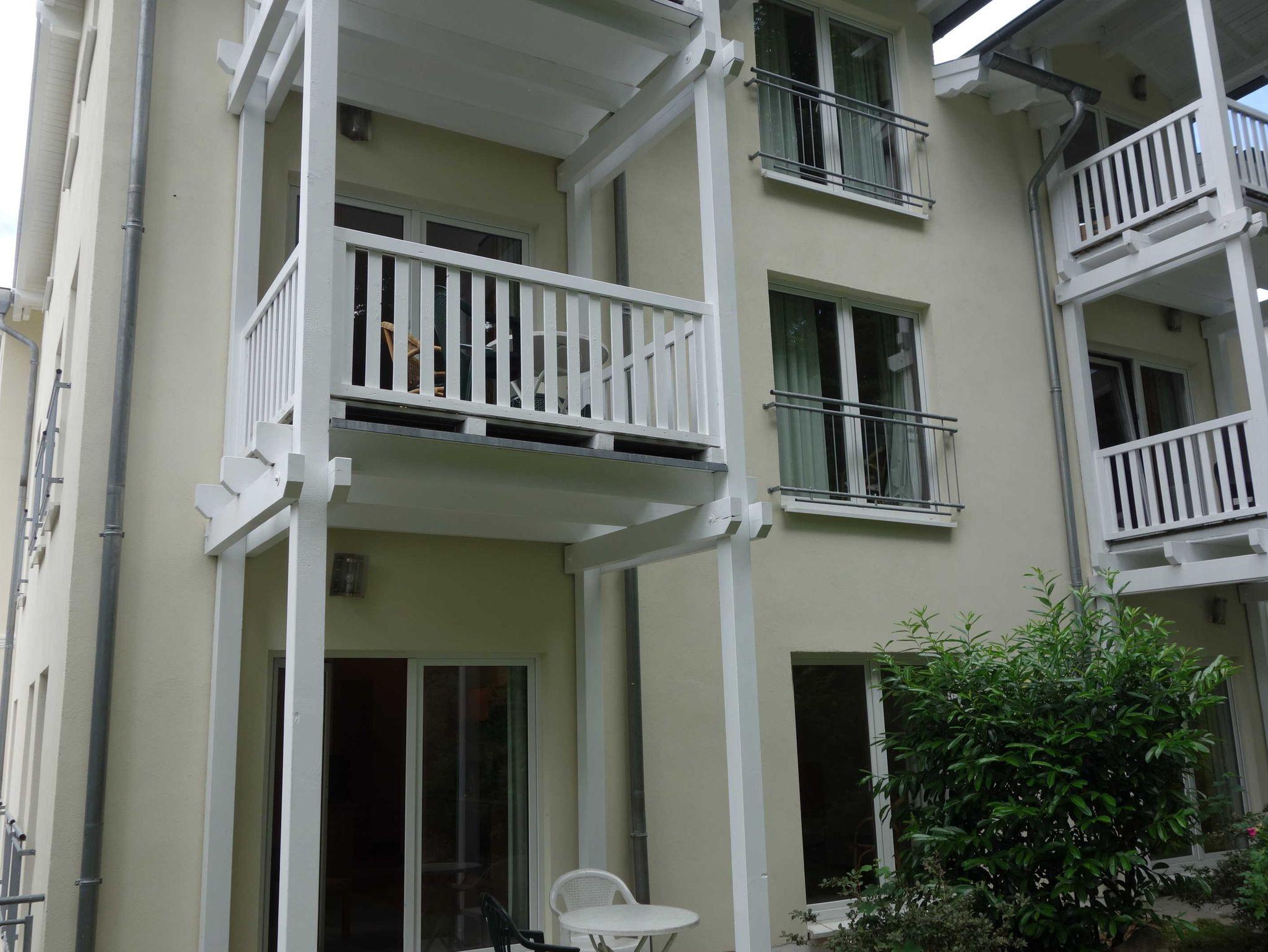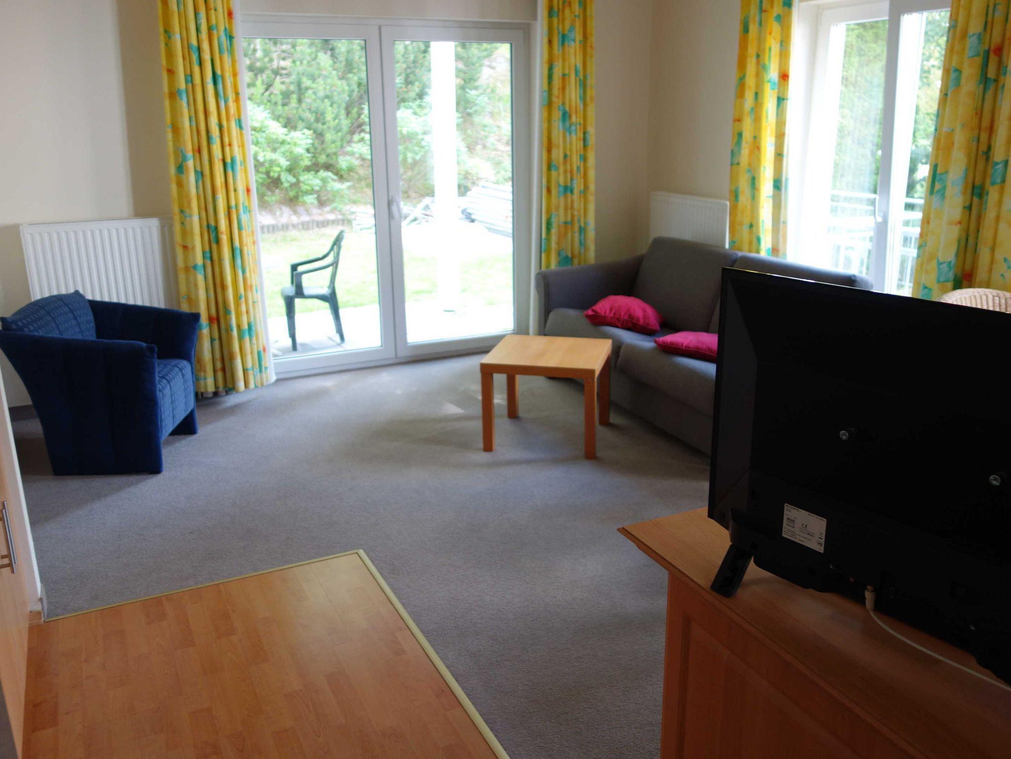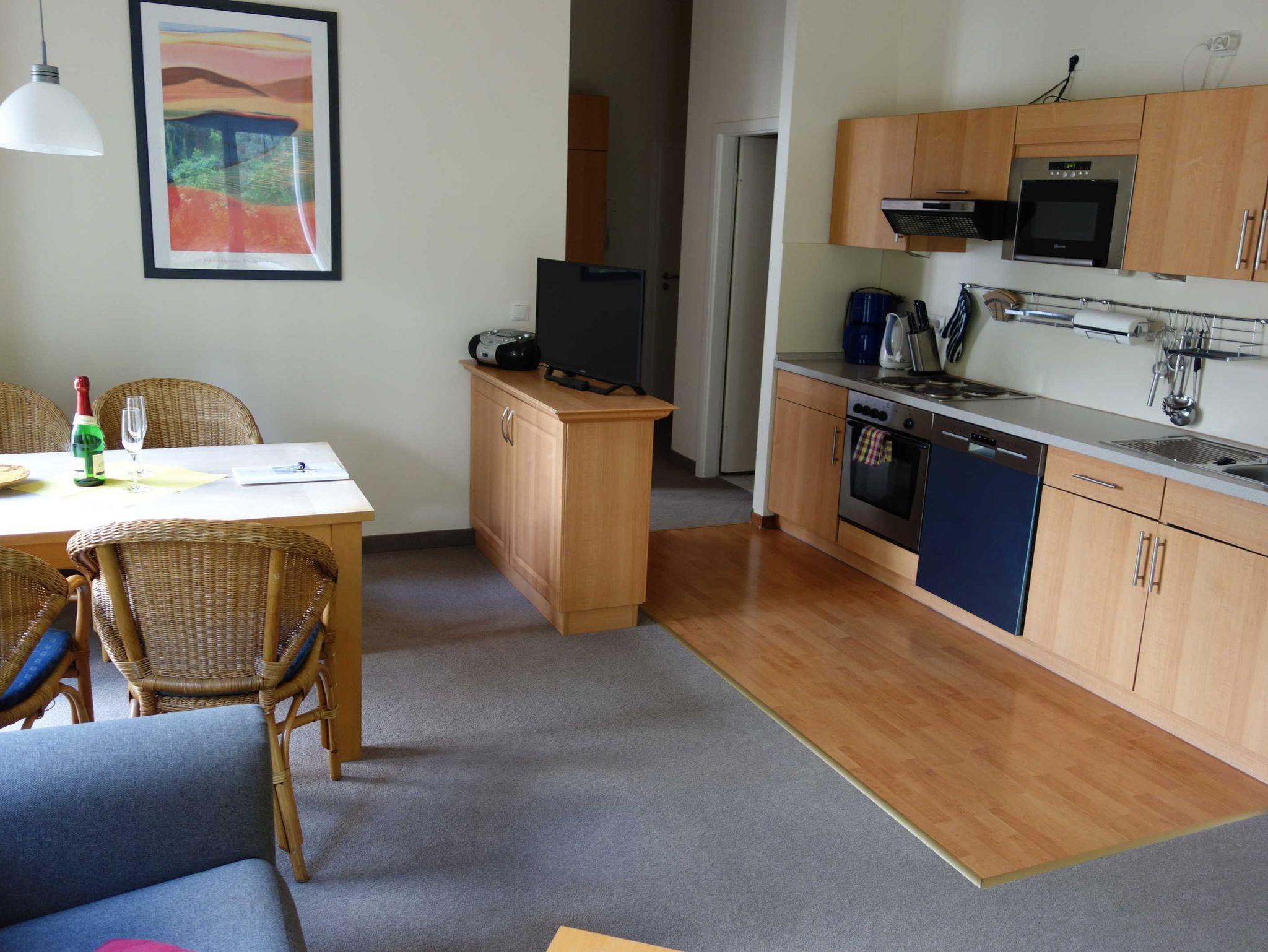 Ein Doppelbett, zwei Einzelbetten, eine Doppelschlafcouch, einen Balkon / Terrasse mit Gartenzugang, voll ausgestattete Küchenzeile (mit Geschirrspüler, Mikrowelle, Backofen, Tiefkühlfach), Bad (Badewanne mit Dusche, WC), Fahrstuhl in das 1. Obergeschoss, kostenlose Sauna-Nutzung, Kinderbett und Kinderstuhl auf Anfrage kostenlos stellbar, kostenlose W-LAN-Nutzung, Münzwaschmaschine und Trockner, Parkplatz (entgeltlich, bitte im Voraus telefonisch buchen), Hunde und Haustiere auf Anfrage (entgeltlich) möglich, mehr Infos unter Urlaub mit Hund. Das Rauchen ist im gesamten Haus nicht erlaubt (aber auf dem Balkon möglich).