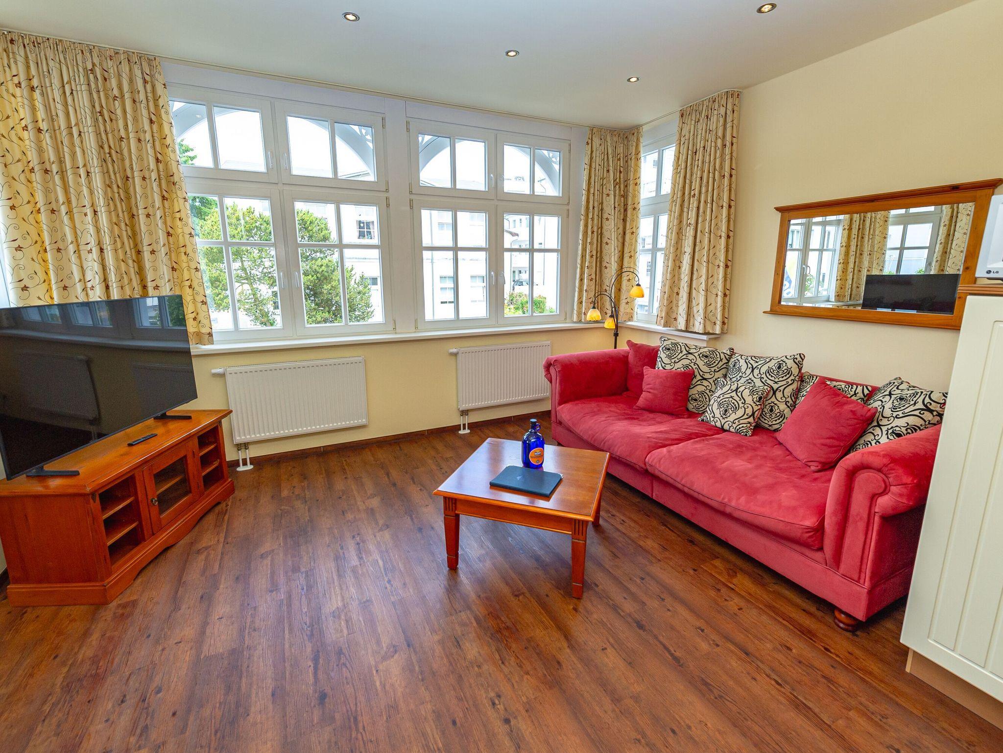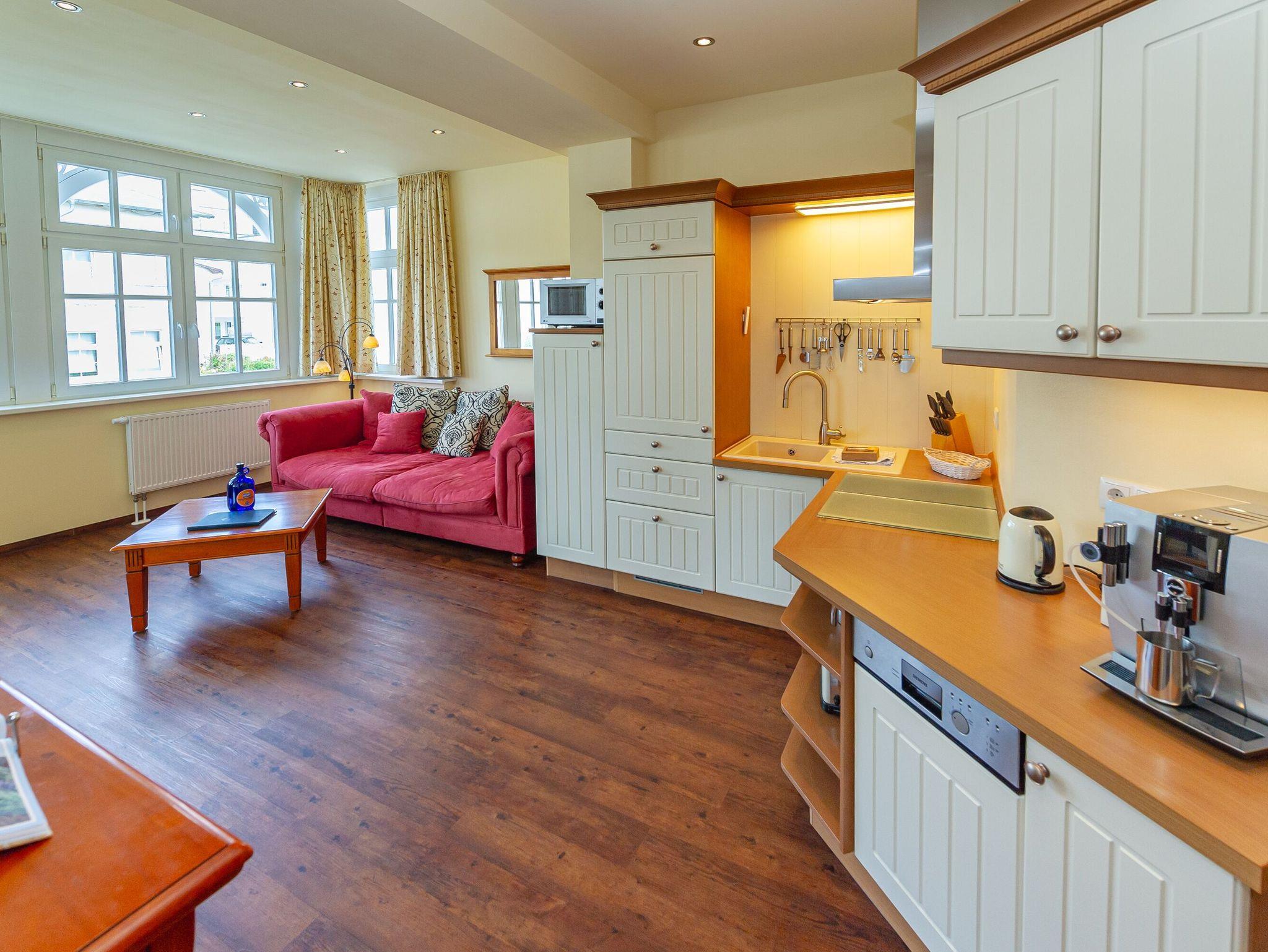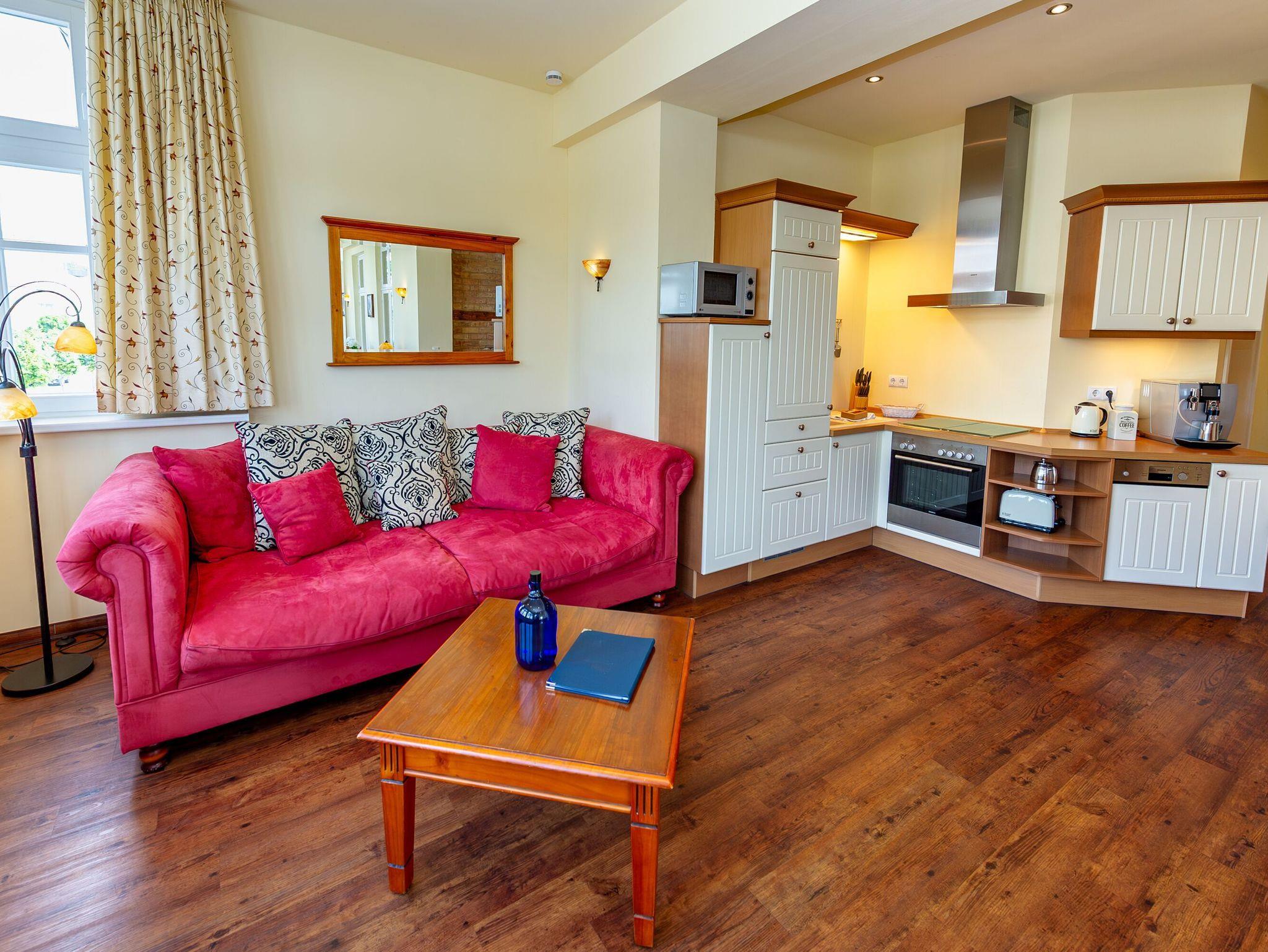 Dieses schöne 2-Raum-Appartement im 1. Obergeschoss ist im bernsteinfarbenen Landhausstil eingerichtet, hat eine Wohnfläche von ca. 56 m² und einen möblierten Balkon (ca. 5 m²) zur Abendsonne.