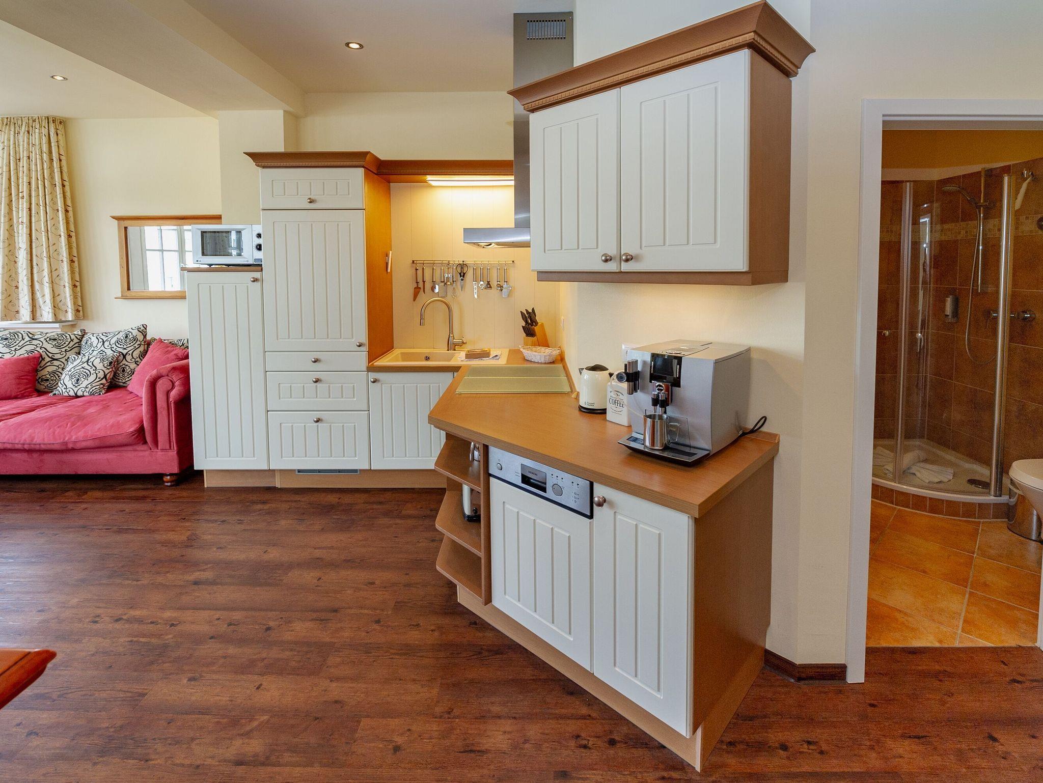 Die Landhausküchenzeile lässt keine Wünsche offen. Hier finden Sie u.a. einen Kühlschrank mit Gefrierfach, einen Backofen, ein 4-Platten-Ceranfeld, eine Spülmaschine sowie Mikrowelle, Toaster, Mixer, einen Eierkocher und diverses Kleininventar, das die Küchenausstattung komplettiert. Ein JURA-Kaffeeautomat sorgt für Kaffee satt.