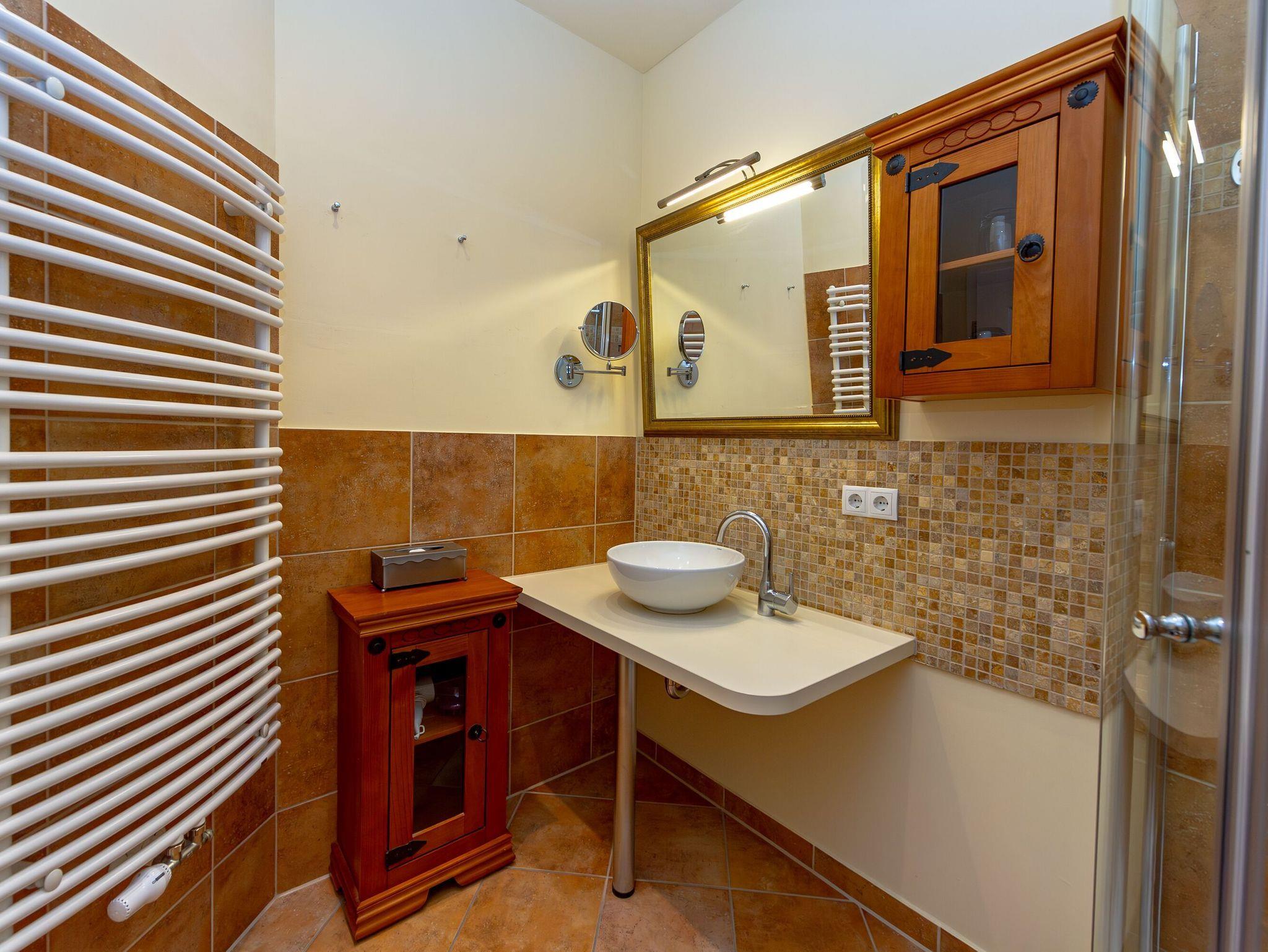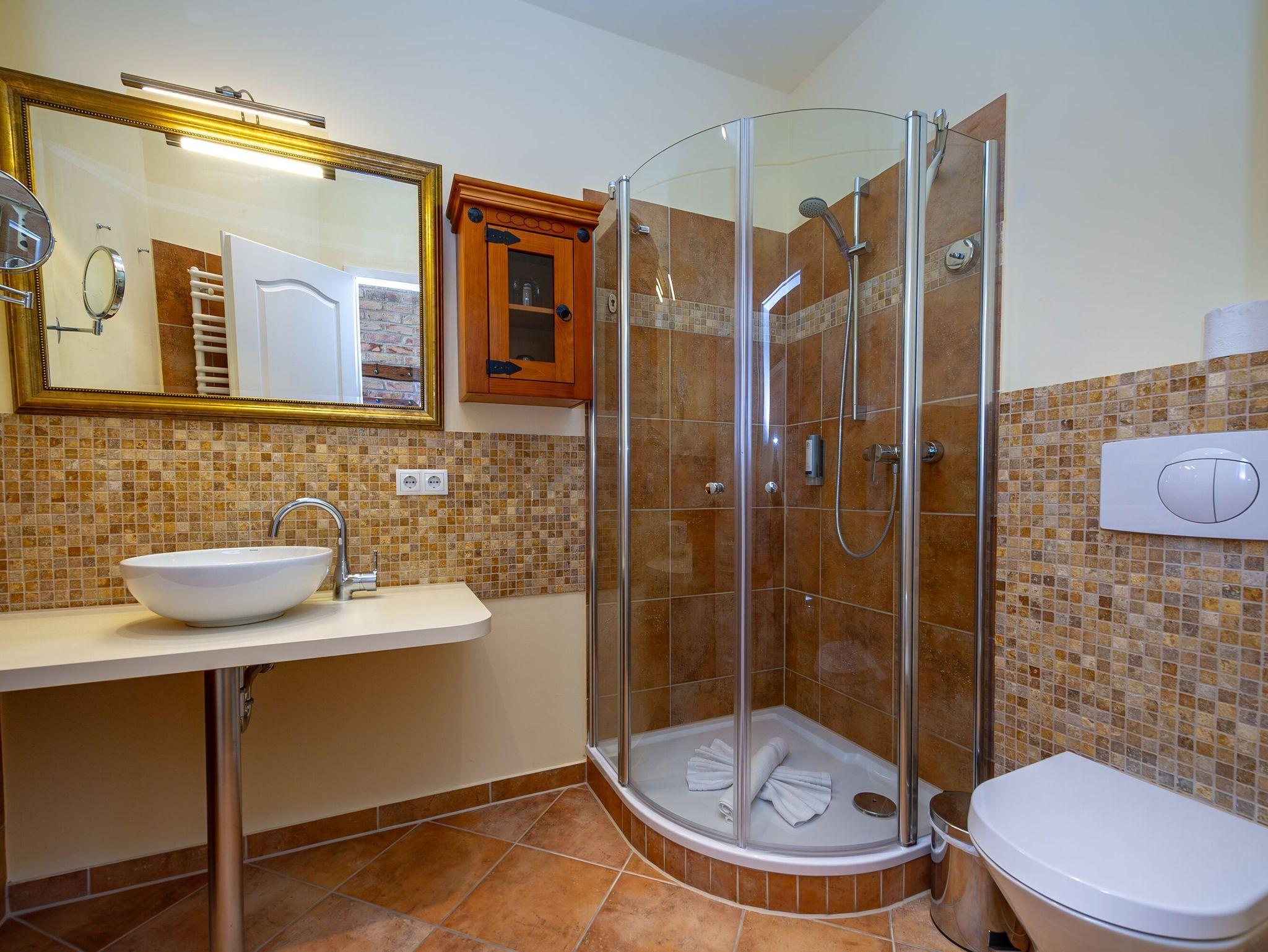 Es steht Ihnen ein modernes Duschbad mit WC, Waschbecken, Handtuchheizung und Fußbodenheizung zur Verfügung.