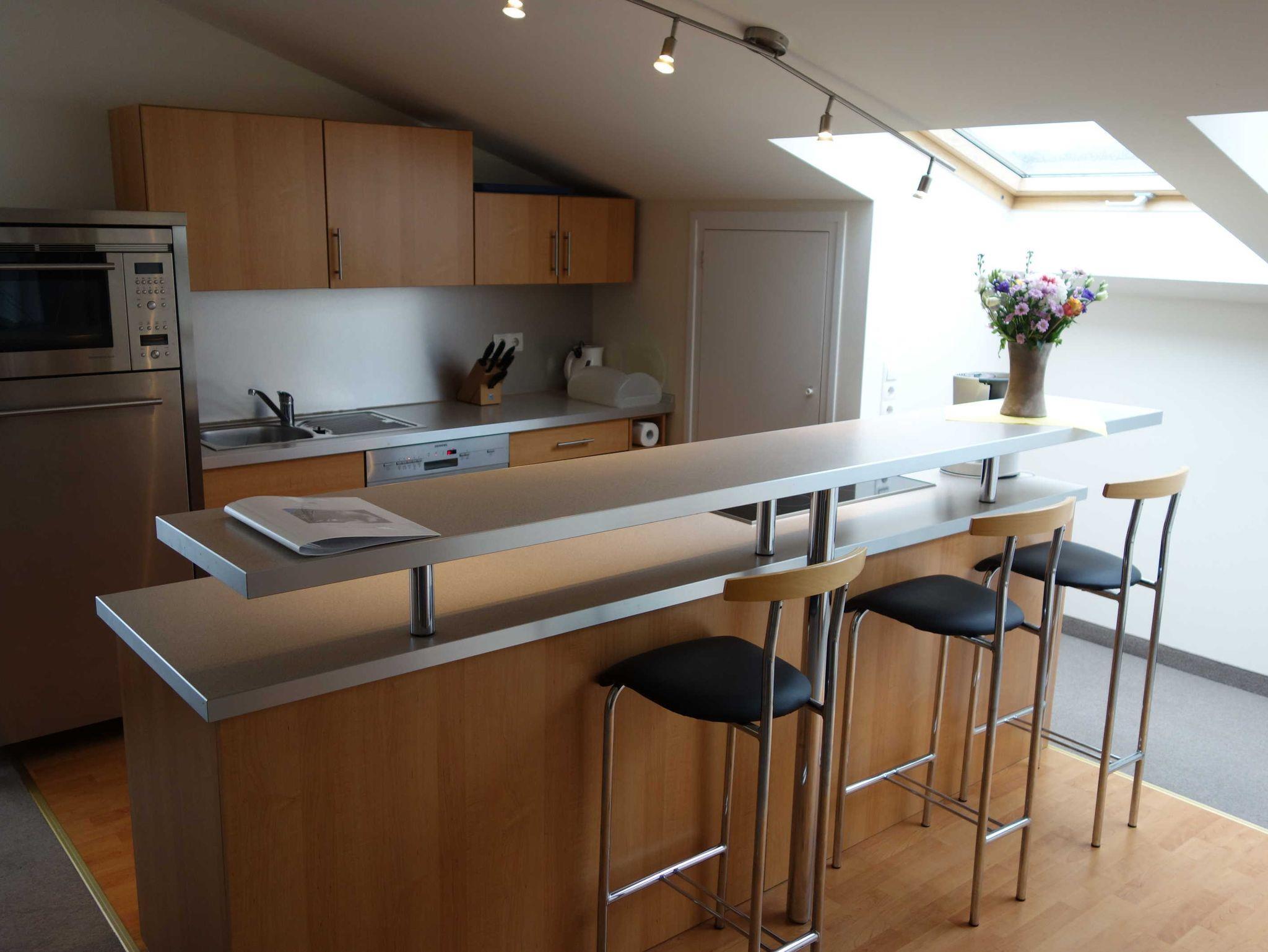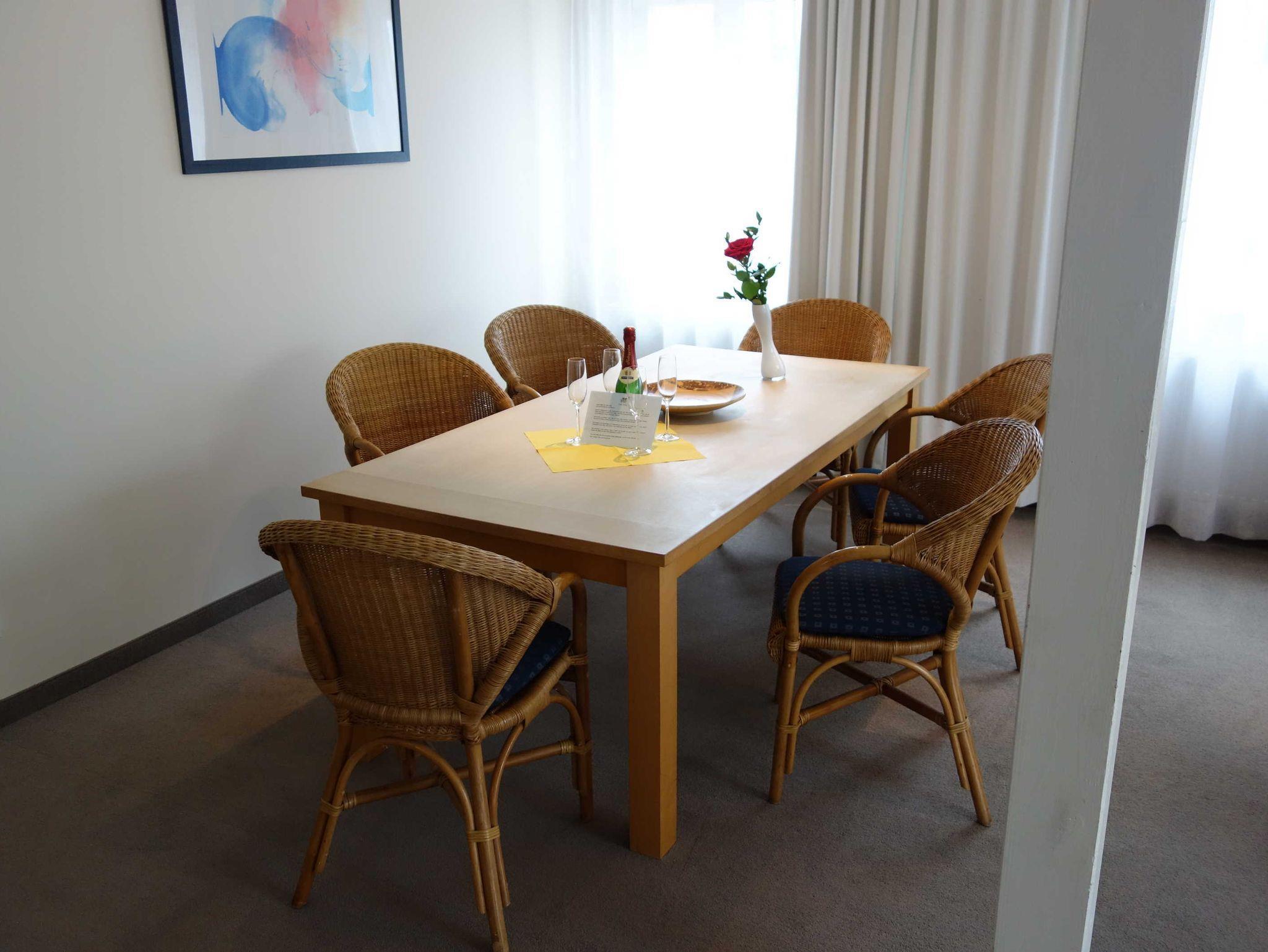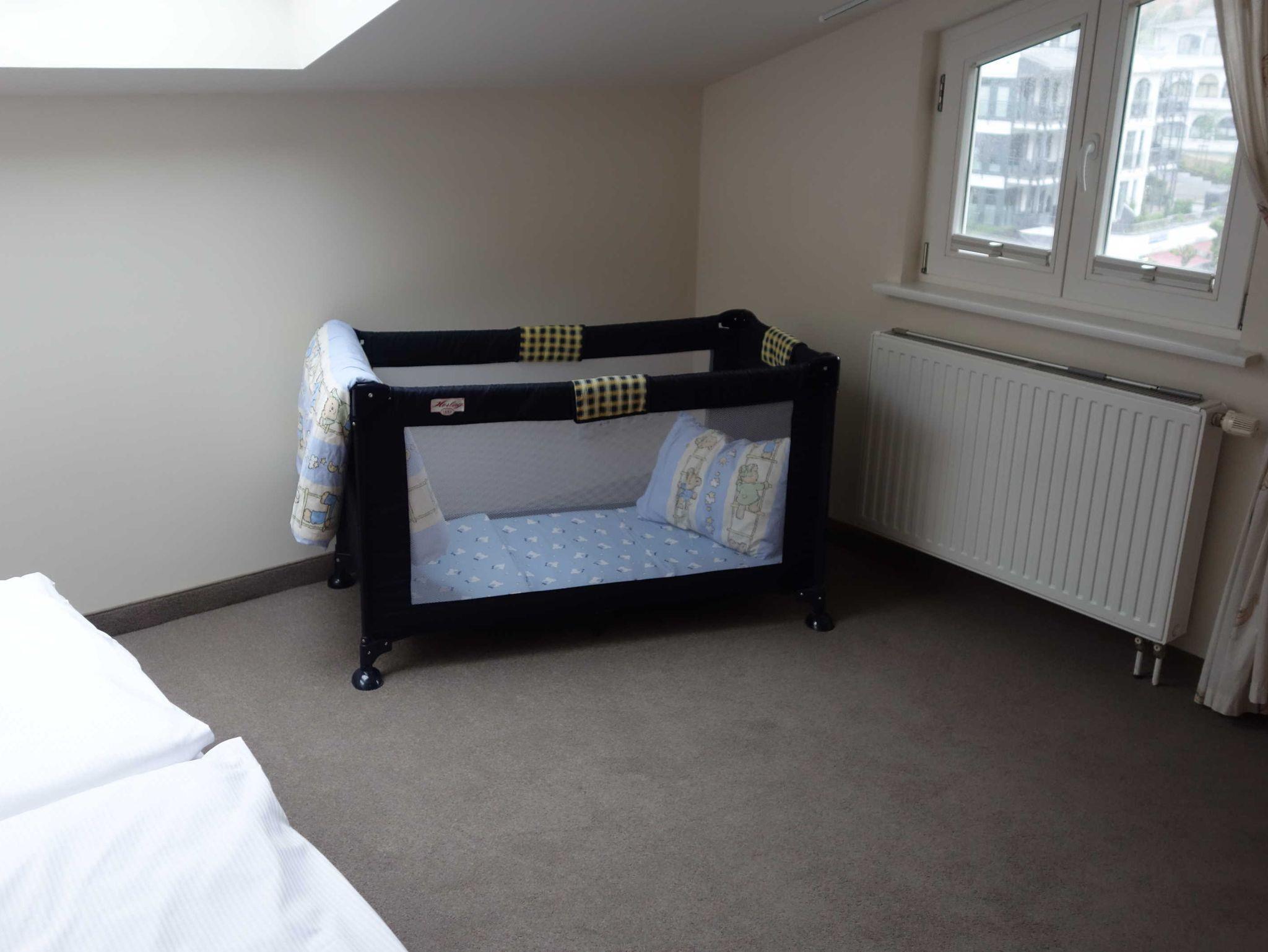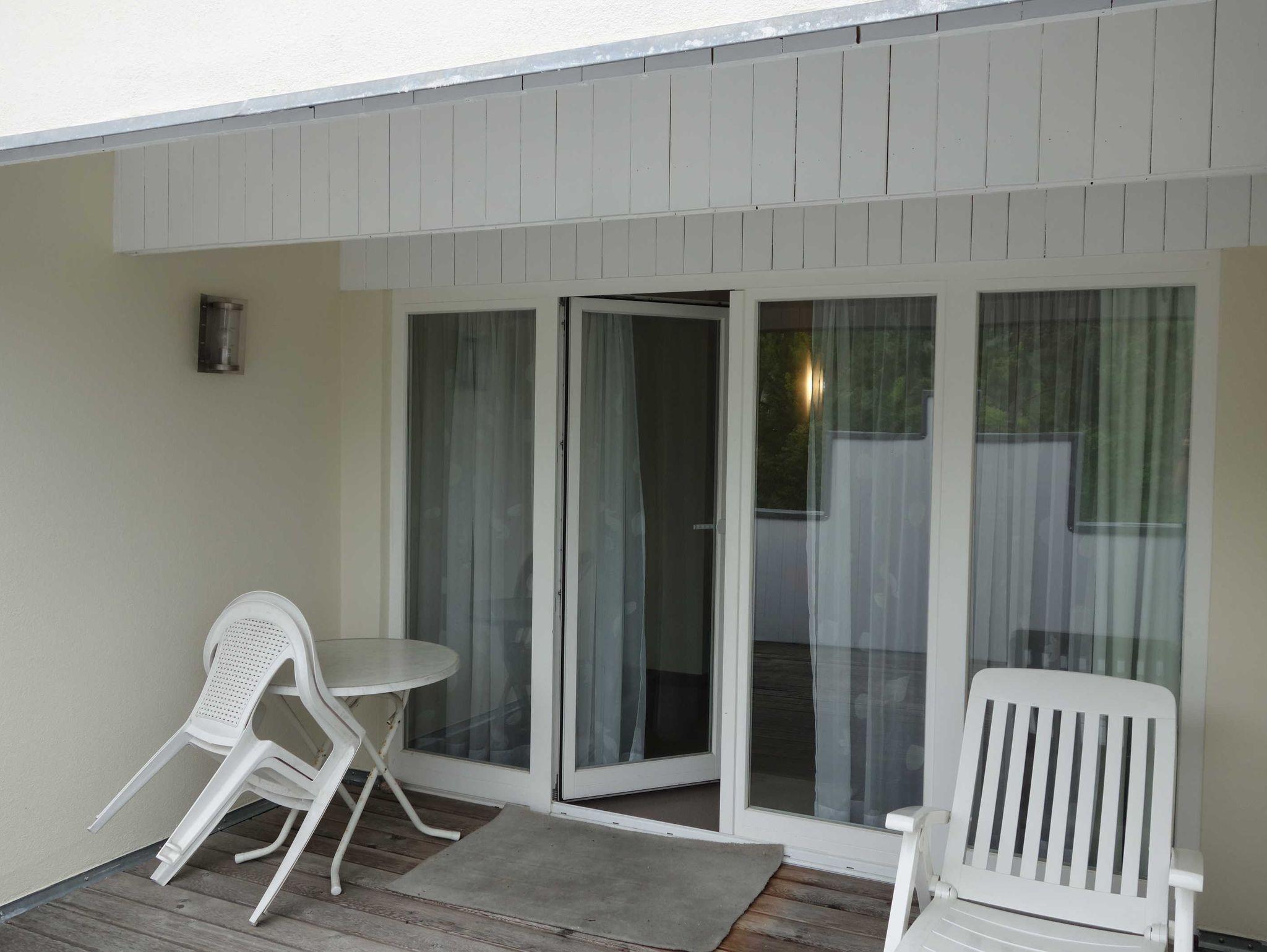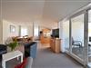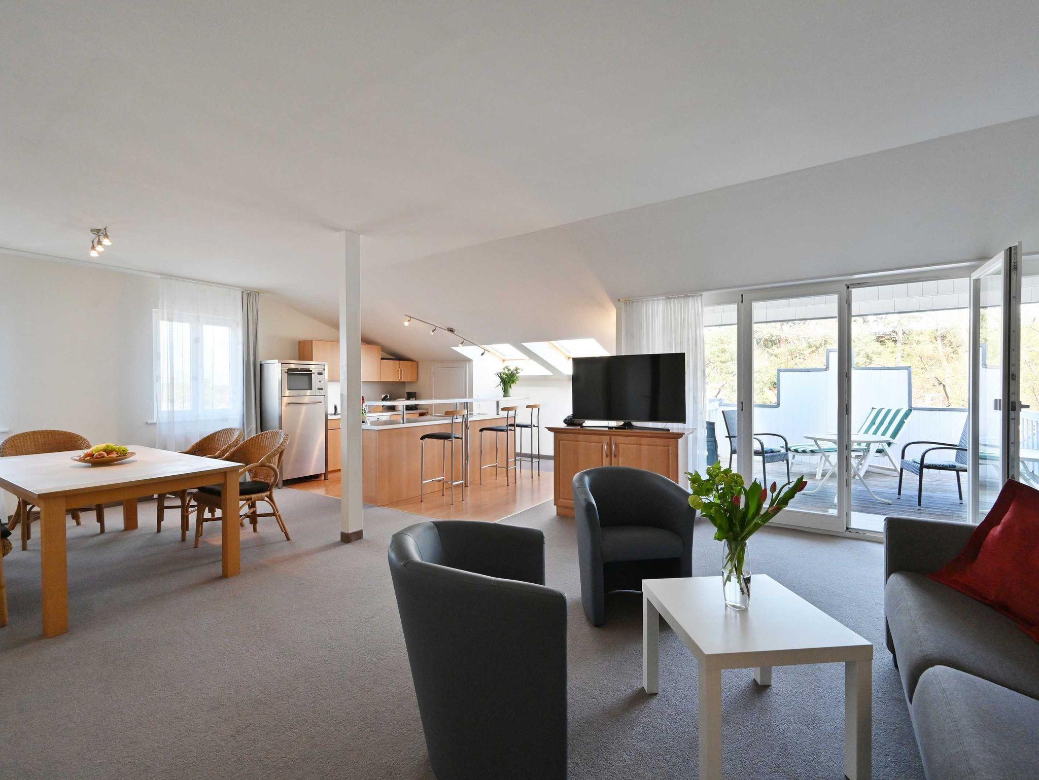 Blick auf die See und die Seebrücke, ein Zimmer mit Doppelbett, ein Zimmer mit zwei Einzelbetten, ein Zimmer mit einem Stockbett, ein großer Penthouse-Balkon, voll ausgestattete Küchenzeile (mit Geschirrspüler, Mikrowelle, Backofen, Tiefkühlfach), Bad (Badewanne mit Dusche, WC), kleine 2-Personen-Sauna in der Wohnung, Fahrstuhl in das 3. Obergeschoss, kostenlose Sauna-Nutzung, Kinderbett und Kinderstuhl auf Anfrage kostenlos stellbar, kostenlose W-LAN-Nutzung, Münzwaschmaschine und Trockner, Parkplatz (entgeltlich, bitte im Voraus telefonisch buchen), Rauchen im gesamten Haus nicht erlaubt (aber auf dem Balkon möglich).