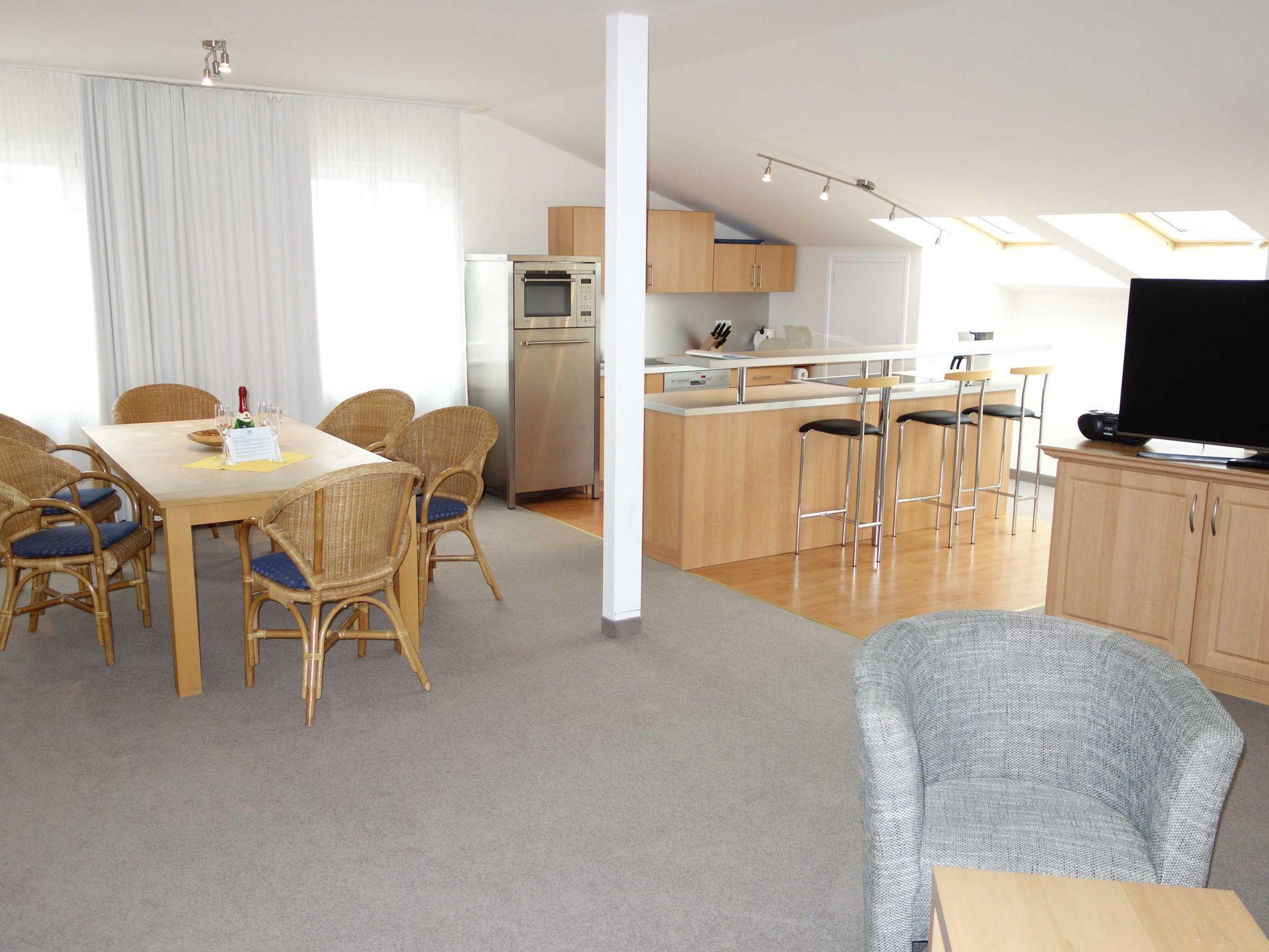 Die schöne Vier-Zimmer Ferienwohnung Nr. 13 mit einer Größe von 132 m² für bis zu 8 Personen liegt im 3. Obergeschoss (Dachgeschoss) und hat die folgende Einrichtung / Ausstattung: