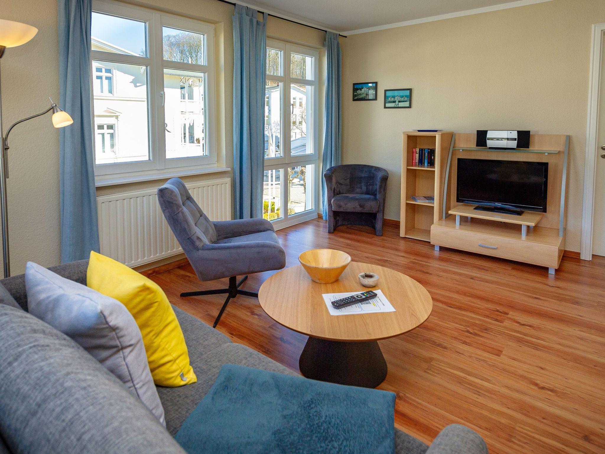 Der helle, freundliche Wohnraum ist mit einer bequemen Schlafcouch (die als Aufbettung für zwei Personen genutzt werden kann), zwei Polstersesseln, einem Flachbild-TV, einer Mini-Stereoanlage mit CD-Player und einem Esstisch passend für die Personenanzahl in der Wohnung ausgestattet.
