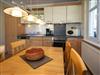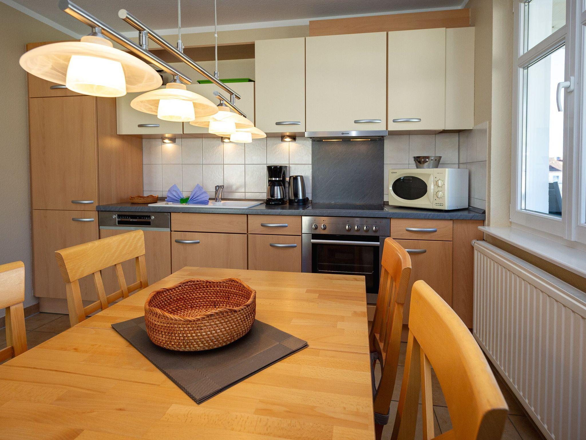 Die harmonisch im Wohnbereich integrierte Küchenzeile ist ausgestattet mit einem Kühlschrank mit Gefrierfach, einem 4-Platten-Cerankochfeld, einem Backofen, einer Geschirrspülmaschine, einer Mikrowelle, Wasserkocher, Kaffeemaschine, Toaster und diversem Kleininventar, das die Küchenausstattung komplettiert.