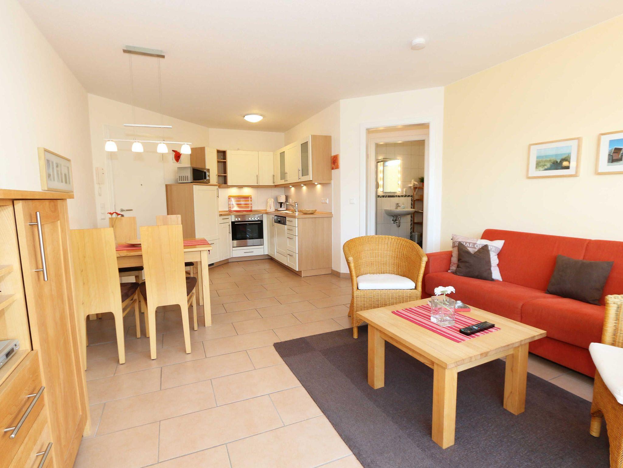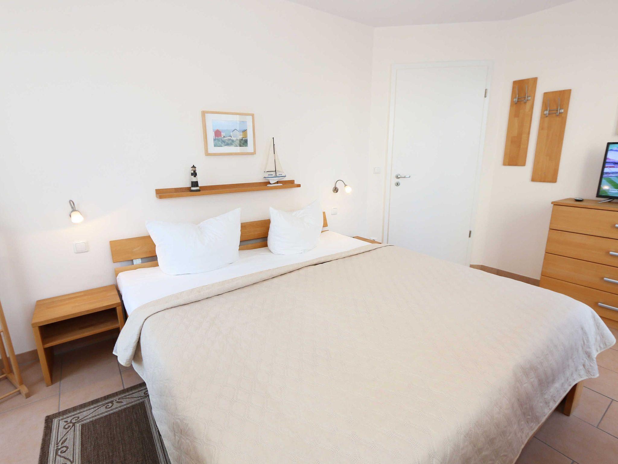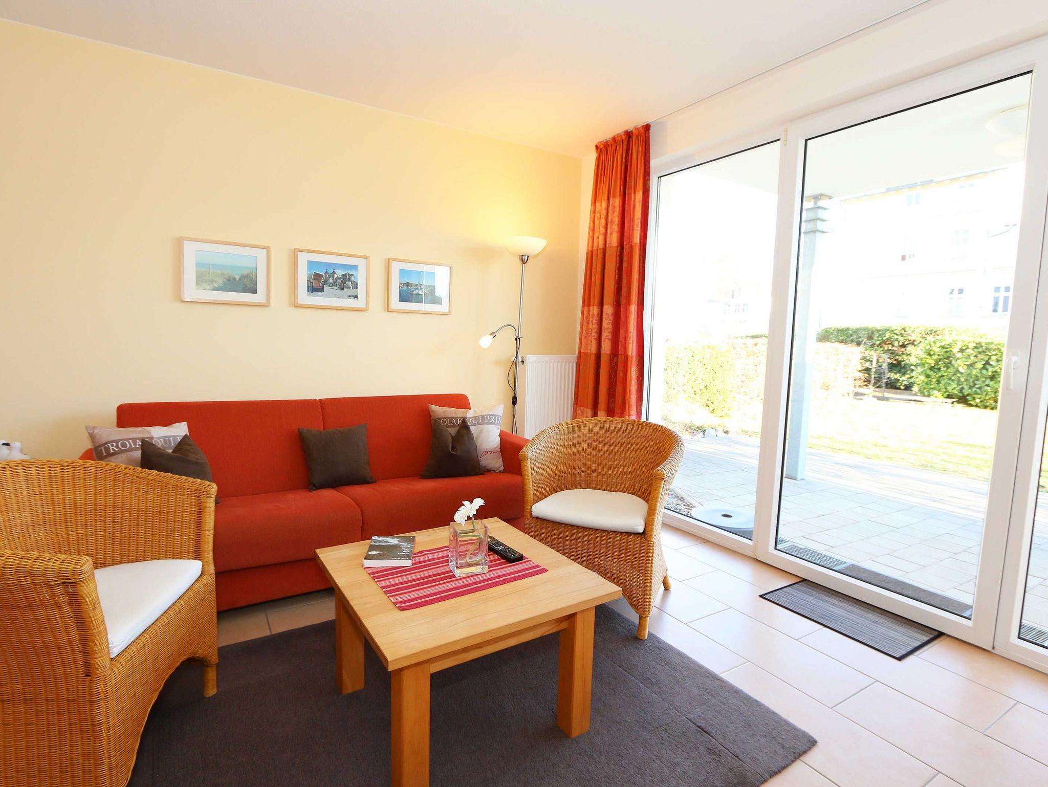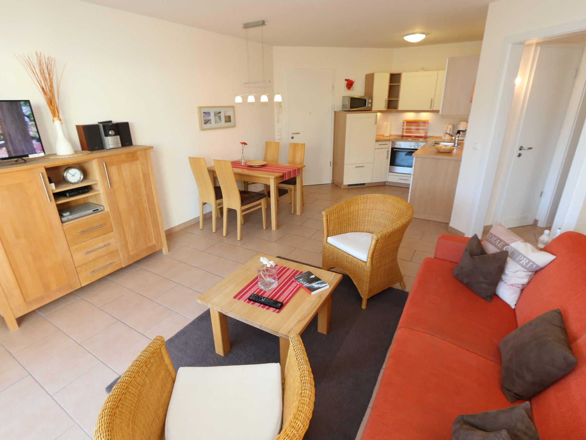 Sie wohnen in einer modern und hochwertig eingerichteten 2-Zimmer-Nichtraucherwohnung. Bei einer Wohnungsgröße von ca. 50m² haben 2 bis 4 Personen ausreichend Platz. Vom Eingangsbereich aus gelangen Sie in einen großzügigen, lichtdurchfluteten Wohn- und Essbereich. Der Wohnbereich ist mit einem Sideboard, Leselampe, Smart-TV, DVD-Player, Stereoanlage, einer gemütlichen Couch (hochwertige Ausziehfunktion mit separater Matratze 1,60 m x 2,00 m) mit Couchtisch ausgestattet. Auch auf einen Internetanschluss (WLAN) müssen Sie im Urlaub nicht verzichten. Dieser ist für unsere Gäste inklusive! Die komplett ausgestattete Küchenzeile wird durch einen Geschirrspüler, Backofen, Mikrowelle, Kühlschrank mit Gefrierfach, Kaffeemaschine, Toaster, Wasserkocher, Eierkocher, kleine Küchenutensilien sowie durch eine Essgruppe mit 4 Stühlen abgerundet. Angrenzend liegt das Schlafzimmer mit einem Doppelbett (1,80m x 2,00m, 7 Zonen-Kaltschaummatratze), verstellbare Lattenroste, einem geräumigen Kleiderschrank, Insektenschutzgitter, LCD-TV und zusätzlicher Kommode. Für einen ruhigen Schlaf können Sie den Raum abdunkeln. Das Badezimmer ist mit Dusche, Waschtisch, WC, Kosmetikspiegel, Fön, Insektenschutzgitter und beheizbaren Handtuchhalter/Fußbodenheizung sowie einem Einbauradio ausgestattet. Im separaten Abstellraum finden Sie einen Wäscheständer, Bügeleisen sowie ein Bügelbrett, Reinigungsutensilien und ein Schuhschrank. Auf der teilweisen überdachten Terrasse (Osten), die sowohl vom Wohnbereich wie auch vom Schlafzimmer erreichbar ist, befindet sich eine Sitzgruppe und eine Sonnenliege. Hier können Sie den angrenzenden Garten von ca. 60m² frei nutzen. Haustiere sind nicht erlaubt. Für unsere kleinen Gäste steht Ihnen ein Kinderreisebett (ohne Matratze, ohne Bettinlett) inklusive zur Verfügung. Einen PKW-Stellplatz (Nr.1, Einfahrtshöhe 2,10m) finden Sie in der Tiefgarage des Hauses. Ihre geliehenen oder auch mitgebrachten Fahrräder können Sie im eigenen abschließbaren Kellerraum unterstellen. Im Gemeinschaftskeller können Sie gegen einen Aufpreis die gemeinschaftliche Waschmaschine und den Trockner nutzen. Die Wertmarken können Sie auf Nachfrage während Ihres Urlaubes erwerben. Die Erstausstattung eines Wäschepaketes (komplette Bettwäsche, 1 Duschhandtuch, 1 kleines Handtuch) können Sie bis 14 Tage vor Anreise gegen einen Aufpreis dazu buchen oder durch eigene ergänzen. Ab 2 gebuchten Paketen erhalten Sie einmalig 1 Geschirrhandtuch und 1 Duschvorleger hinzu.