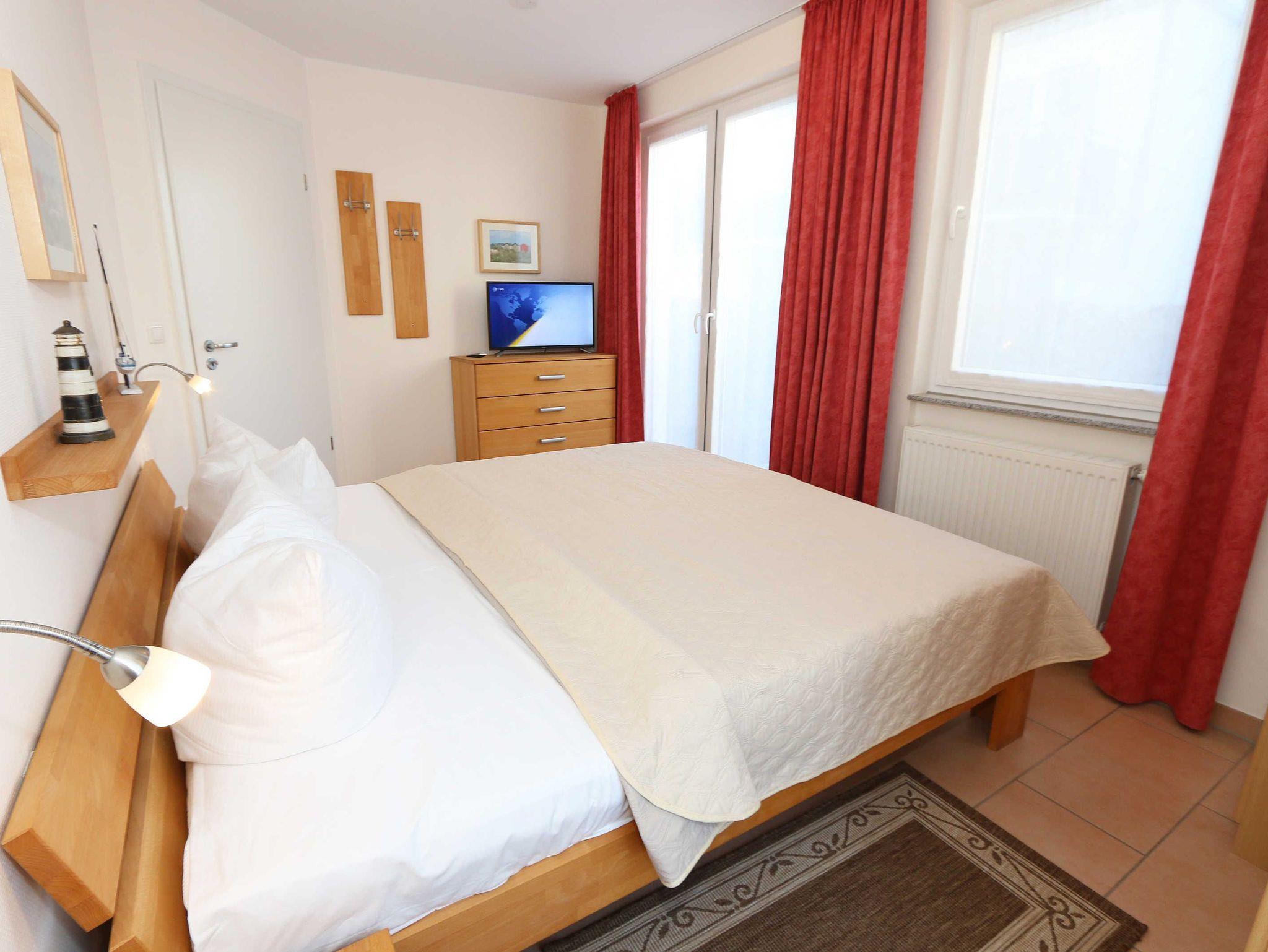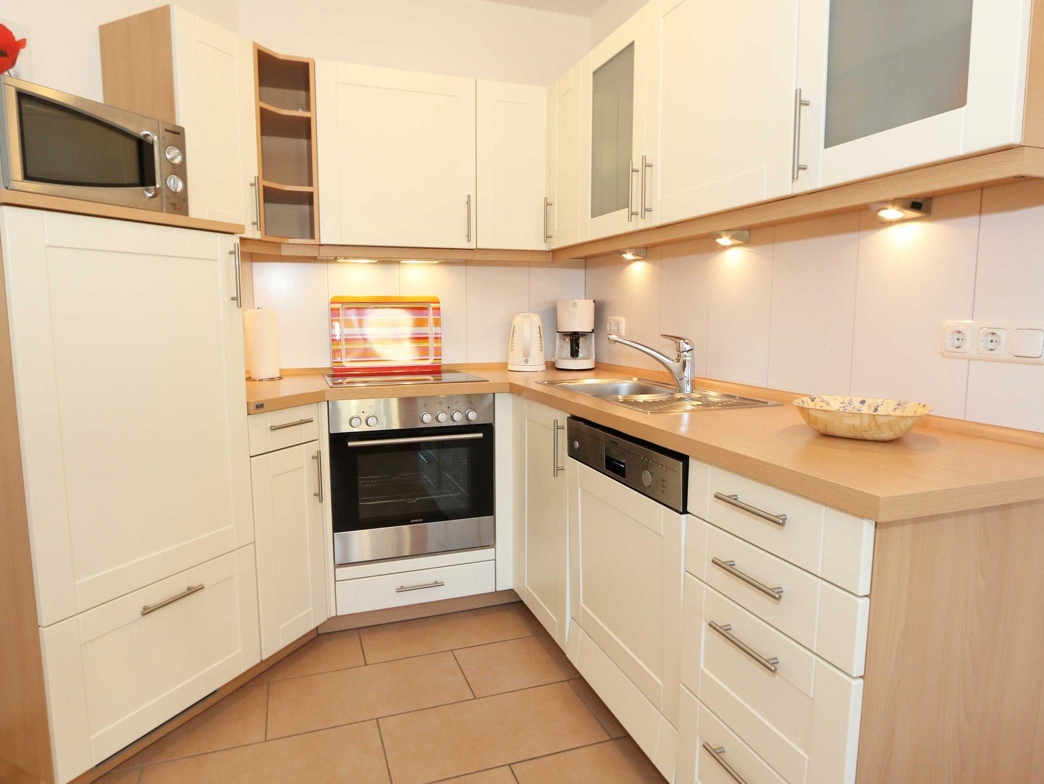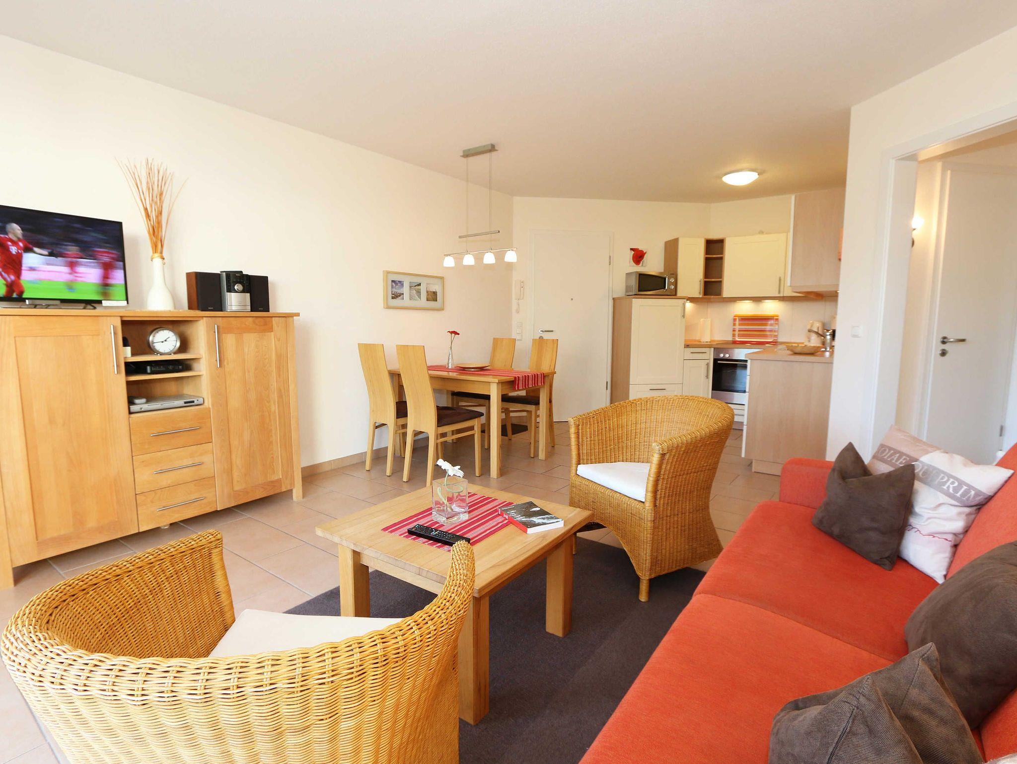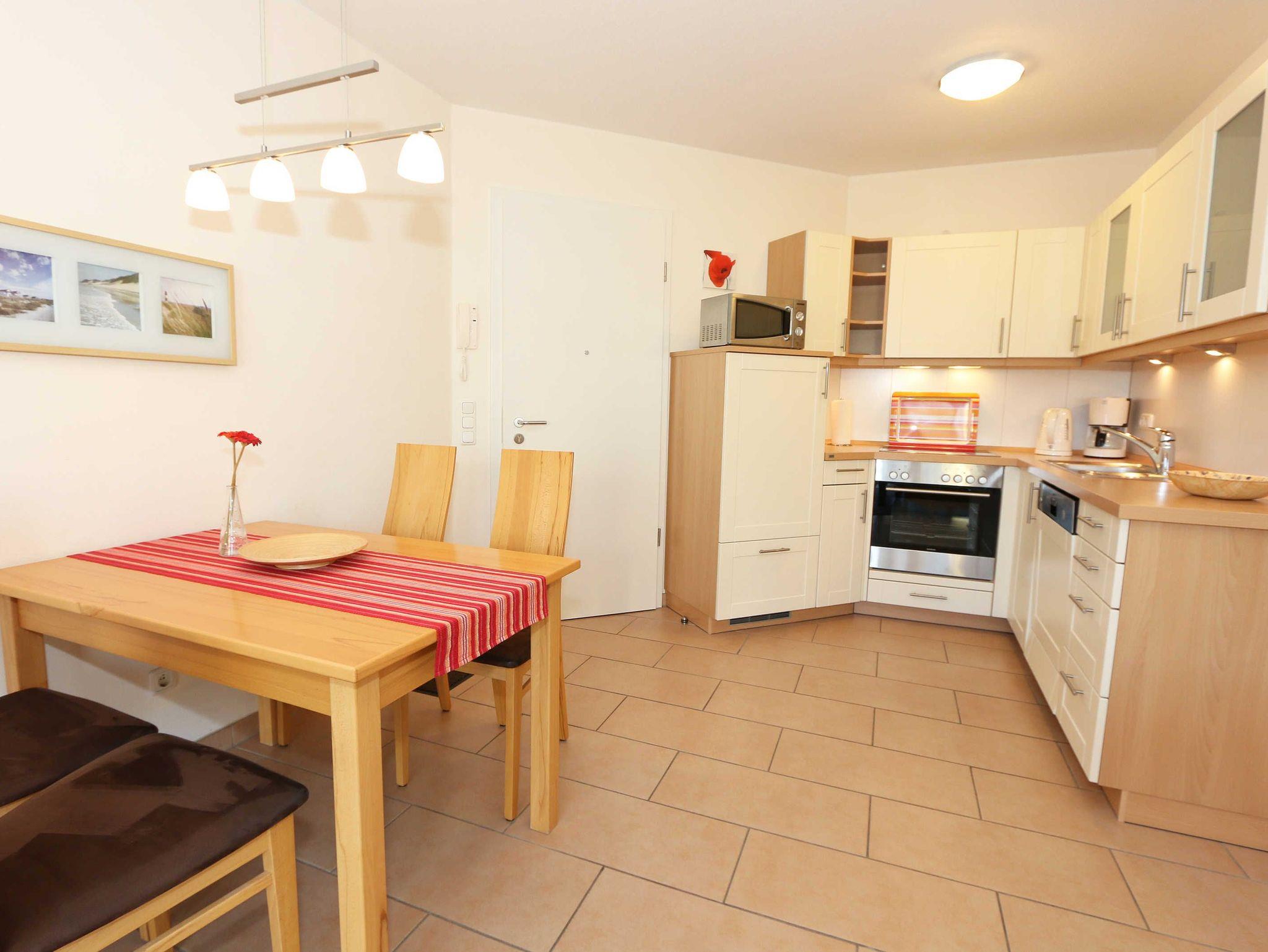 Sie wohnen in einer modern und hochwertig eingerichteten 2-Zimmer-Nichtraucherwohnung. Bei einer Wohnungsgröße von ca. 50m² haben 2 bis 4 Personen ausreichend Platz. Vom Eingangsbereich aus gelangen Sie in einen großzügigen, lichtdurchfluteten Wohn- und Essbereich. Der Wohnbereich ist mit einem Sideboard, Leselampe, Smart-TV, DVD-Player, Stereoanlage, einer gemütlichen Couch (hochwertige Ausziehfunktion mit separater Matratze 1,60 m x 2,00 m) mit Couchtisch ausgestattet. Auch auf einen Internetanschluss (WLAN) müssen Sie im Urlaub nicht verzichten. Dieser ist für unsere Gäste inklusive! Die komplett ausgestattete Küchenzeile wird durch einen Geschirrspüler, Backofen, Mikrowelle, Kühlschrank mit Gefrierfach, Kaffeemaschine, Toaster, Wasserkocher, Eierkocher, kleine Küchenutensilien sowie durch eine Essgruppe mit 4 Stühlen abgerundet. Angrenzend liegt das Schlafzimmer mit einem Doppelbett (1,80m x 2,00m, 7 Zonen-Kaltschaummatratze), verstellbare Lattenroste, einem geräumigen Kleiderschrank, Insektenschutzgitter, LCD-TV und zusätzlicher Kommode. Für einen ruhigen Schlaf können Sie den Raum abdunkeln. Das Badezimmer ist mit Dusche, Waschtisch, WC, Kosmetikspiegel, Fön, Insektenschutzgitter und beheizbaren Handtuchhalter/Fußbodenheizung sowie einem Einbauradio ausgestattet. Im separaten Abstellraum finden Sie einen Wäscheständer, Bügeleisen sowie ein Bügelbrett, Reinigungsutensilien und ein Schuhschrank. Auf der teilweisen überdachten Terrasse (Osten), die sowohl vom Wohnbereich wie auch vom Schlafzimmer erreichbar ist, befindet sich eine Sitzgruppe und eine Sonnenliege. Hier können Sie den angrenzenden Garten von ca. 60m² frei nutzen. Haustiere sind nicht erlaubt. Für unsere kleinen Gäste steht Ihnen ein Kinderreisebett (ohne Matratze, ohne Bettinlett) inklusive zur Verfügung. Einen PKW-Stellplatz (Nr.1, Einfahrtshöhe 2,10m) finden Sie in der Tiefgarage des Hauses. Ihre geliehenen oder auch mitgebrachten Fahrräder können Sie im eigenen abschließbaren Kellerraum unterstellen. Im Gemeinschaftskeller können Sie gegen einen Aufpreis die gemeinschaftliche Waschmaschine und den Trockner nutzen. Die Wertmarken können Sie auf Nachfrage während Ihres Urlaubes erwerben. Die Erstausstattung eines Wäschepaketes (komplette Bettwäsche, 1 Duschhandtuch, 1 kleines Handtuch) können Sie bis 14 Tage vor Anreise gegen einen Aufpreis dazu buchen oder durch eigene ergänzen. Ab 2 gebuchten Paketen erhalten Sie einmalig 1 Geschirrhandtuch und 1 Duschvorleger hinzu.