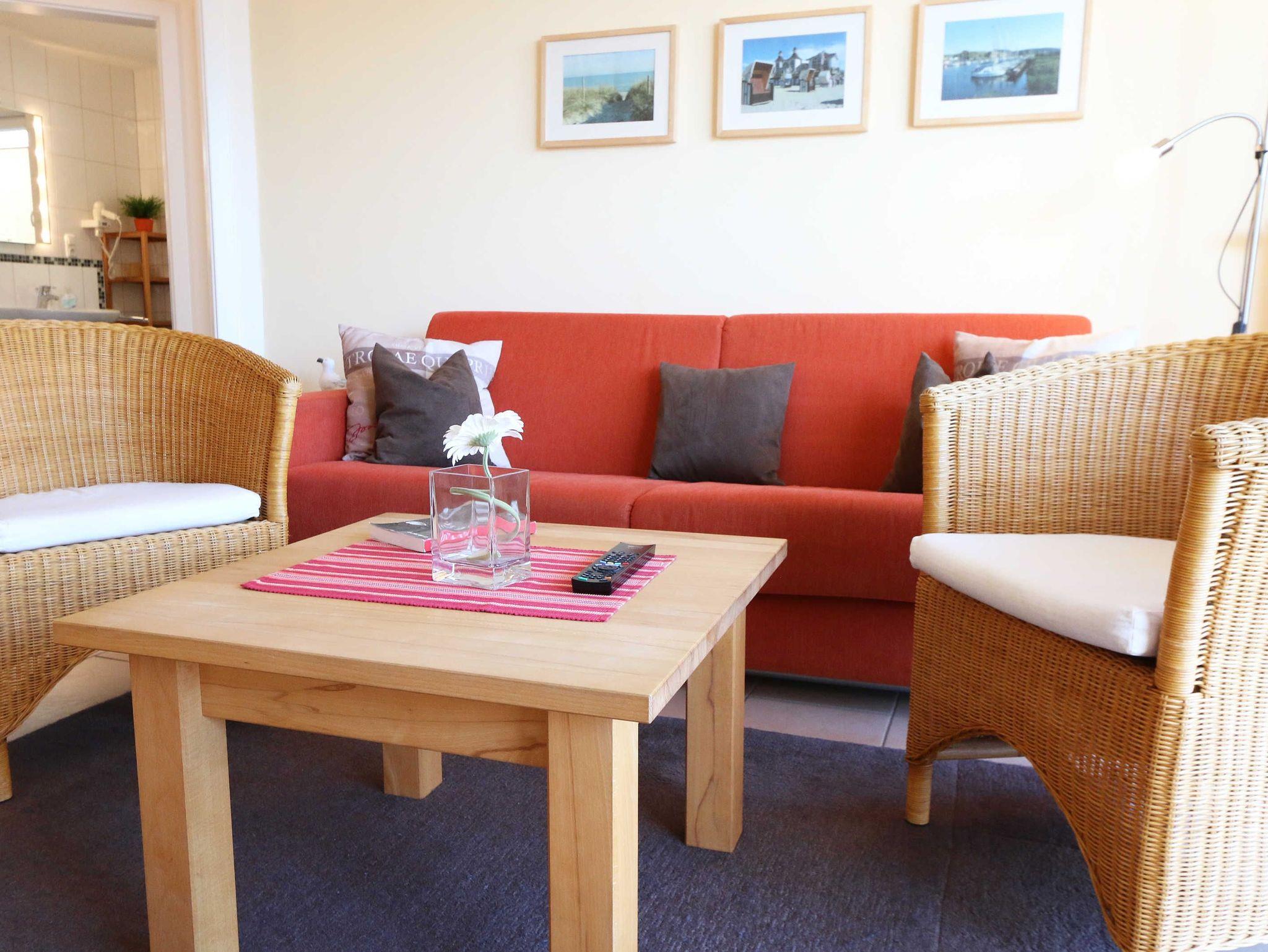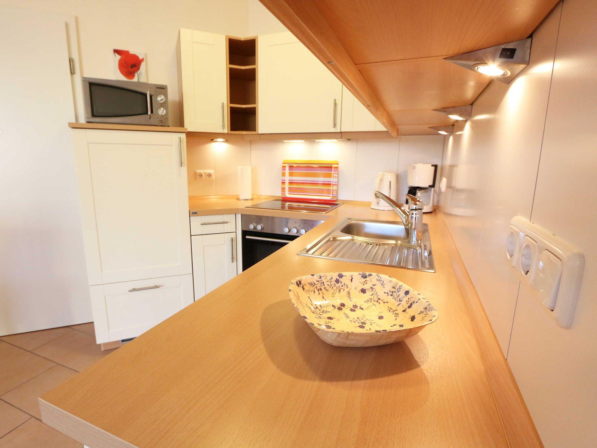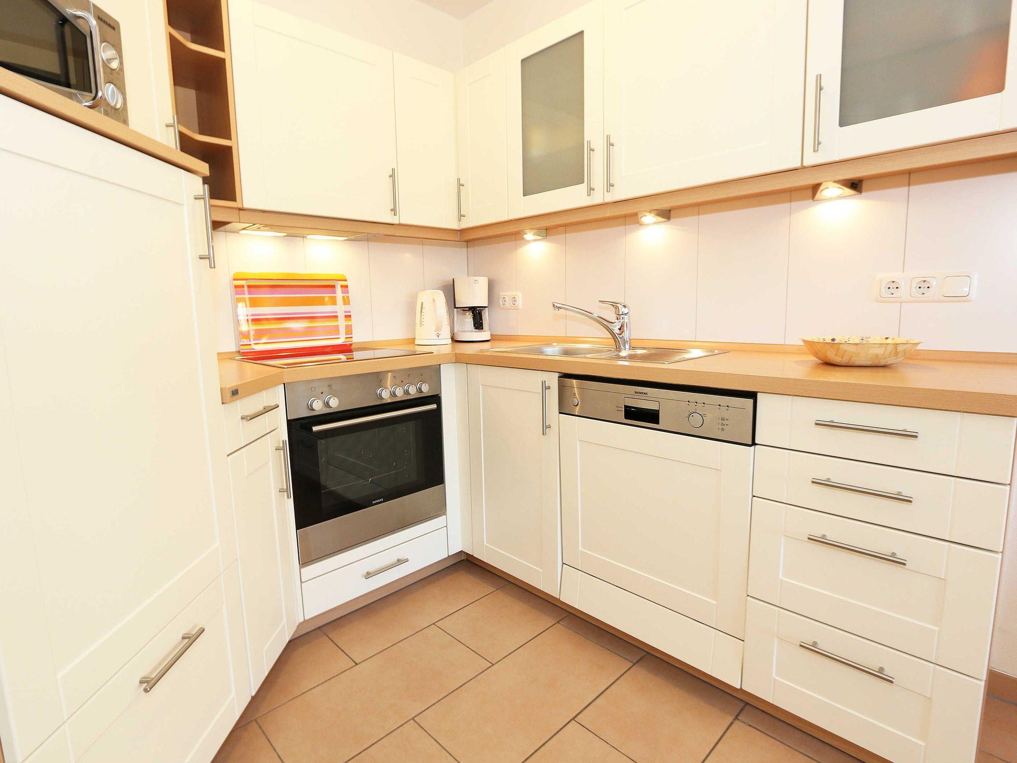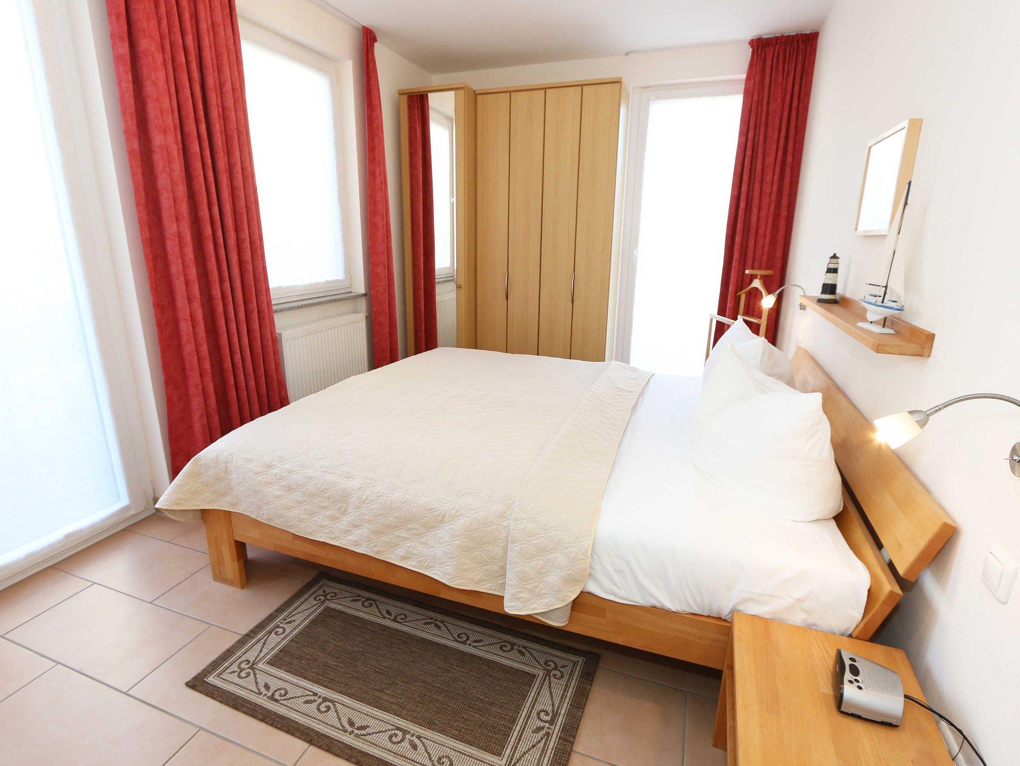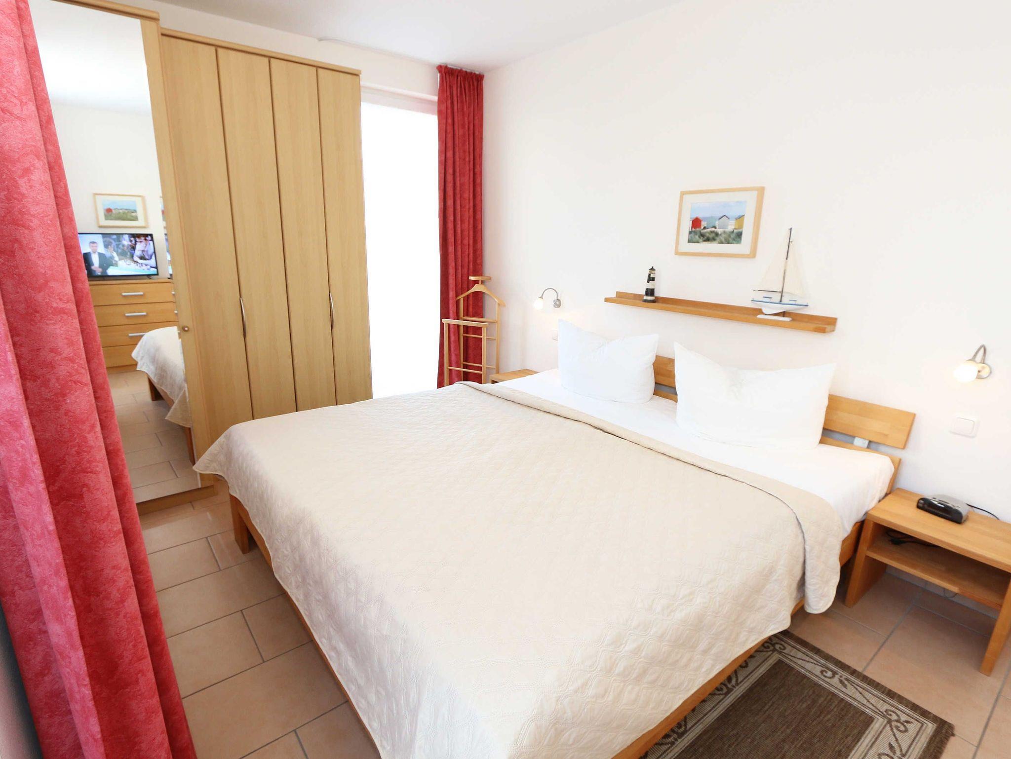 Sie wohnen in einer modern und hochwertig eingerichteten 2-Zimmer-Nichtraucherwohnung. Bei einer Wohnungsgröße von ca. 50m² haben 2 bis 4 Personen ausreichend Platz. Vom Eingangsbereich aus gelangen Sie in einen großzügigen, lichtdurchfluteten Wohn- und Essbereich. Der Wohnbereich ist mit einem Sideboard, Leselampe, Smart-TV, DVD-Player, Stereoanlage, einer gemütlichen Couch (hochwertige Ausziehfunktion mit separater Matratze 1,60 m x 2,00 m) mit Couchtisch ausgestattet. Auch auf einen Internetanschluss (WLAN) müssen Sie im Urlaub nicht verzichten. Dieser ist für unsere Gäste inklusive! Die komplett ausgestattete Küchenzeile wird durch einen Geschirrspüler, Backofen, Mikrowelle, Kühlschrank mit Gefrierfach, Kaffeemaschine, Toaster, Wasserkocher, Eierkocher, kleine Küchenutensilien sowie durch eine Essgruppe mit 4 Stühlen abgerundet. Angrenzend liegt das Schlafzimmer mit einem Doppelbett (1,80m x 2,00m, 7 Zonen-Kaltschaummatratze), verstellbare Lattenroste, einem geräumigen Kleiderschrank, Insektenschutzgitter, LCD-TV und zusätzlicher Kommode. Für einen ruhigen Schlaf können Sie den Raum abdunkeln. Das Badezimmer ist mit Dusche, Waschtisch, WC, Kosmetikspiegel, Fön, Insektenschutzgitter und beheizbaren Handtuchhalter/Fußbodenheizung sowie einem Einbauradio ausgestattet. Im separaten Abstellraum finden Sie einen Wäscheständer, Bügeleisen sowie ein Bügelbrett, Reinigungsutensilien und ein Schuhschrank. Auf der teilweisen überdachten Terrasse (Osten), die sowohl vom Wohnbereich wie auch vom Schlafzimmer erreichbar ist, befindet sich eine Sitzgruppe und eine Sonnenliege. Hier können Sie den angrenzenden Garten von ca. 60m² frei nutzen. Haustiere sind nicht erlaubt. Für unsere kleinen Gäste steht Ihnen ein Kinderreisebett (ohne Matratze, ohne Bettinlett) inklusive zur Verfügung. Einen PKW-Stellplatz (Nr.1, Einfahrtshöhe 2,10m) finden Sie in der Tiefgarage des Hauses. Ihre geliehenen oder auch mitgebrachten Fahrräder können Sie im eigenen abschließbaren Kellerraum unterstellen. Im Gemeinschaftskeller können Sie gegen einen Aufpreis die gemeinschaftliche Waschmaschine und den Trockner nutzen. Die Wertmarken können Sie auf Nachfrage während Ihres Urlaubes erwerben. Die Erstausstattung eines Wäschepaketes (komplette Bettwäsche, 1 Duschhandtuch, 1 kleines Handtuch) können Sie bis 14 Tage vor Anreise gegen einen Aufpreis dazu buchen oder durch eigene ergänzen. Ab 2 gebuchten Paketen erhalten Sie einmalig 1 Geschirrhandtuch und 1 Duschvorleger hinzu.