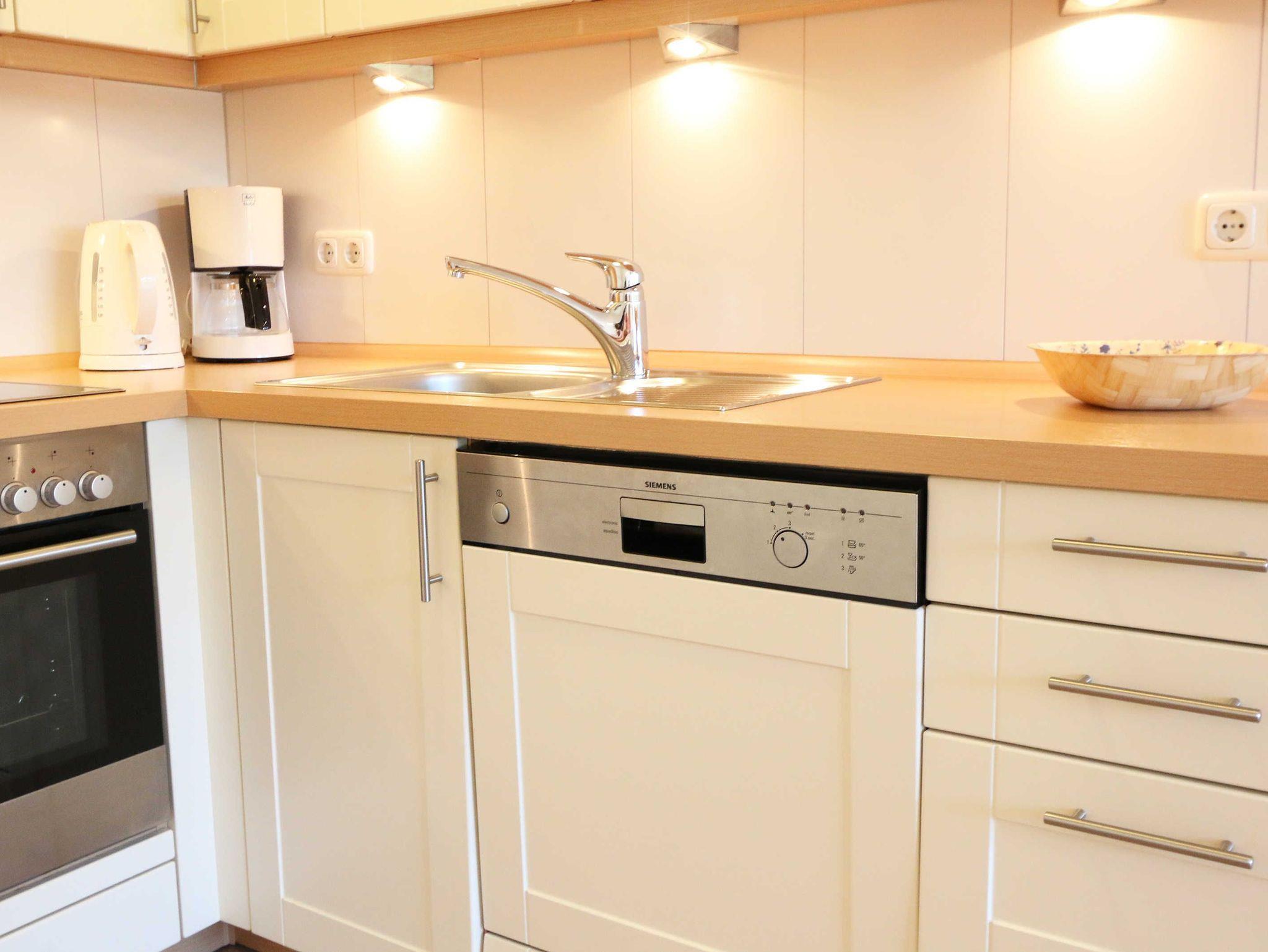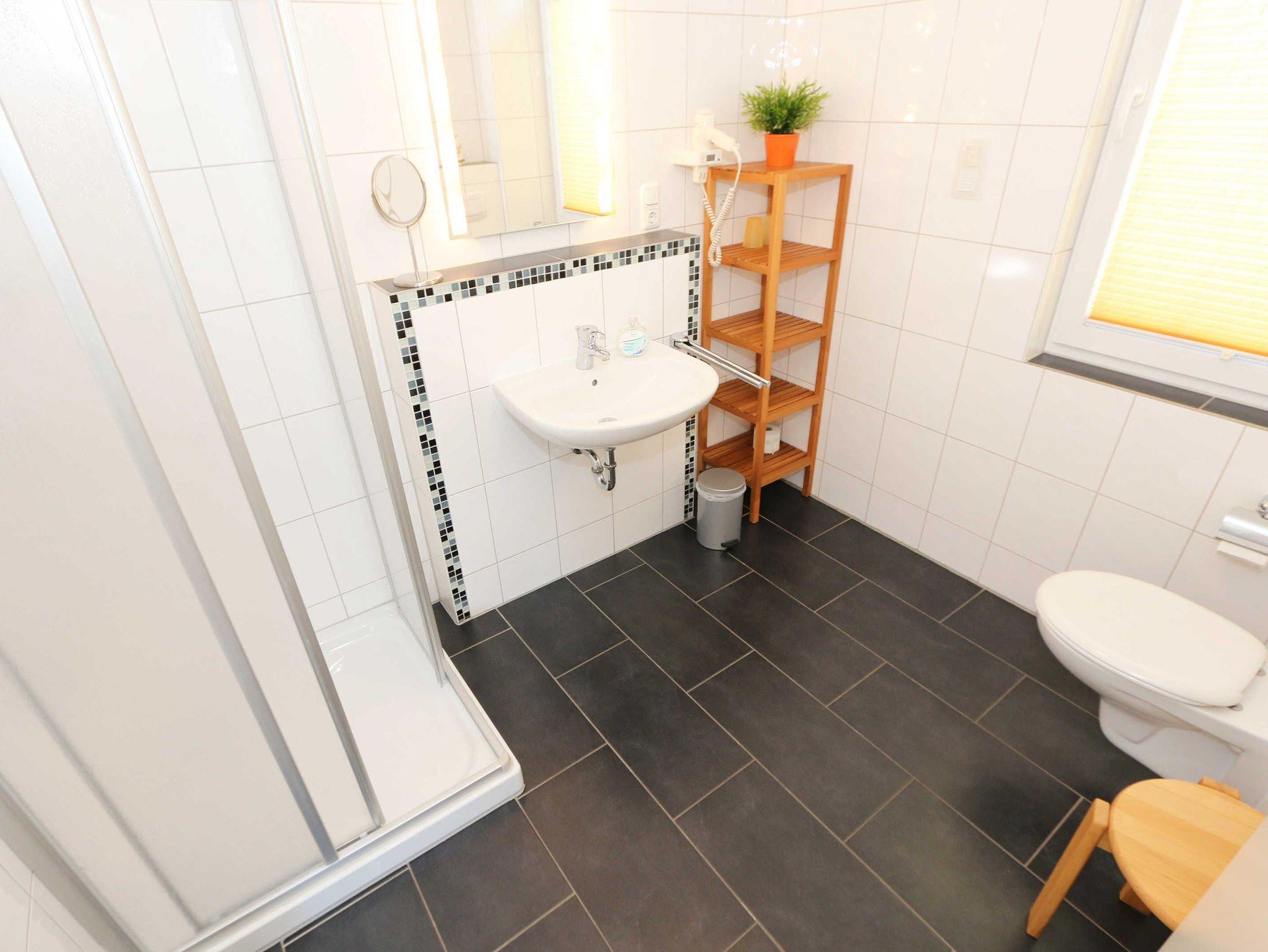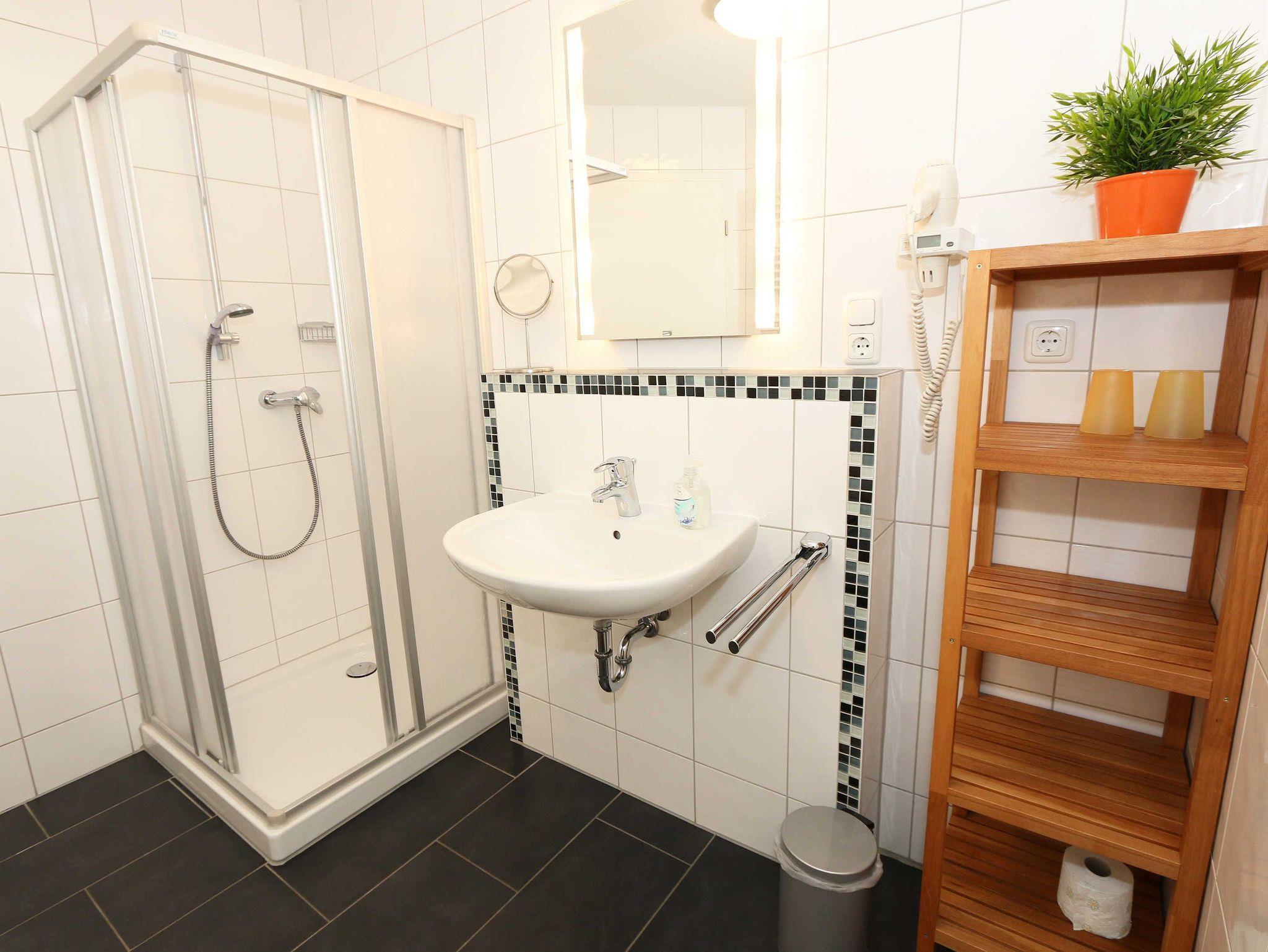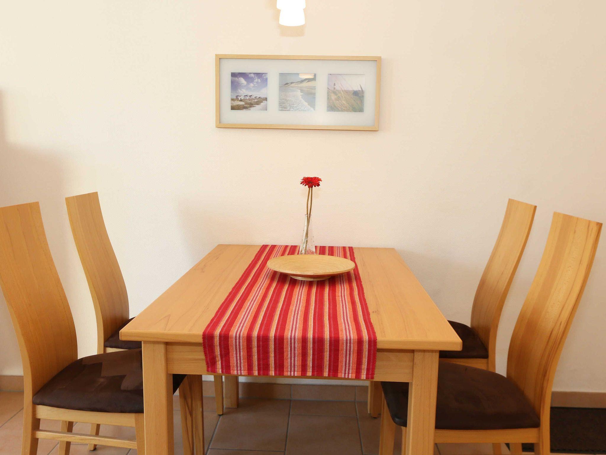 Sie wohnen in einer modern und hochwertig eingerichteten 2-Zimmer-Nichtraucherwohnung. Bei einer Wohnungsgröße von ca. 50m² haben 2 bis 4 Personen ausreichend Platz. Vom Eingangsbereich aus gelangen Sie in einen großzügigen, lichtdurchfluteten Wohn- und Essbereich. Der Wohnbereich ist mit einem Sideboard, Leselampe, Smart-TV, DVD-Player, Stereoanlage, einer gemütlichen Couch (hochwertige Ausziehfunktion mit separater Matratze 1,60 m x 2,00 m) mit Couchtisch ausgestattet. Auch auf einen Internetanschluss (WLAN) müssen Sie im Urlaub nicht verzichten. Dieser ist für unsere Gäste inklusive! Die komplett ausgestattete Küchenzeile wird durch einen Geschirrspüler, Backofen, Mikrowelle, Kühlschrank mit Gefrierfach, Kaffeemaschine, Toaster, Wasserkocher, Eierkocher, kleine Küchenutensilien sowie durch eine Essgruppe mit 4 Stühlen abgerundet. Angrenzend liegt das Schlafzimmer mit einem Doppelbett (1,80m x 2,00m, 7 Zonen-Kaltschaummatratze), verstellbare Lattenroste, einem geräumigen Kleiderschrank, Insektenschutzgitter, LCD-TV und zusätzlicher Kommode. Für einen ruhigen Schlaf können Sie den Raum abdunkeln. Das Badezimmer ist mit Dusche, Waschtisch, WC, Kosmetikspiegel, Fön, Insektenschutzgitter und beheizbaren Handtuchhalter/Fußbodenheizung sowie einem Einbauradio ausgestattet. Im separaten Abstellraum finden Sie einen Wäscheständer, Bügeleisen sowie ein Bügelbrett, Reinigungsutensilien und ein Schuhschrank. Auf der teilweisen überdachten Terrasse (Osten), die sowohl vom Wohnbereich wie auch vom Schlafzimmer erreichbar ist, befindet sich eine Sitzgruppe und eine Sonnenliege. Hier können Sie den angrenzenden Garten von ca. 60m² frei nutzen. Haustiere sind nicht erlaubt. Für unsere kleinen Gäste steht Ihnen ein Kinderreisebett (ohne Matratze, ohne Bettinlett) inklusive zur Verfügung. Einen PKW-Stellplatz (Nr.1, Einfahrtshöhe 2,10m) finden Sie in der Tiefgarage des Hauses. Ihre geliehenen oder auch mitgebrachten Fahrräder können Sie im eigenen abschließbaren Kellerraum unterstellen. Im Gemeinschaftskeller können Sie gegen einen Aufpreis die gemeinschaftliche Waschmaschine und den Trockner nutzen. Die Wertmarken können Sie auf Nachfrage während Ihres Urlaubes erwerben. Die Erstausstattung eines Wäschepaketes (komplette Bettwäsche, 1 Duschhandtuch, 1 kleines Handtuch) können Sie bis 14 Tage vor Anreise gegen einen Aufpreis dazu buchen oder durch eigene ergänzen. Ab 2 gebuchten Paketen erhalten Sie einmalig 1 Geschirrhandtuch und 1 Duschvorleger hinzu.