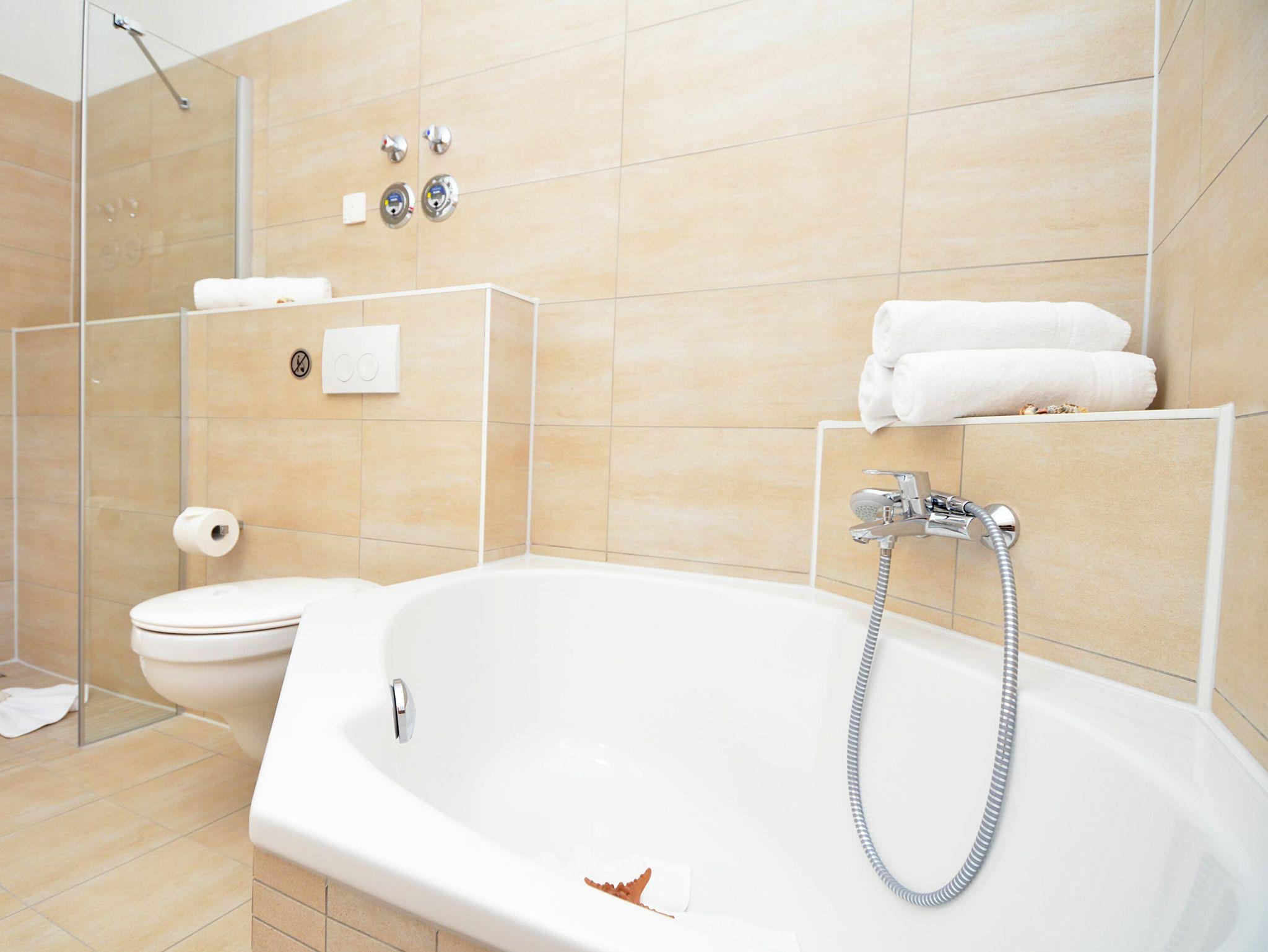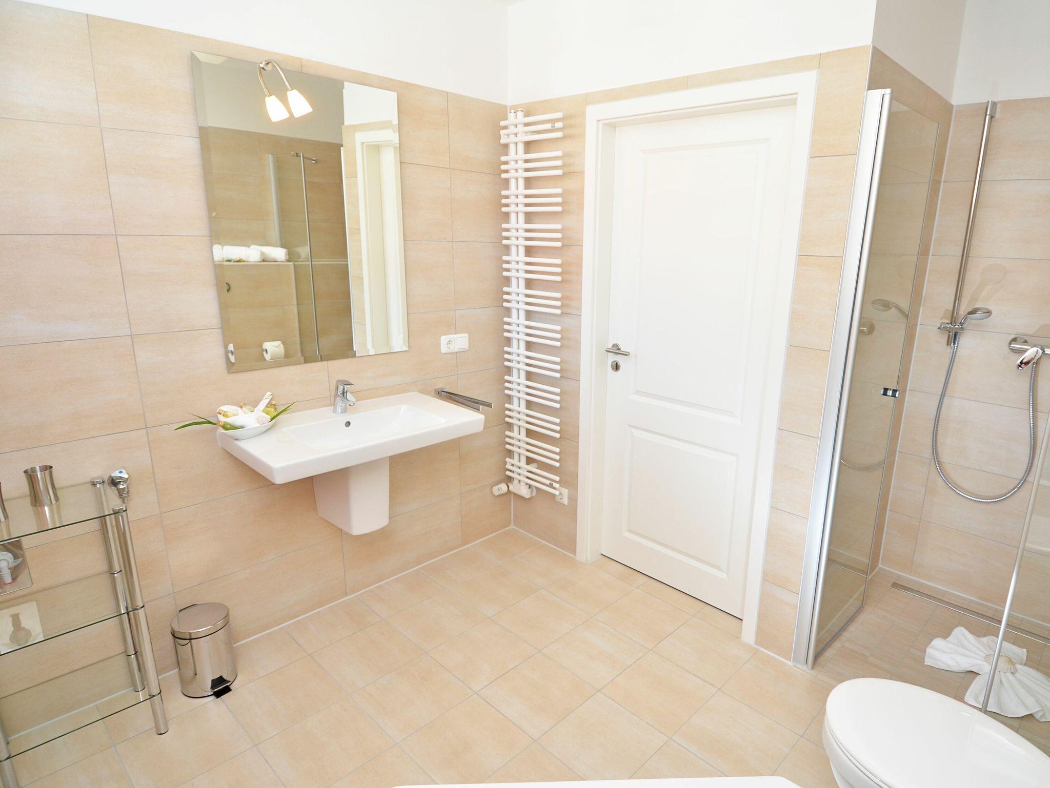 Die Wohnung verfügt über ein großes lichtdurchflutetes Badezimmer mit einer Eckbadewanne, einer bodengleichen Dusche und einem Handtuchheizkörper. Das zweite Bad ist ebenfalls mit einer bodengleichen Dusche (90x130cm) und einem Handtuchheizkörper ausgestattet. Ein Haartrockner ist ebenfalls vorhanden.