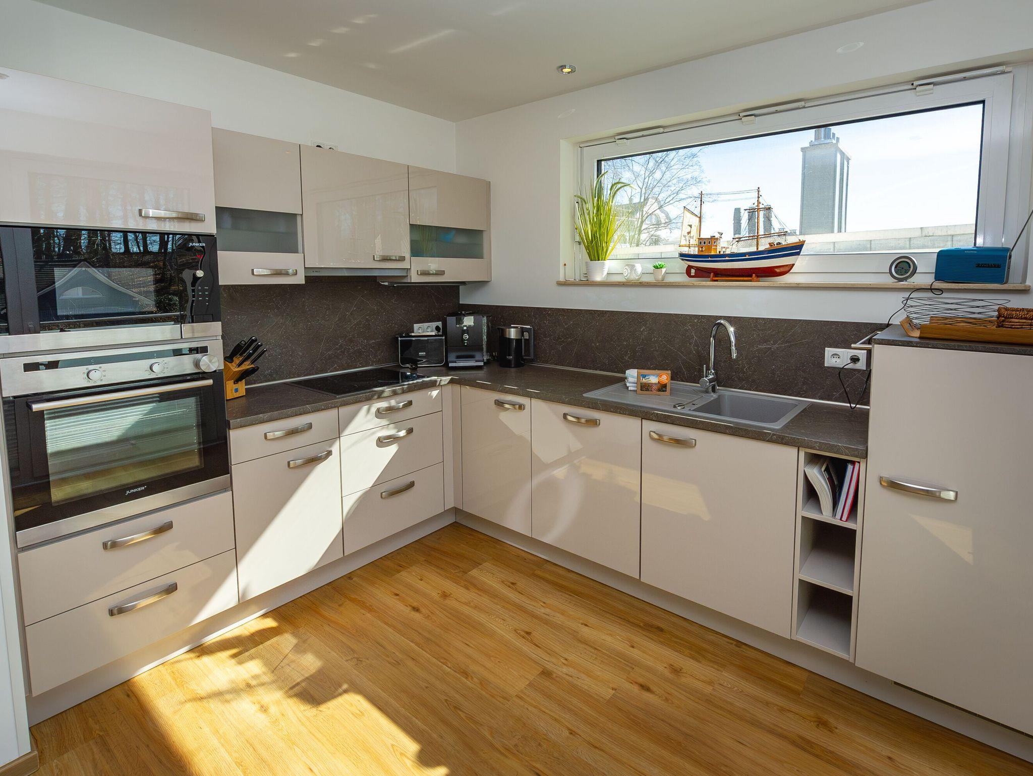 Die integrierte, exklusive Hochglanzküche verfügt u.a. über ein Cerankochfeld, eine Spülmaschine, einen ergonomisch perfekt angebrachten Backofen, einen extragroßen Kühlschrank mit 3*Frostfach, eine Mikrowelle sowie Wasserkocher, Eierkocher, Toaster und Filterkaffeemaschine. Der zusätzliche Jura-Kaffeevollautomat (inkl. Kaffee satt) zaubert Ihnen auf Wunsch die leckersten Kaffeespezialitäten. Der angrenzende große Balkon (ca. 13 qm) eignet sich sehr gut zum Frühstücken oder Sie genießen die Abendsonne mit einem Barbeque vom vorhandenen Elektrogrill.