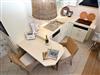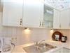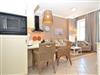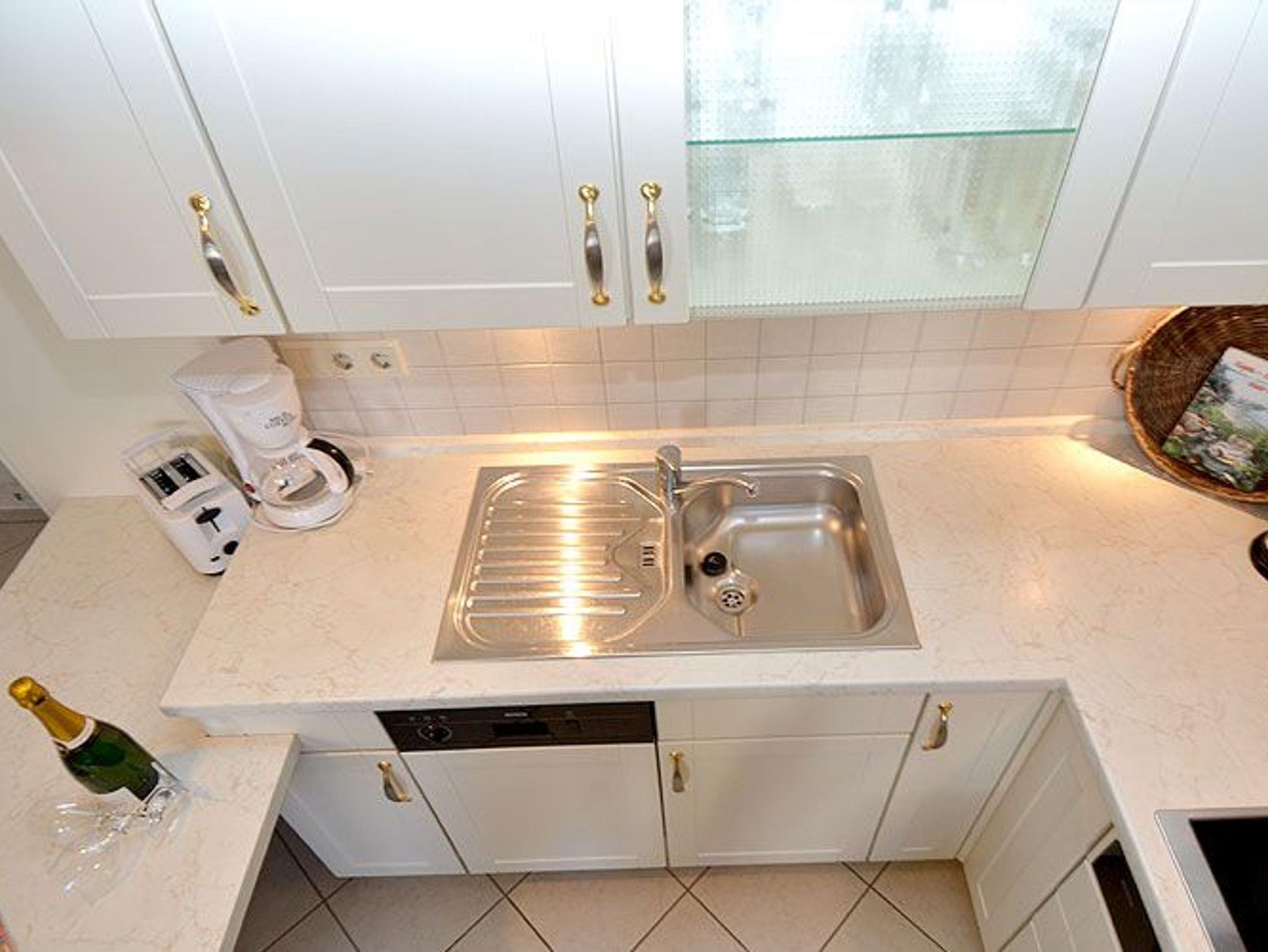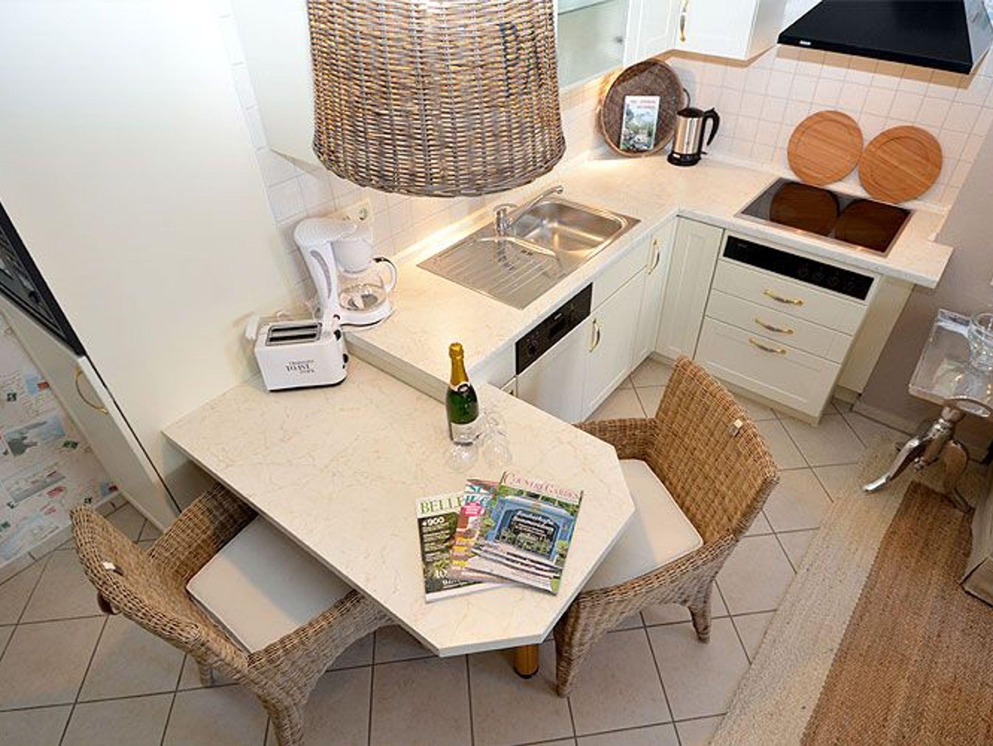 Die harmonisch im Wohnbereich integrierte Küchenzeile ist ausgestattet mit einem Kühlschrank mit Gefrierfach, einem 4-Platten-Ceranfeld, einer Spülmaschine, einer Mikrowelle mit Grillfunktion und diversem Kleininventar, das die Küchenausstattung komplettiert.