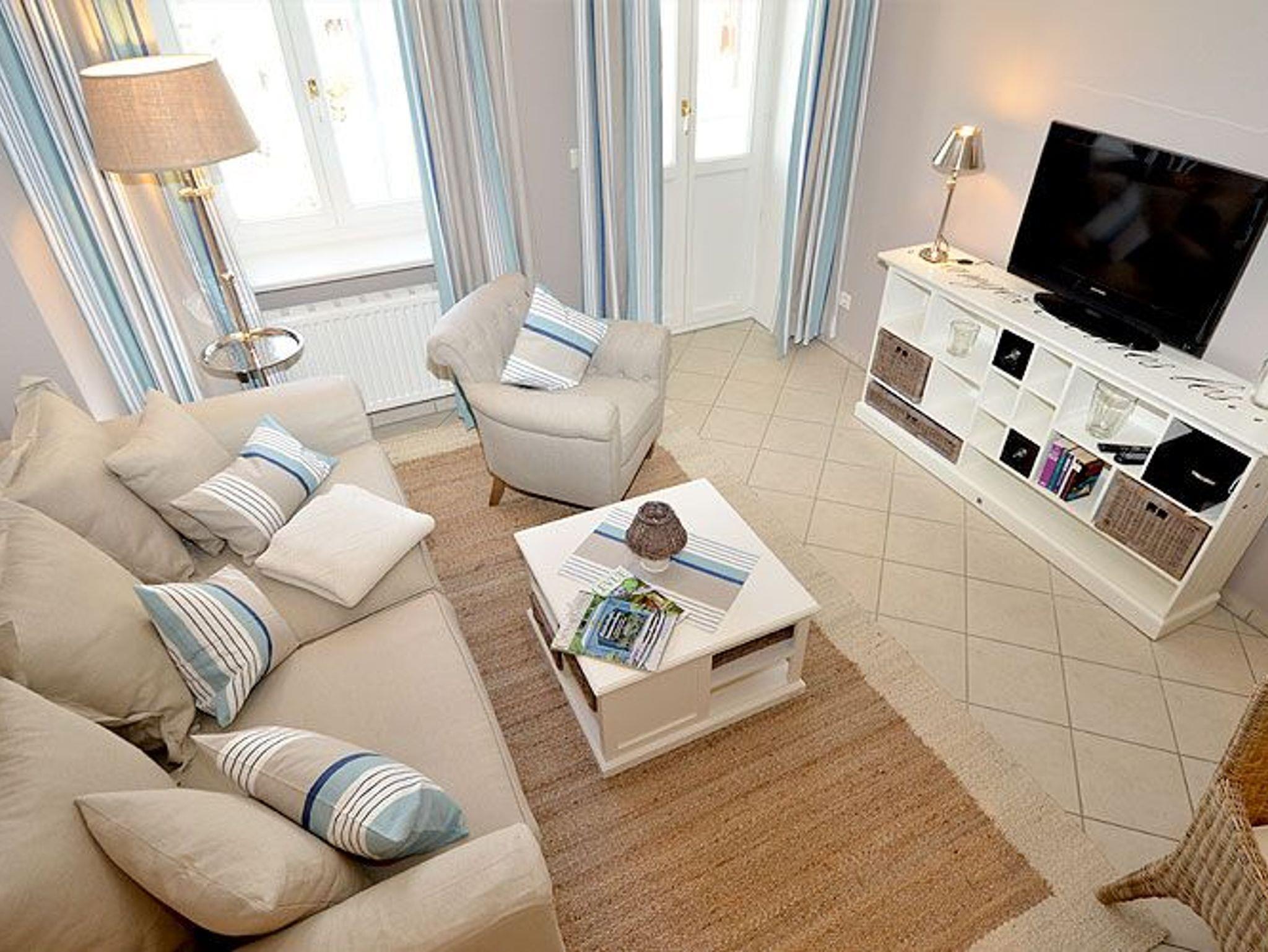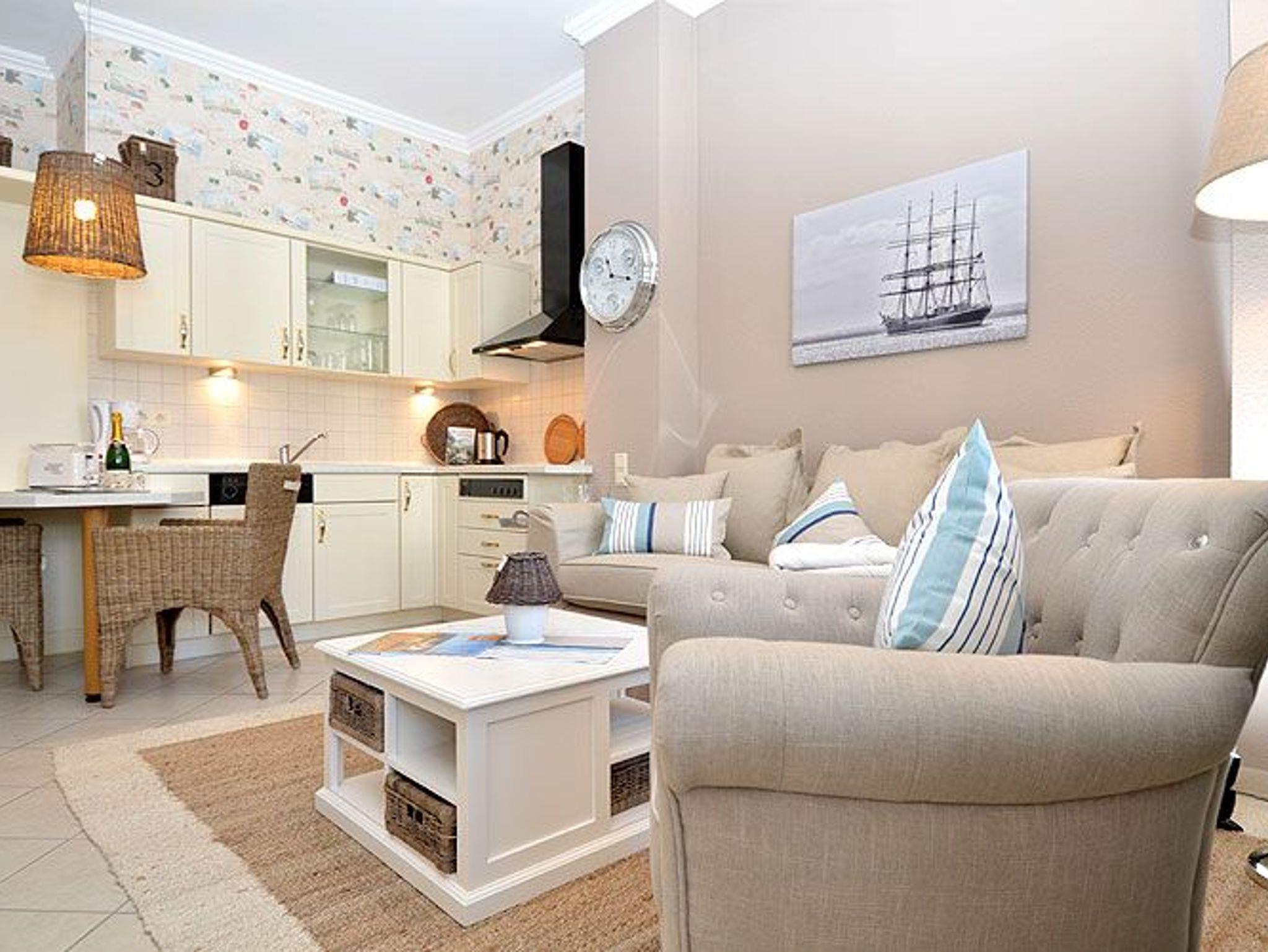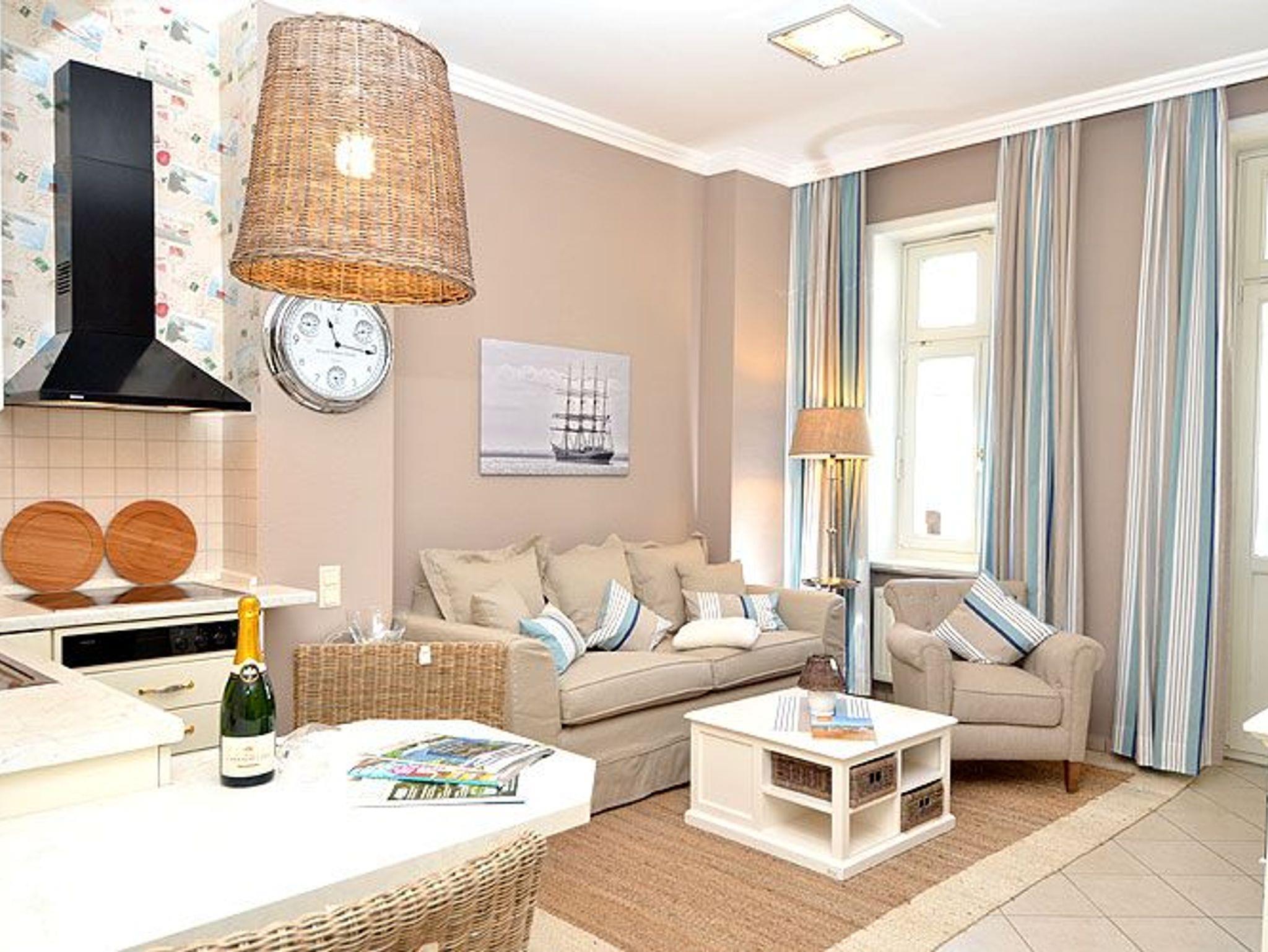 Dieses ca. 40 m² große, stilvoll eingerichtete 2-Raum-Appartement begrüßt Sie im 1. Obergeschoss und hat einen 12 m² möblierten Balkon nach Norden. Wunderschöne Landhausmöbel, ausgesuchte Stoffe und warme Erdtöne schaffen zusammen mit leicht maritimen Akzenten ein ganz einzigartiges Wohlfühlambiente. Die gesamte Nichtraucherwohnung ist gefliest bzw. mit Designerboden in Vintage-Oak-Optik versehen.