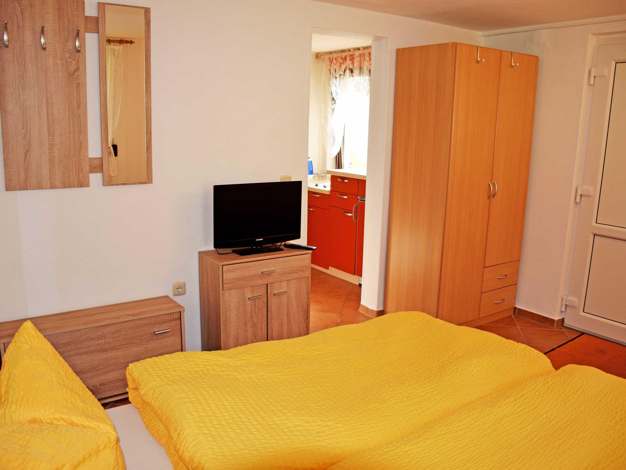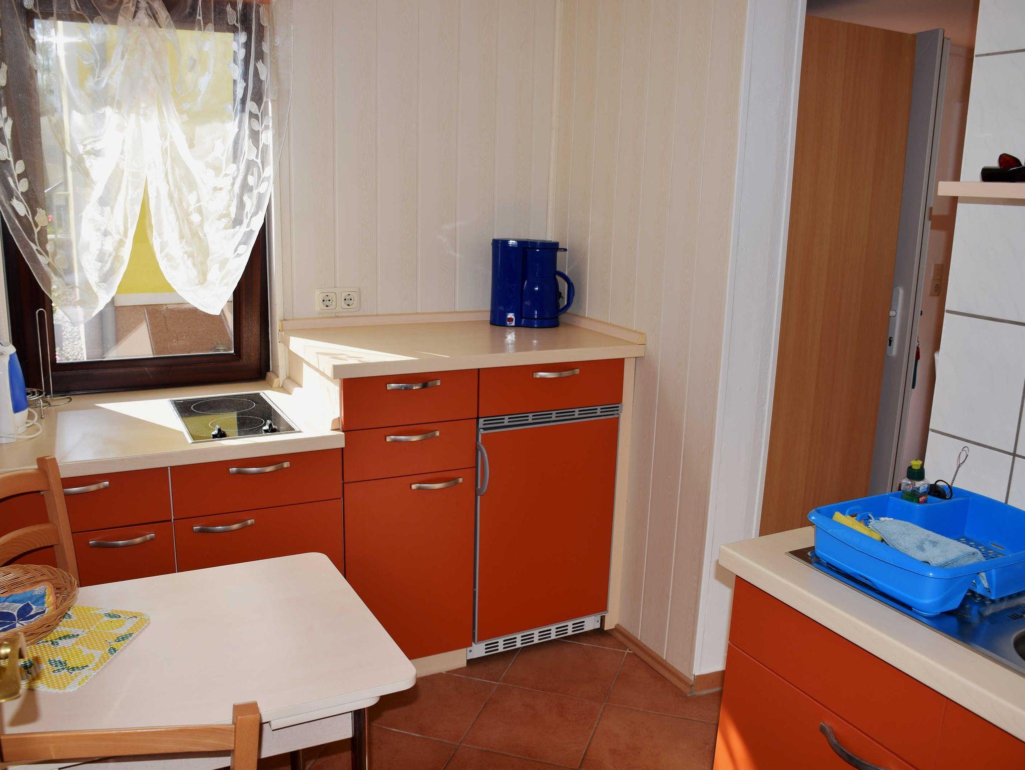 Diese kleine Ferienwohnung (23 qm) ist modern und freundlich eingerichtet und verfügt über einen separaten Wohnungseingang. Der kombinierte Wohn- und Schlafraum bietet Platz für zwei Gäste. Hier stehen ein bequemes Doppelbett mit Nachttischen und Leselampen, eine Sitzecke mit Tisch und Stühlen sowie TV und Radio. Durch die Verwendung von Holz und warmen Farben ist es uns gelungen, hier ein angenehmes Ambiente zu schaffen in dem auch Sie sich wohlfühlen werden. Selbstverständlich hat diese Ferienwohnung ein Bad mit Dusche und WC und eine kleine neu eingerichtete Küche mit Sitzecke. Zur Küchenausstattung gehören Herd, Spüle, Kühlschrank, Kaffeemaschine, Wasserkocher und Toaster.