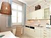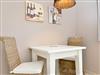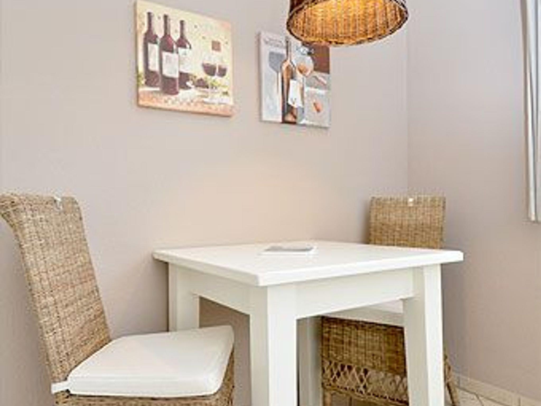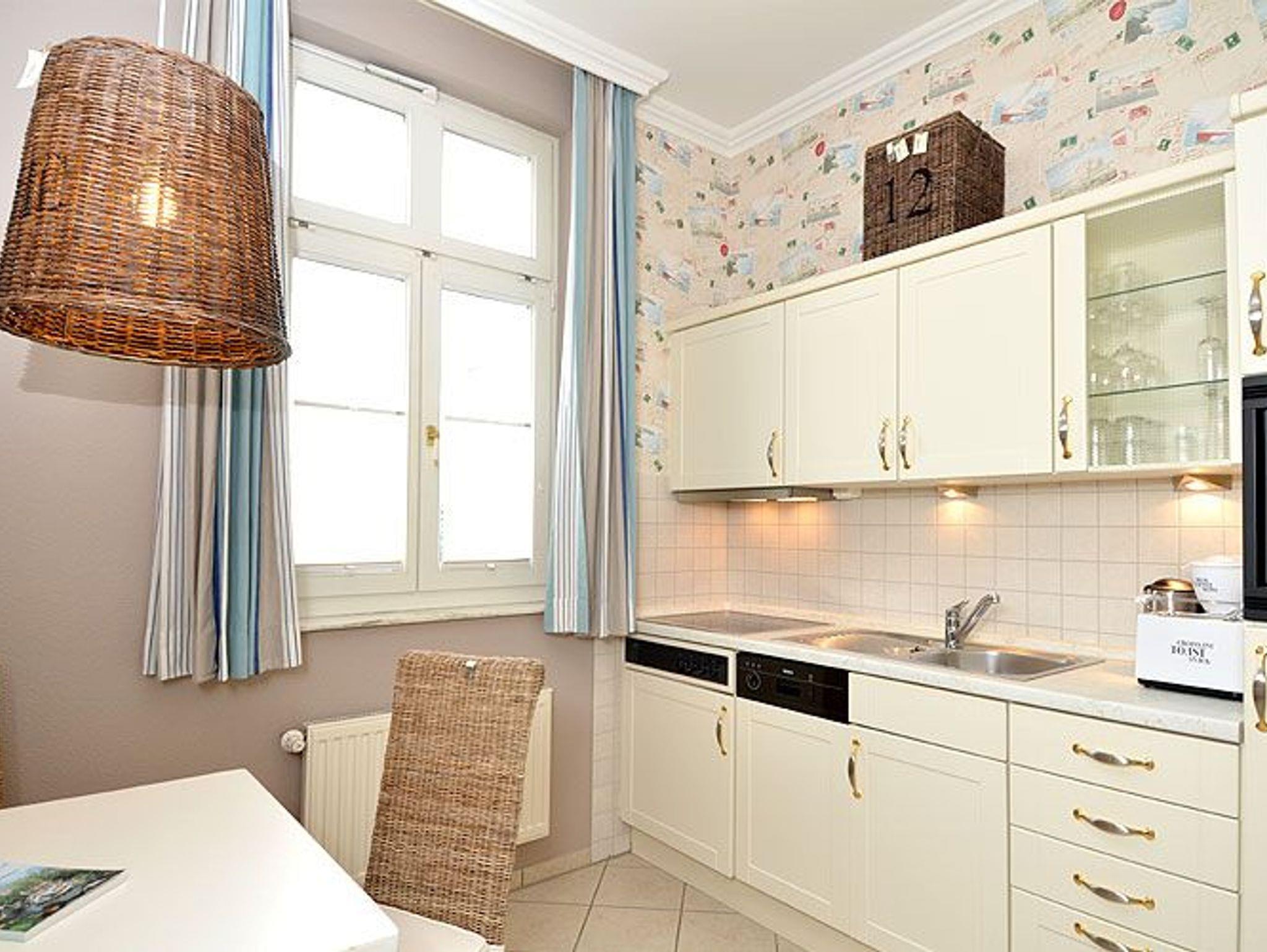 In der separaten Küche mit einem Esstisch für zwei Personen finden Sie u.a. einen Kühlschrank mit Gefrierfach, einen 4-Platten-Ceranherd, eine Spülmaschine, eine Mikrowelle mit Grillfunktion und diverses Kleininventar, das die Küchenausstattung komplettiert.