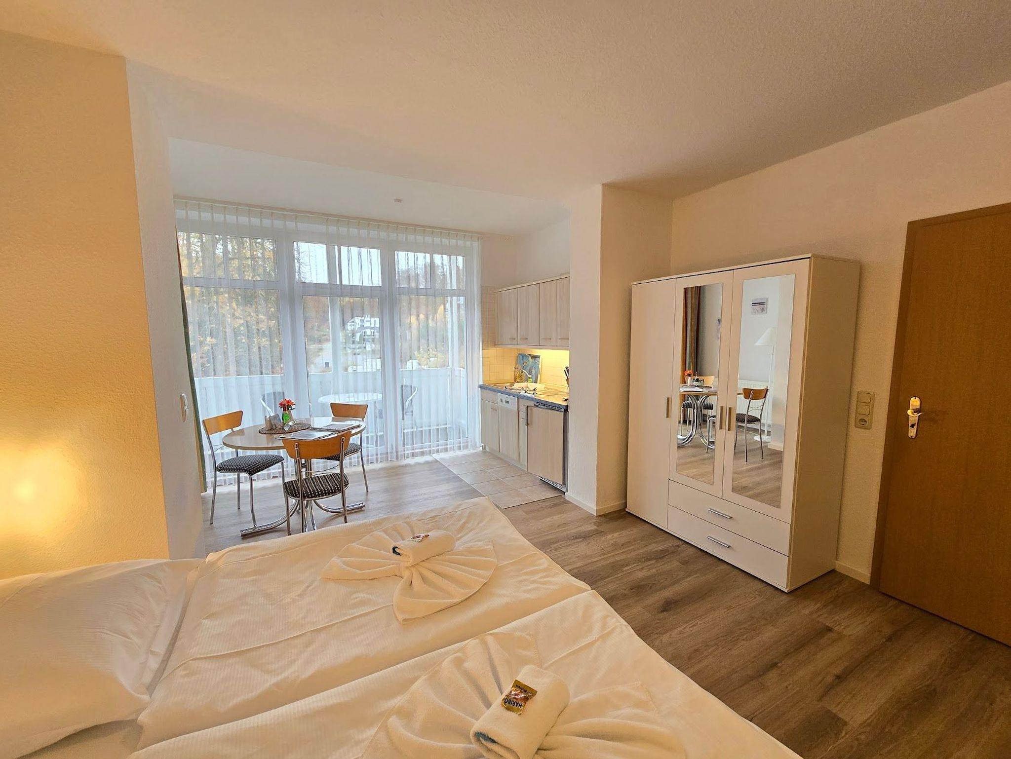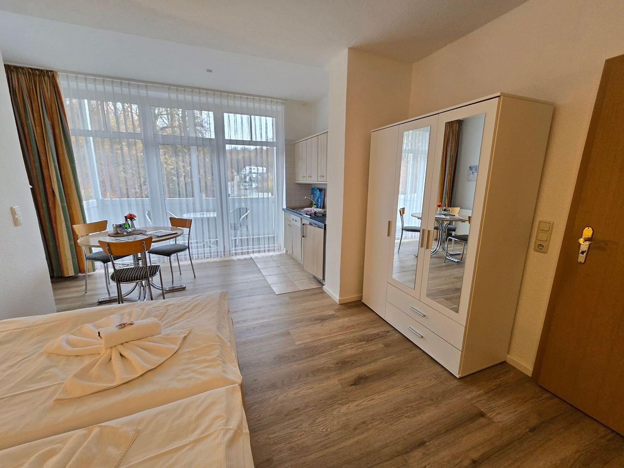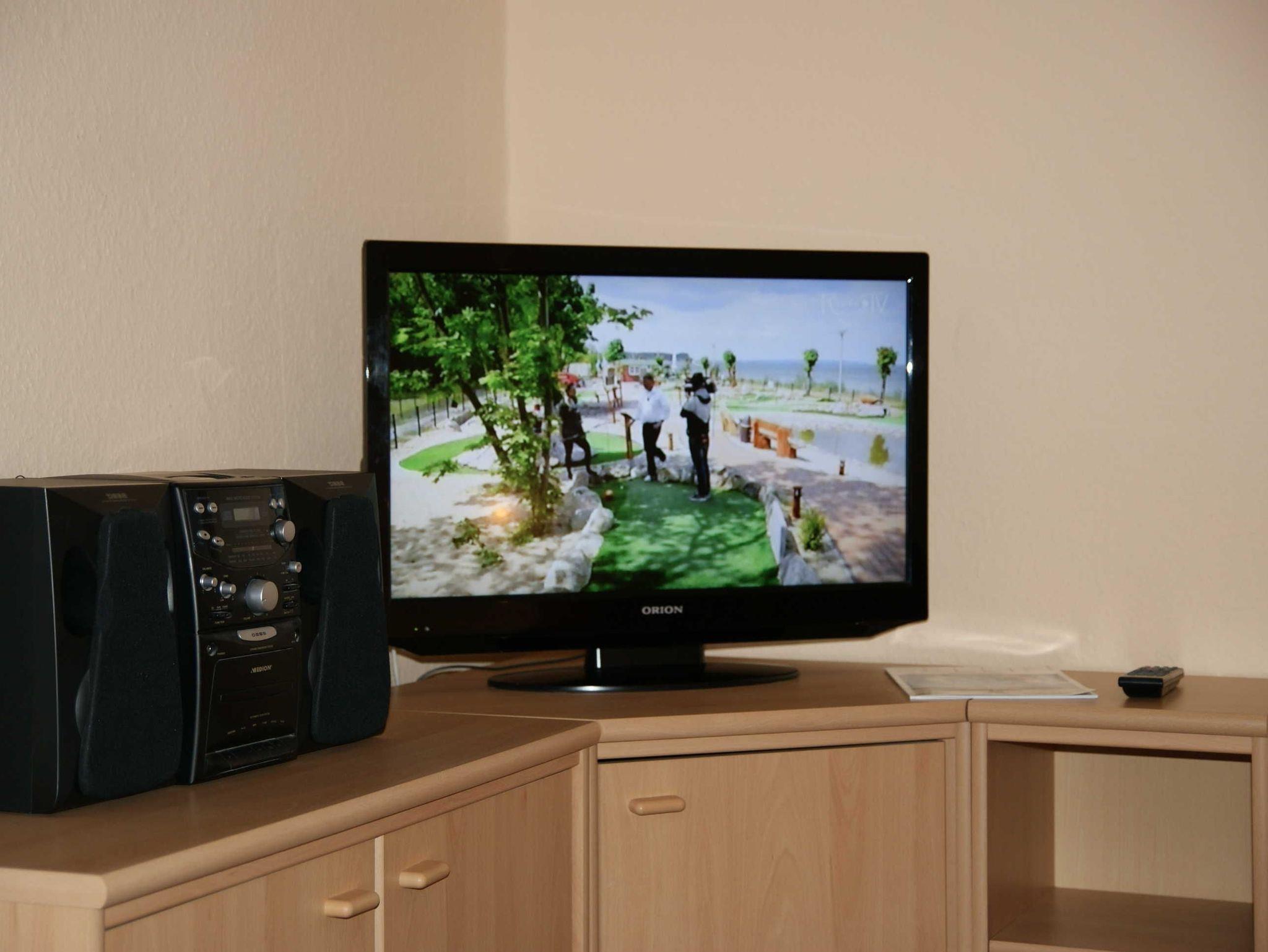 Das 1 Raumappartement hat einen Wohn-Schlafraum mit Doppelbett für 2 Pers.und einer ausziehbaren Couch, Kabel-TV,CD Stereoanlage ,Esstisch, gut ausgestattete Küchenzeile mit Geschirrspüler, Kaffeemaschine, Toaster und Microwelle. Babybett ( ohne Wäsche )und Hochstuhl für die Kleinen stellen wir zur Verfügung ( bitte vorbestellen ) .