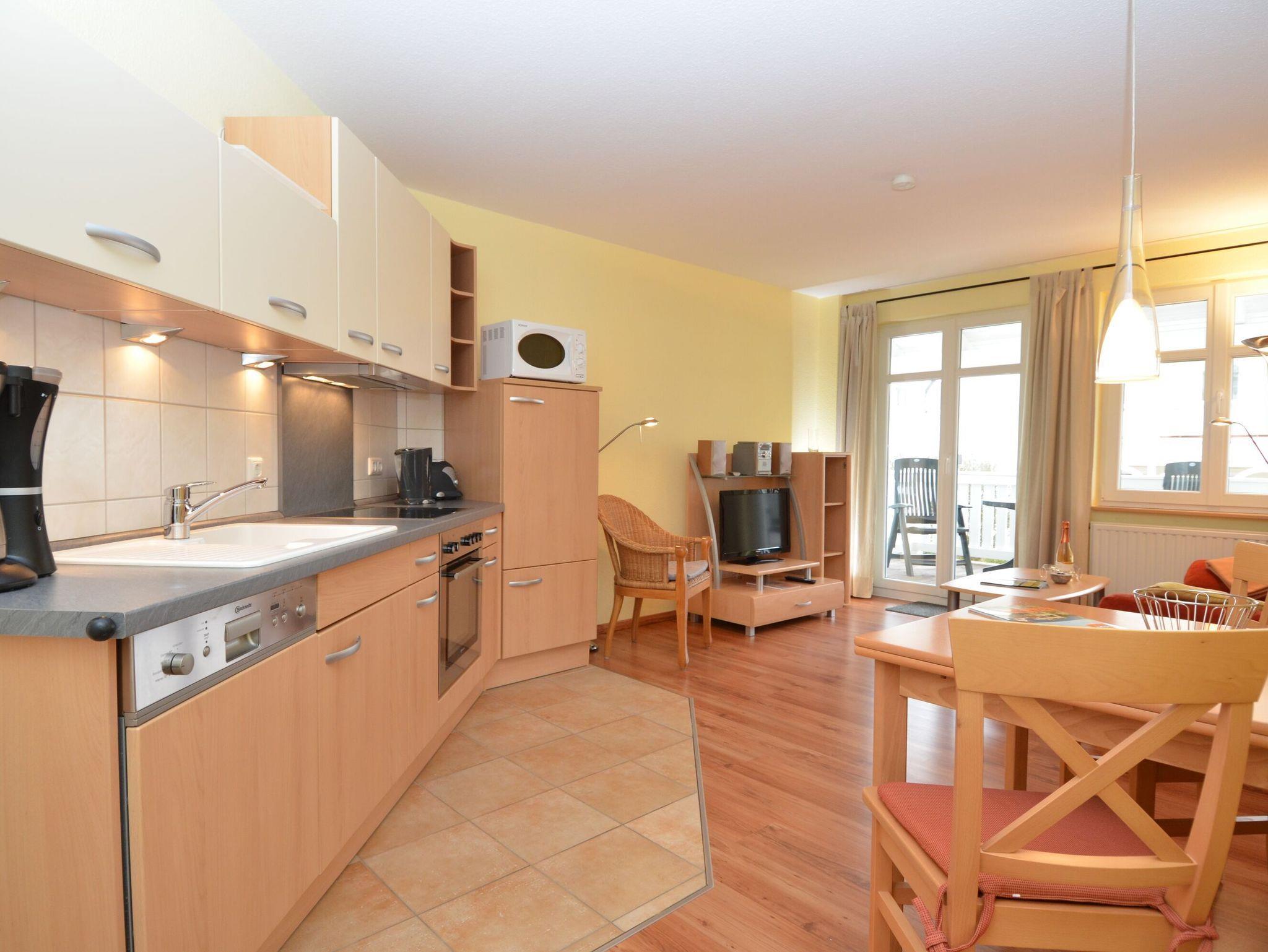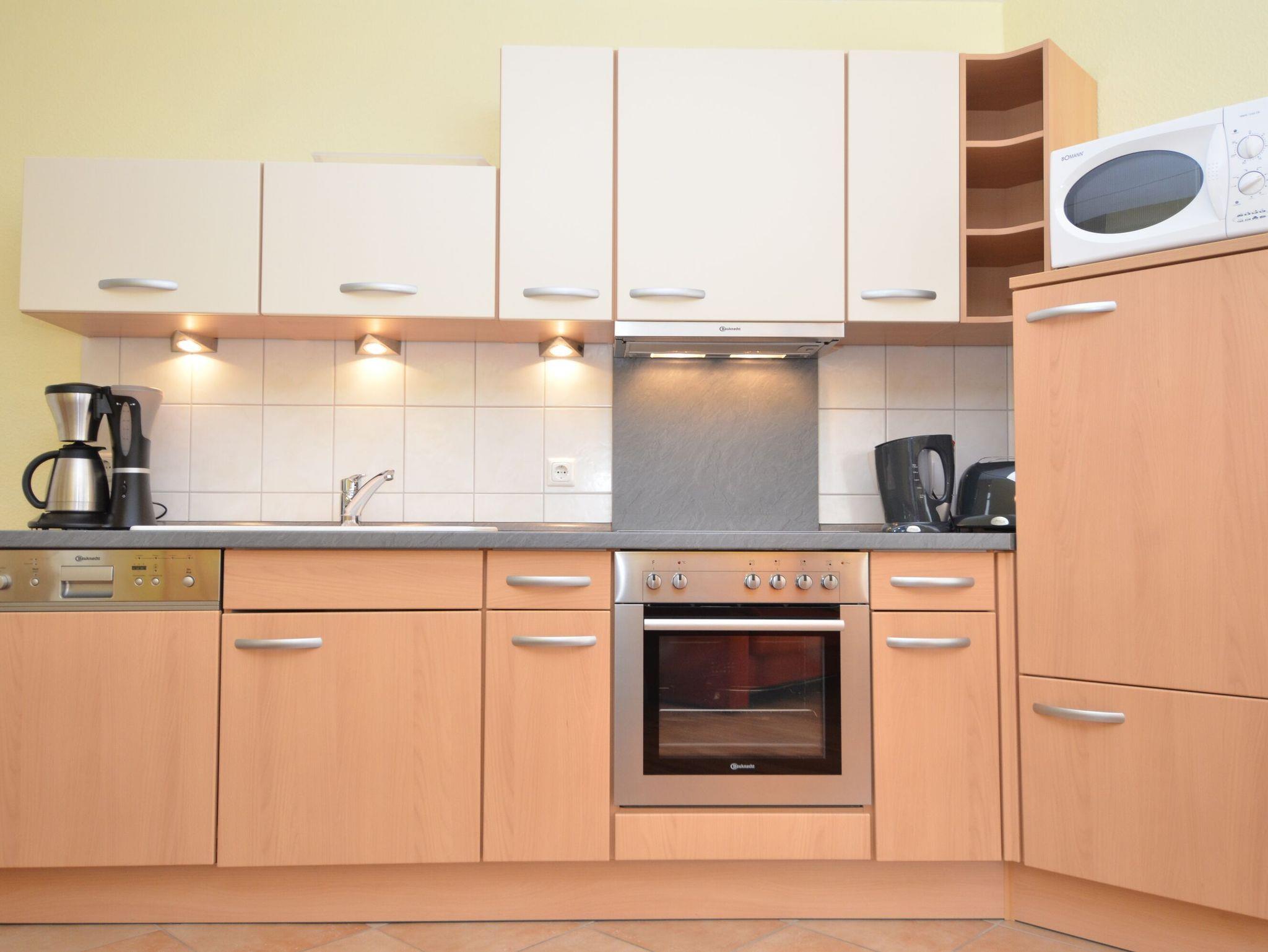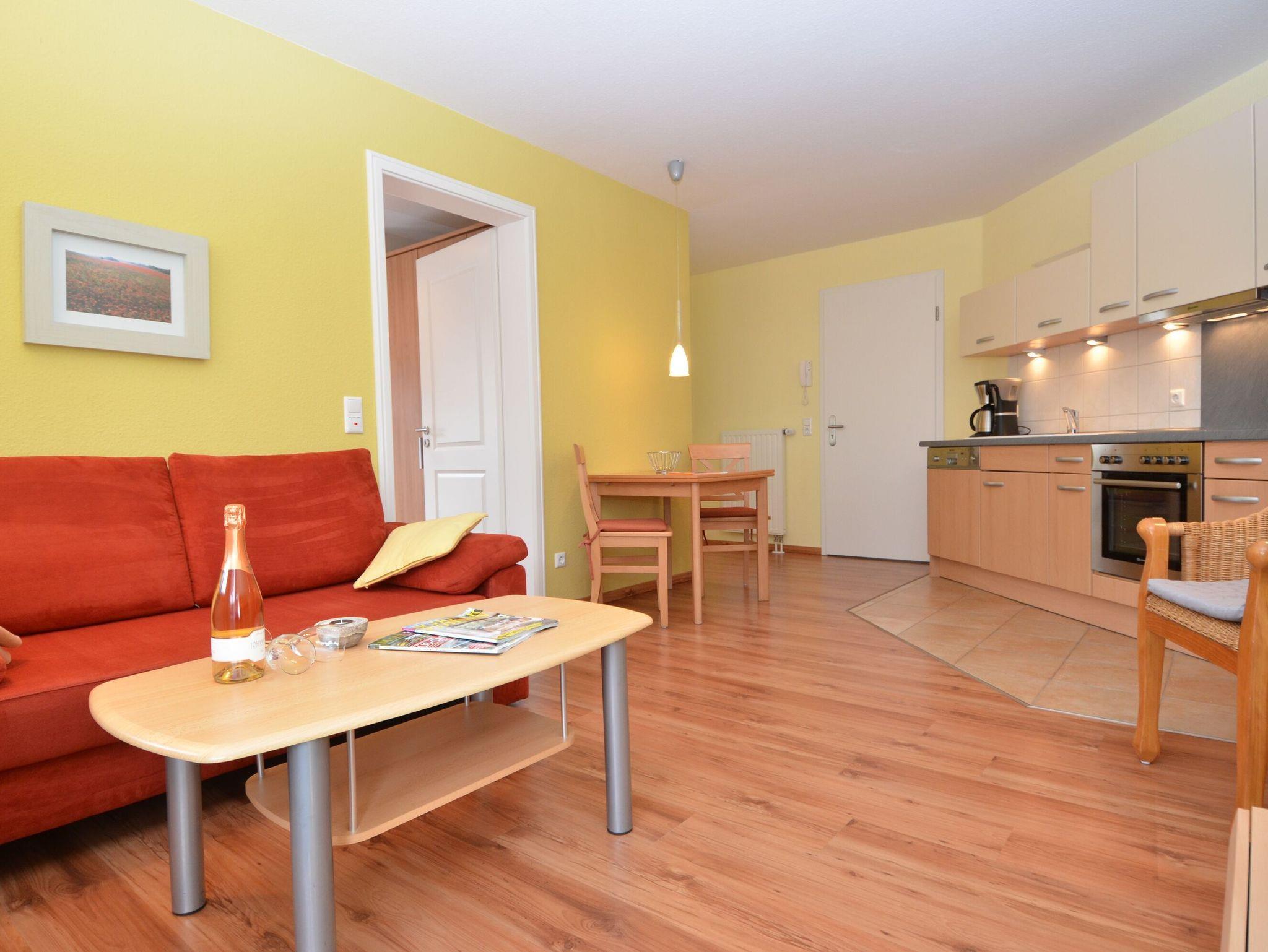 Der helle, freundliche Wohnraum ist mit einer bequemen Couch, einem Flachbild-TV, einer Mini-Stereoanlage mit CD-Player und einem Esstisch ausgestattet. Die harmonisch in den Wohnbereich integrierte Küchenzeile ist ausgestattet mit einem Kühlschrank mit Gefrierfach, einem 4-Platten-Cerankochfeld, einem Backofen, einer Geschirrspülmaschine, einer Mikrowelle, Wasserkocher, Kaffeemaschine, Toaster und diversem Kleininventar.