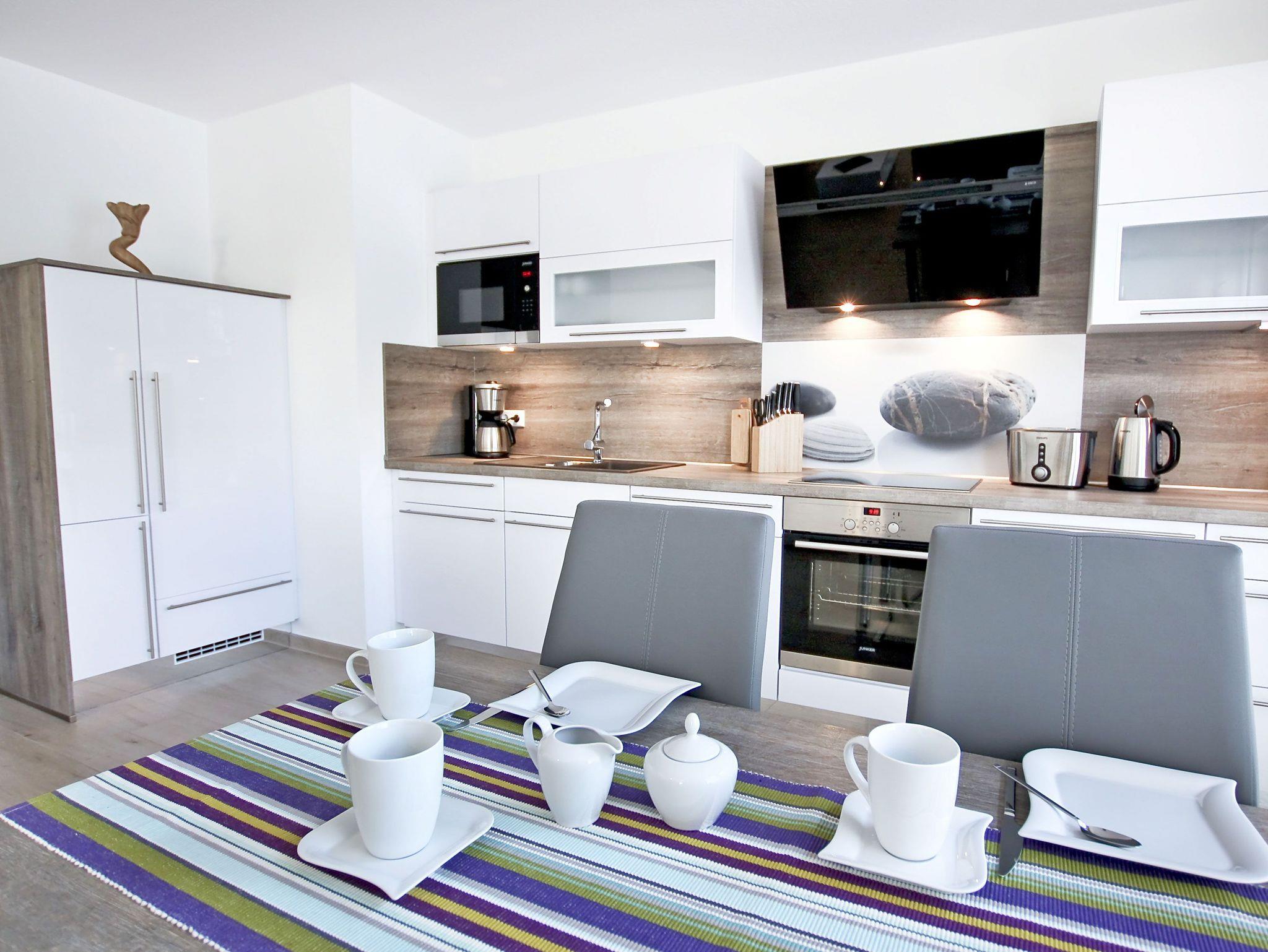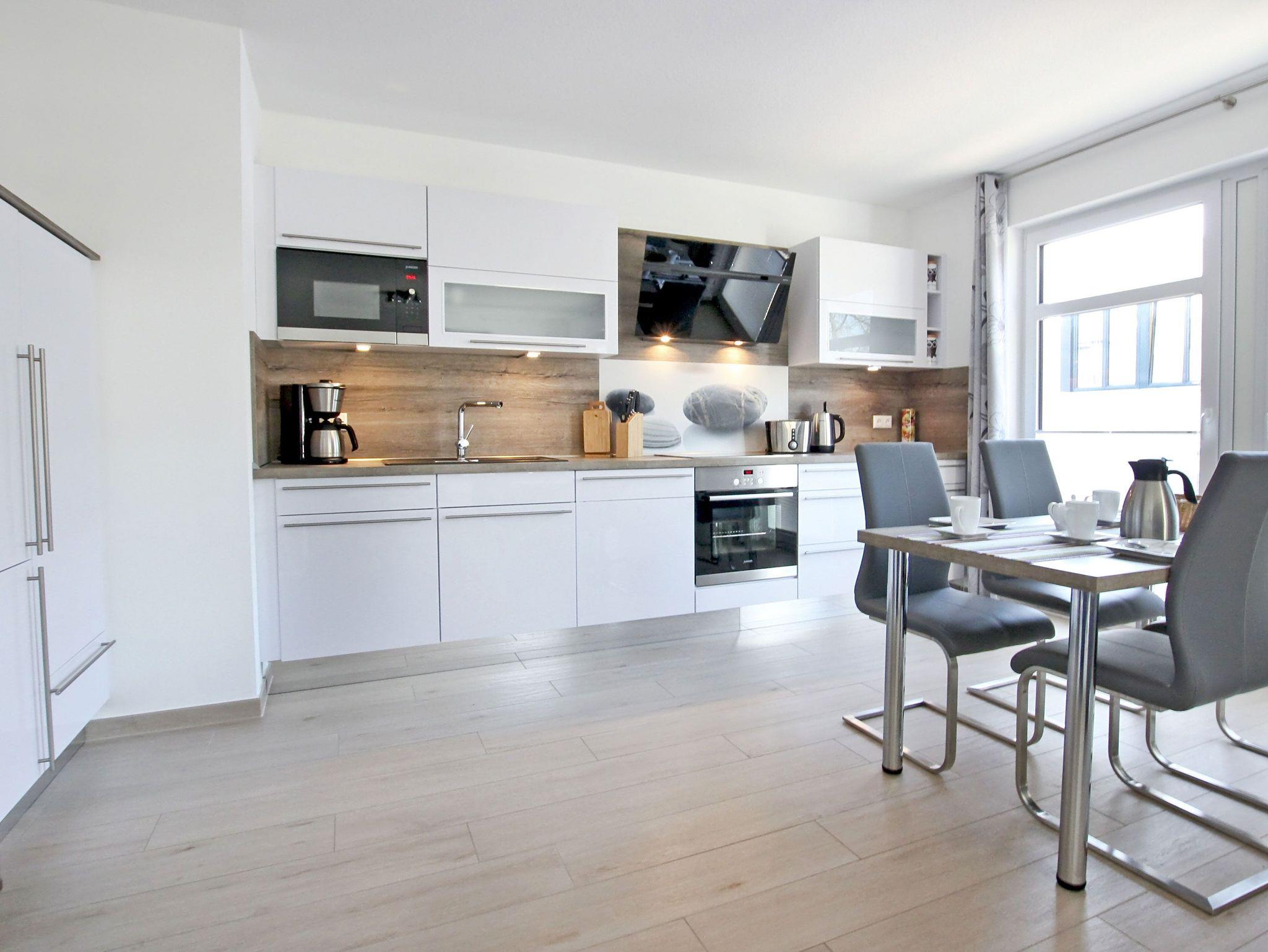 Im lichtdurchfluteten Wohn-/Essbereich erwarten Sie eine große gemütliche Sitzecke, ein Full-HD Fernseher, eine Stereoanlage mit Bluetooth für externe Geräte, eine hochwertig eingerichtete Küche mit Induktionskochfeld, Backofen, Mikrowelle, eine große Kühl-Gefrierkombination, Geschirrspüler, Kaffeemaschine, Wasserkocher, Toaster etc. sowie ein großer Esstisch.