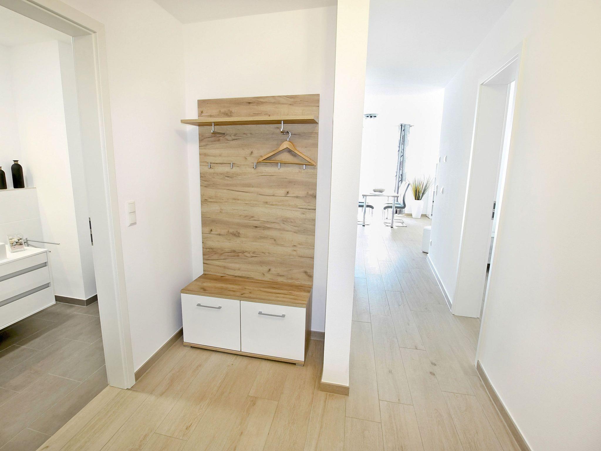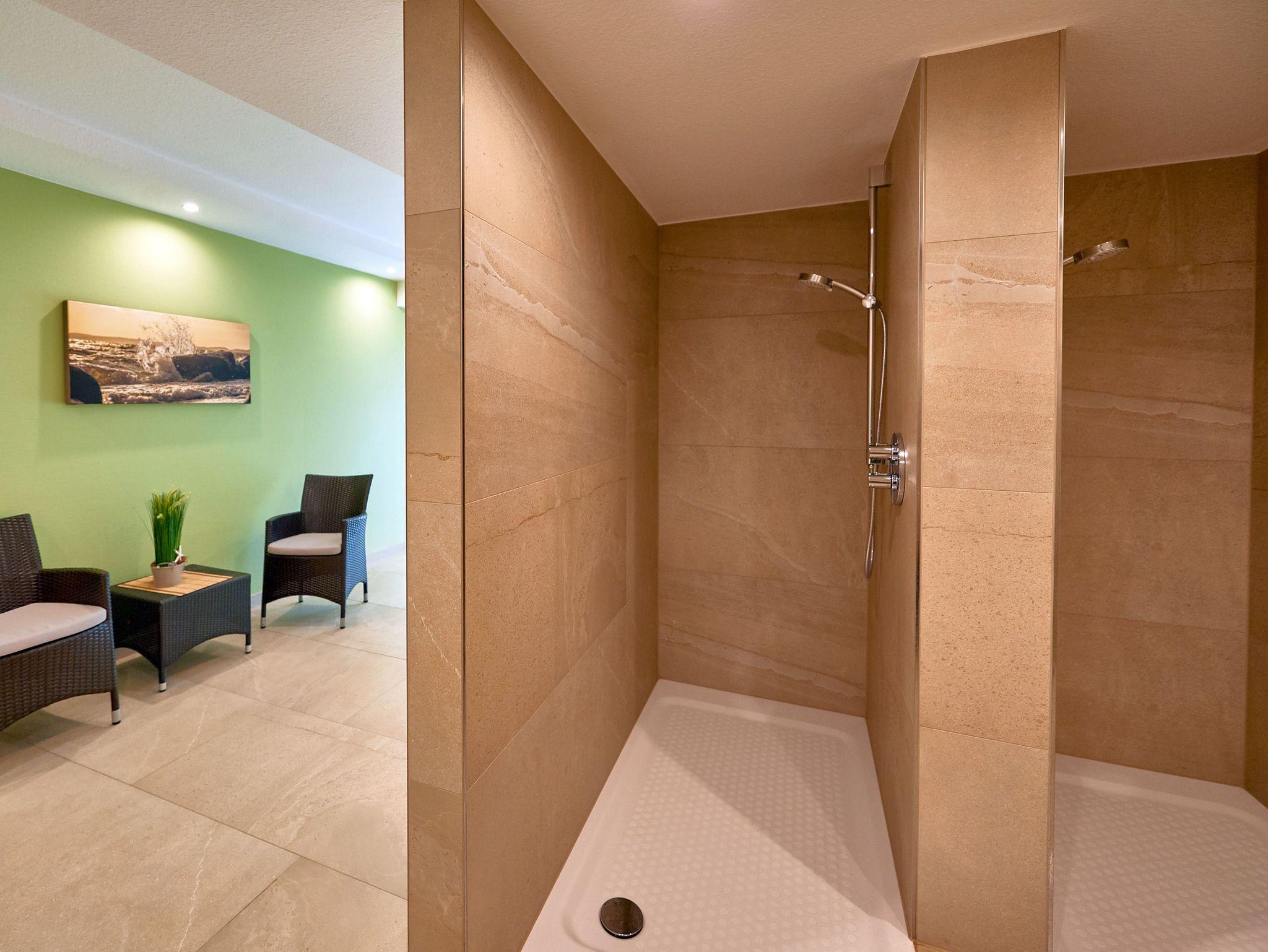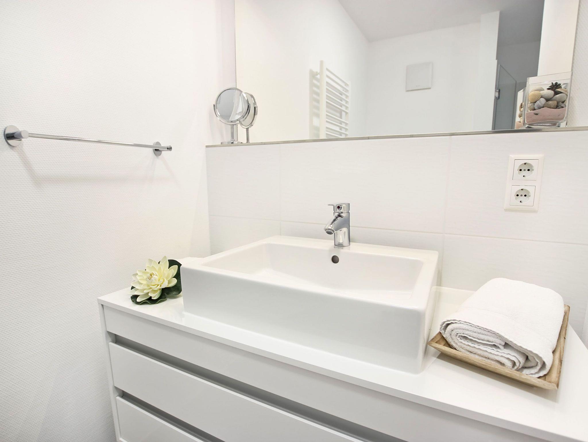 Die zwei Bäder im Appartement sind jeweils mit einer geräumigen Glasdusche, einem großen Waschtisch mit geräumigem Unterschrank und einem Handtuchheizkörper ausgestattet.