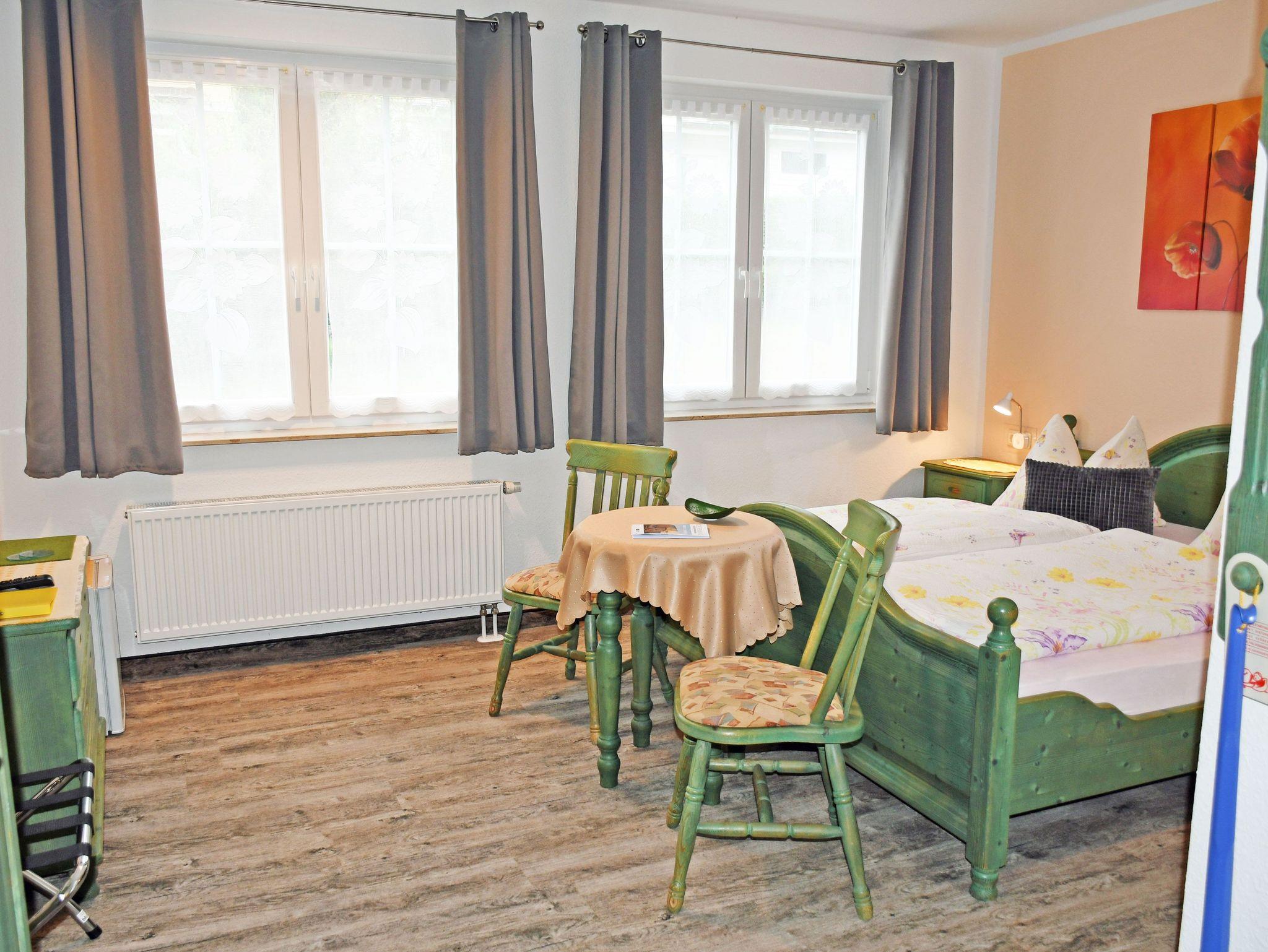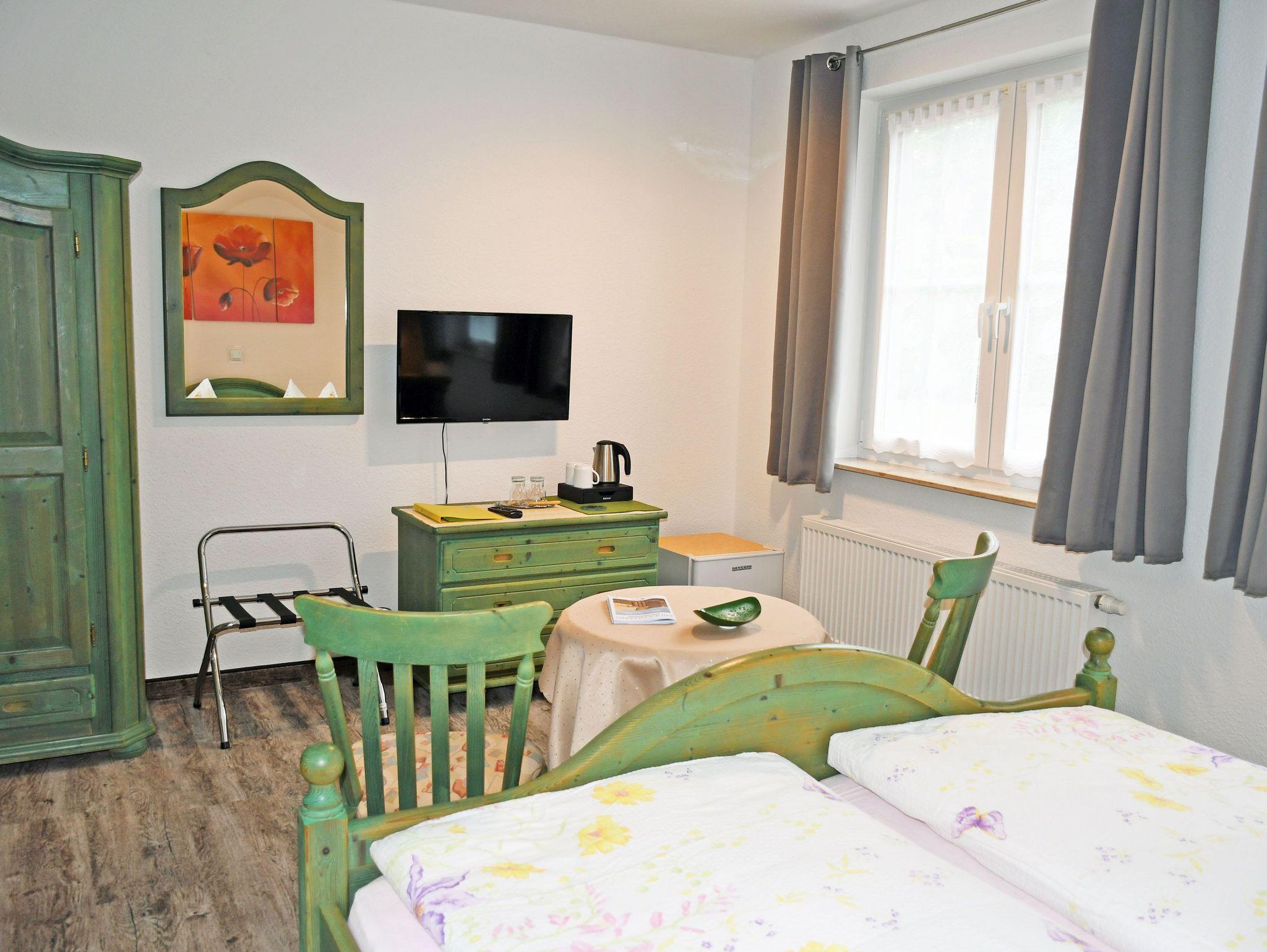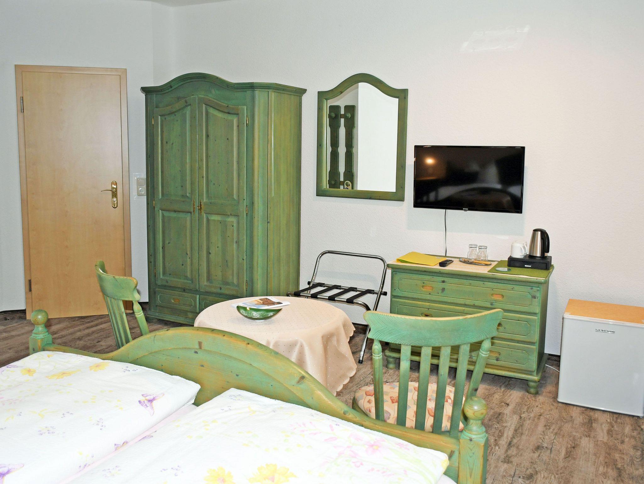 Unsere modern eingerichteten Doppelzimmer (21 qm) sind mit rustikalen Bauernmöbeln komfortabel ausgestattet und in den Farben Blau oder Grün gehalten. Zur Ausstattung gehören bequeme Doppelbetten mit Nachttischen und Leselampen, Sitzmöbel mit Tisch, Kleiderschrank, Kühlschrank, Wasserkocher, Flachbild-TV und Radio.Tassen und Löffel sind ebenfalls vorhanden. Separat für alle Gäste haben wir Geschirr, wie Teller, Teetassen sowie Besteck und Geschirrhandtücher. Ab 2016 gibt es auch einen kostenlosen WLAN-Anschluss. Bei Ihrer Anreise liegen frische Handtücher bereit und die Betten sind selbstverständlich bereits mit Bettwäsche bezogen. Alle Zimmer verfügen über ein separates Bad mit Tageslicht, Dusche und WC. In unserem Frühstücksraum starten Sie den Tag mit einem ausgiebigen Frühstück vom reichhaltigem Buffet. Wir halten auch eine Auswahl an Getränken für Sie bereit.