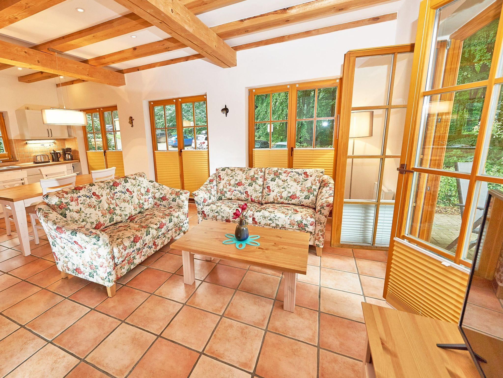 Ganz vorn im Strandschlösschen gelegen, begrüßt Sie die Haushälfte 1 mit rund 100 m² Wohnfläche über zwei Etagen. Wie die anderen drei Haushälften auch, verfügt sie im Erdgeschoss über ein großes und funktional eingerichtetes Wohnzimmer, das durch die offenen Balken besonders gemütlich wirkt. Die Terrasse zur Westseite ist mit Sonnenliegen und Sitzgruppe ausgestattet.
