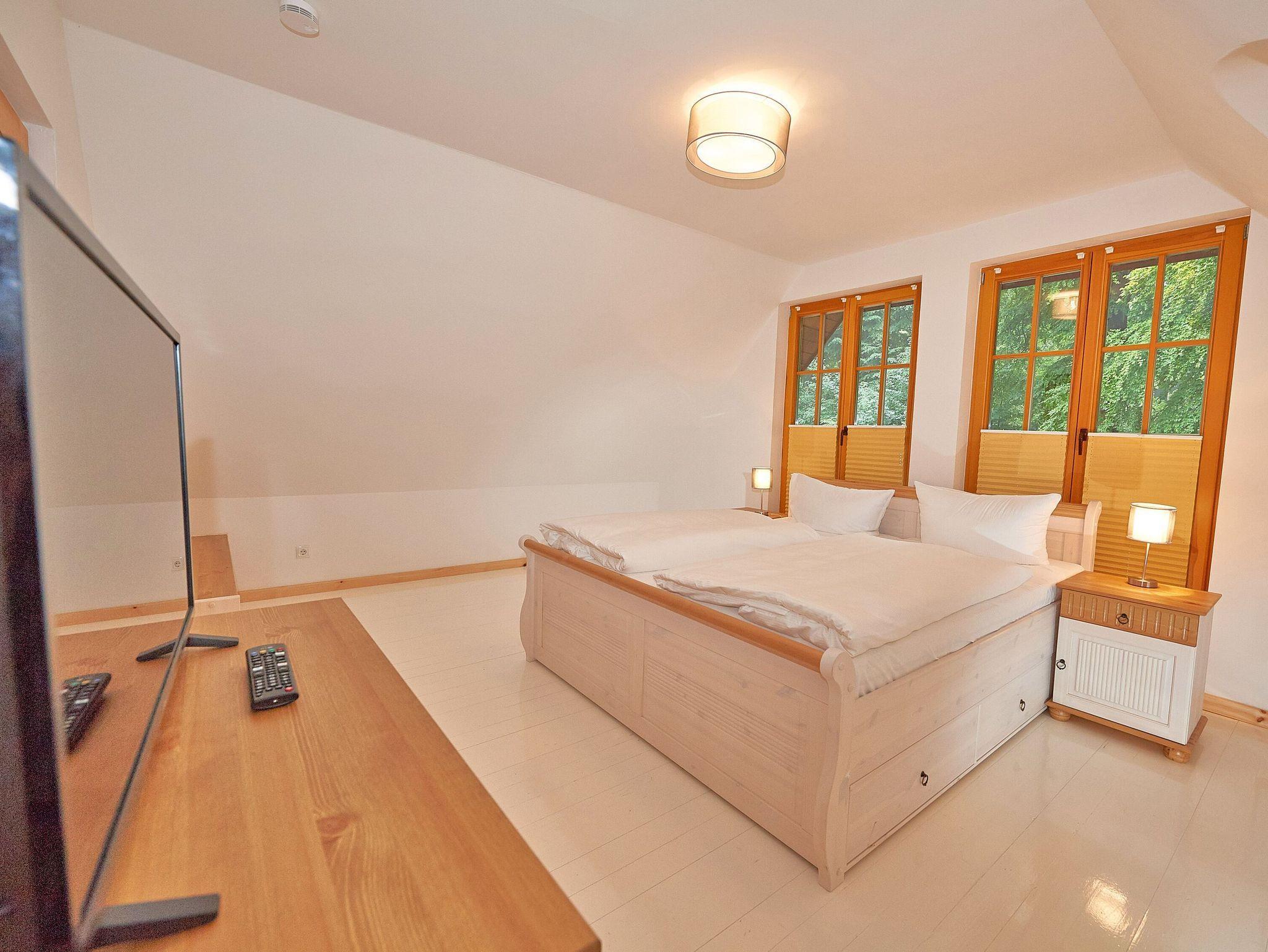 Die beiden Schlafzimmer finden Sie eine Treppe höher im Obergeschoss. Während das größere der beiden Schlafzimmer mit einem komfortablen Doppelbett und einem zusätzlichen TV-Gerät ausgestattet ist, bietet das zweite Schlafzimmer zwei Einzelbetten und einen geräumigen Kleiderschrank.