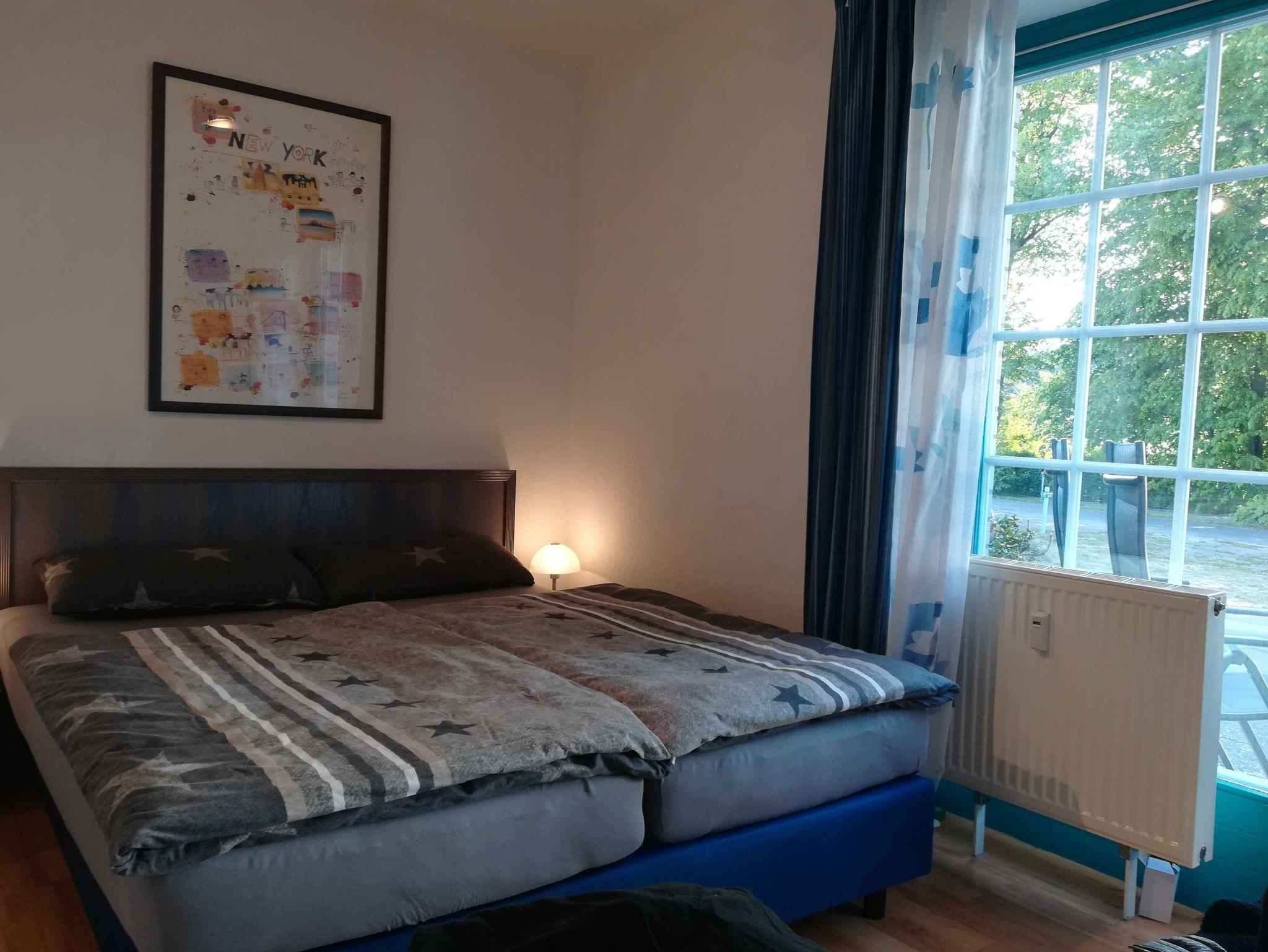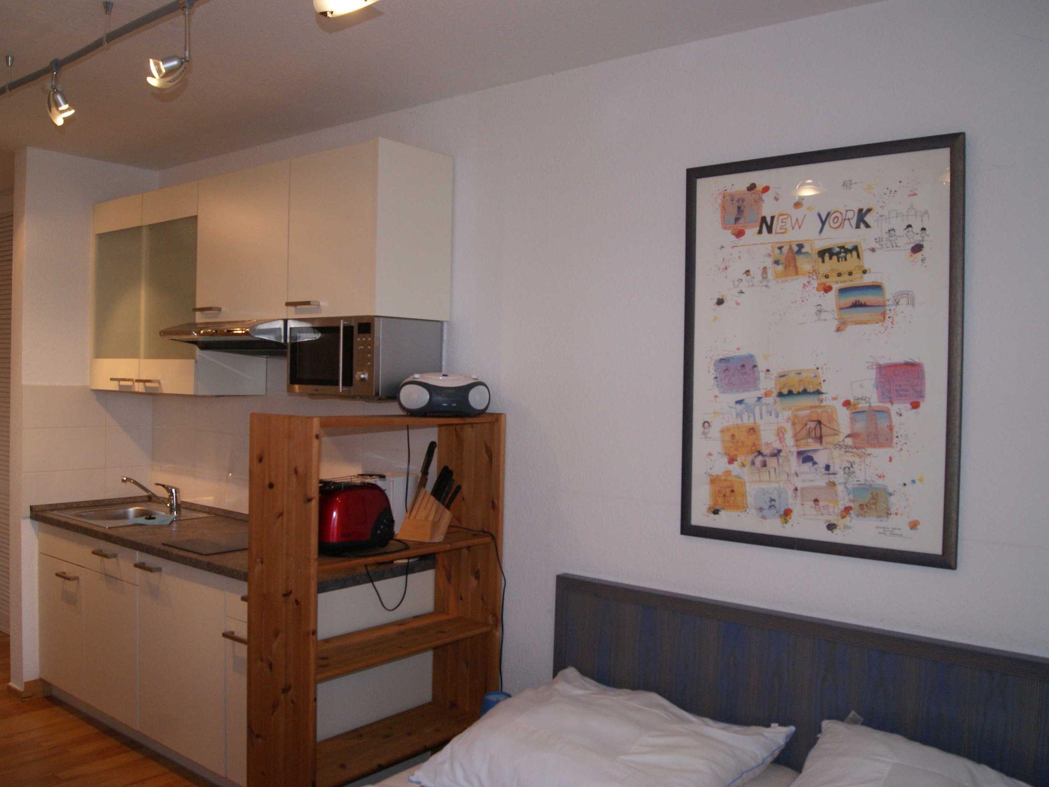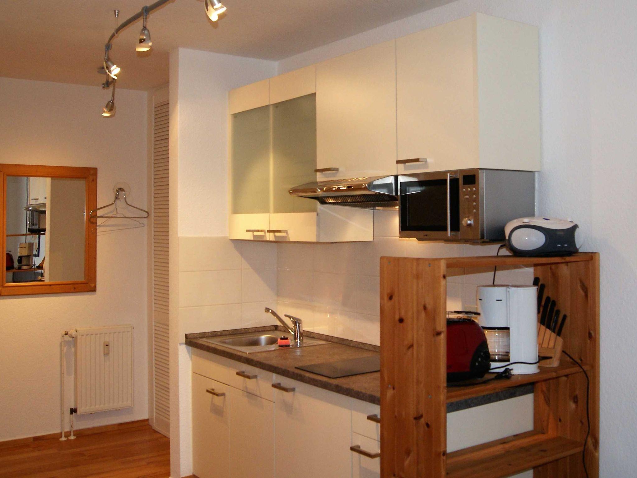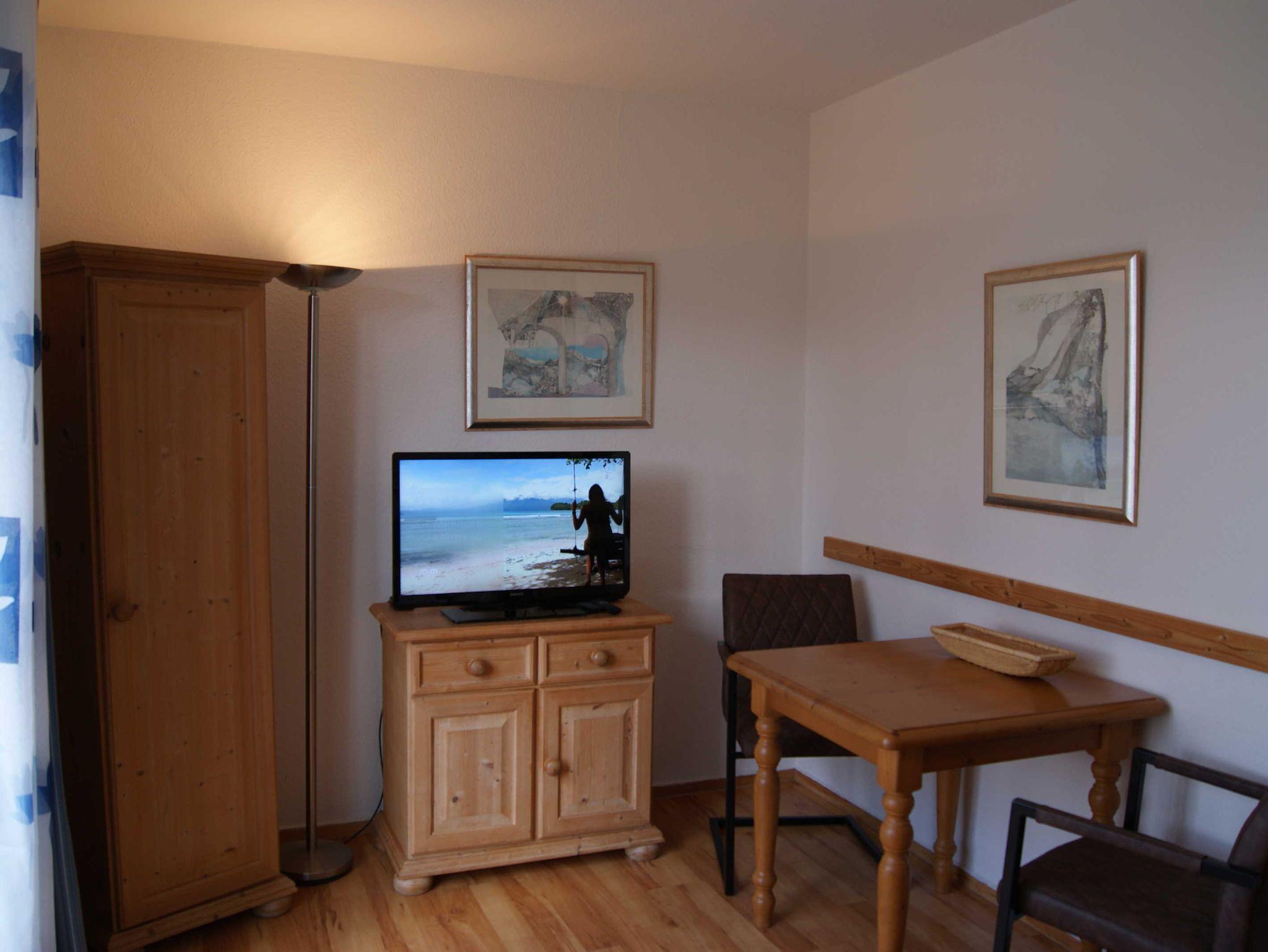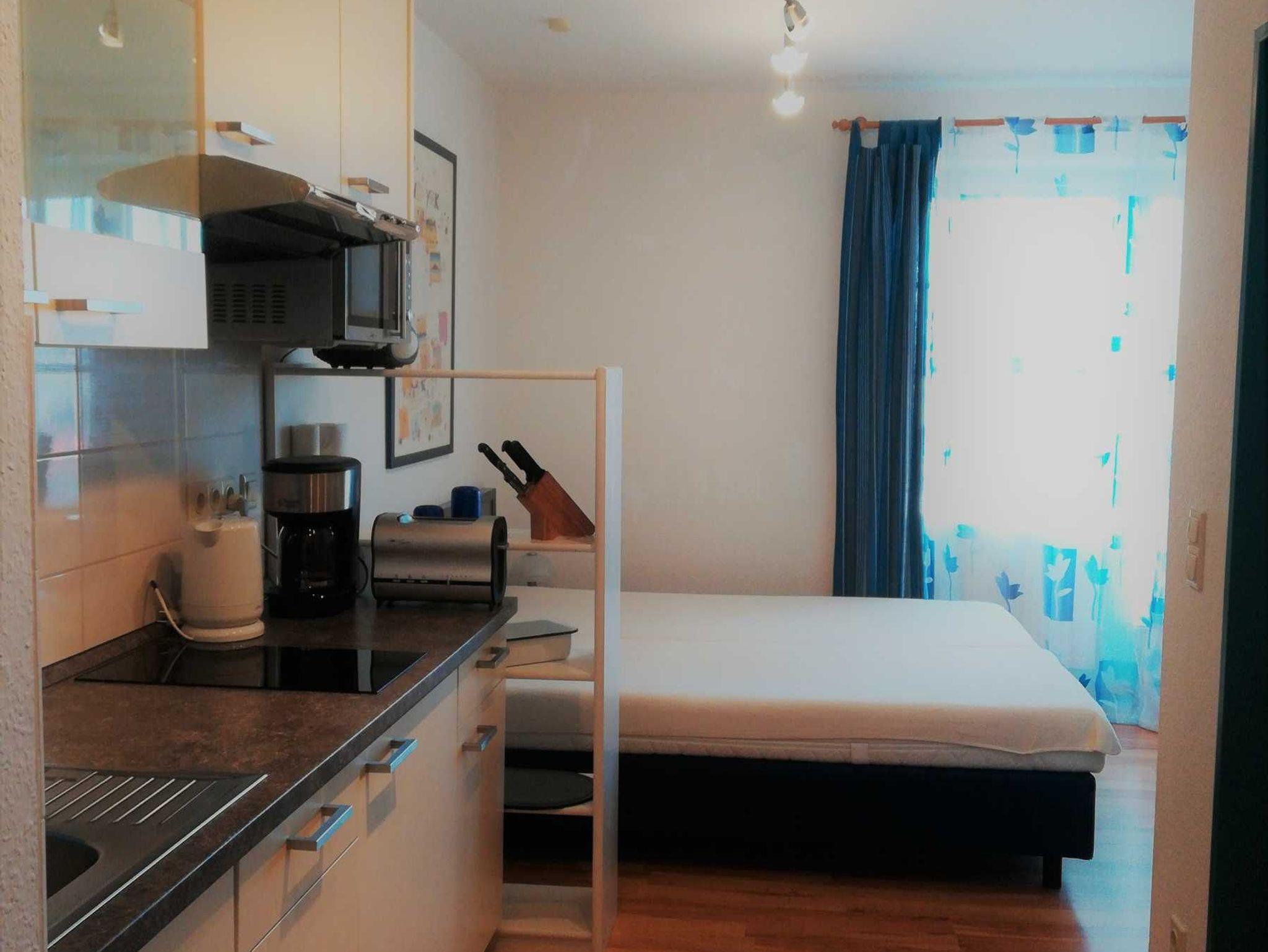 Einraumferienwohnung komplett ausgestattet mit neuer moderner Küche und neuem Bad, W-Lan frei,TV mit DVD, Mikrowelle mit Grill etc., Bad mit bodentiefer Glasdusche, Boxspringbett 1,60 x 2,00 m, Westterrasse mit Seeblick in 100 m Entfernung