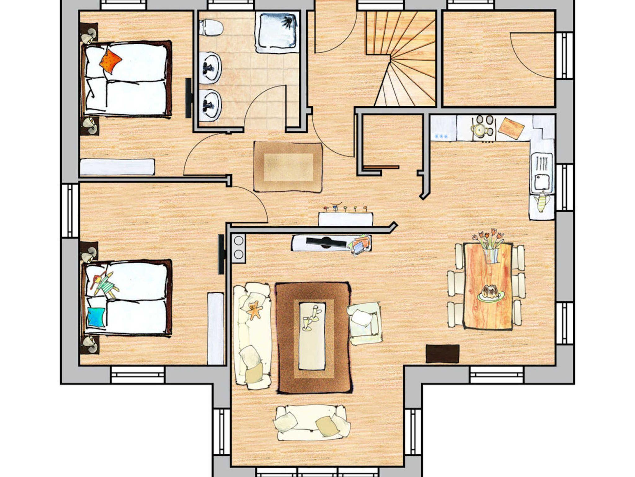 Das 3-Raum-Appartement mit ca. 90 qm Wohnfläche befindet sich im EG des Hauses. Der große, offene, lichtdurchflutete Wohn-/Essbereich ist ausgestattet mit einer gemütlichen Couchgarnitur (eine Aufbettung ist hier für eine 5. und 6. Person auf Anfrage möglich), einen LCD-TV, Bluray-Player und einer Stereoanlage. Die im Wohnbereich harmonisch integrierte Küchenzeile verfügt über einen Kühl-/Gefrierschrank, Cerankochfeld, Backofen, Spülmaschine, Mikrowelle, Kaffeemaschine, Wasserkocher, Toaster, Handmixer und div. Kleinutensilien. 2 Schlafzimmer mit je 1 Doppelbett bieten ausreichend Stauraum für Ihre Garderobe. Eines der Schlafzimmer verfügt über einen LCD-TV. Das Bad ist mit einer bodengleichen Dusche, 2 Waschbecken und WC ausgestattet. Die bestuhlte, teilweise überdachte Terrasse mit Strandkorb ist zur Südseite ausgerichtet.