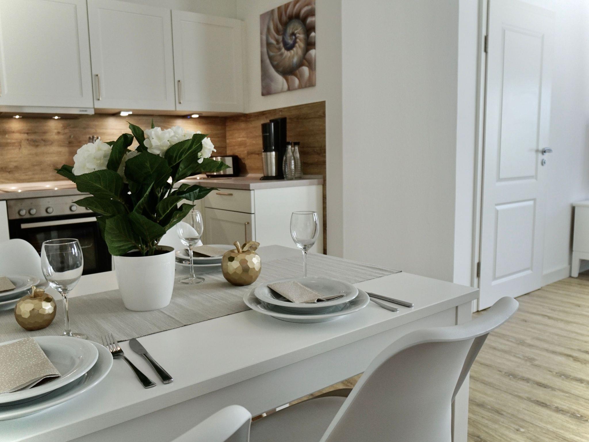 Mit einer Größe von 55 m² eignet sich das Appartement für 1-4 Personen und befindet sich im Erdgeschoss zur Südseite mit großer möblierter Terrasse und Zugang zum Garten. In dem behaglichen Wohn-/Essbereichen mit Esstisch, LCD TV und bequemer Sofaecke (Liegefläche 1,40 x 2 m) können Sie gemeinsam gemütliche Stunden verbringen. Außerdem verfügt das Appartement über eine voll ausgestattete offene Küche mit Geschirrspüler. Ein separates Schlafzimmer mit einem komfortablen Doppelbett (1,60 x 2 m) bietet die Möglichkeit zum Rückzug. Das Bad ist mit ebenerdiger Dusche, WC und Fön ausgestattet. Bei Ankunft erwartet Sie eine Erstausstattung an Bettwäsche und Handtüchern.