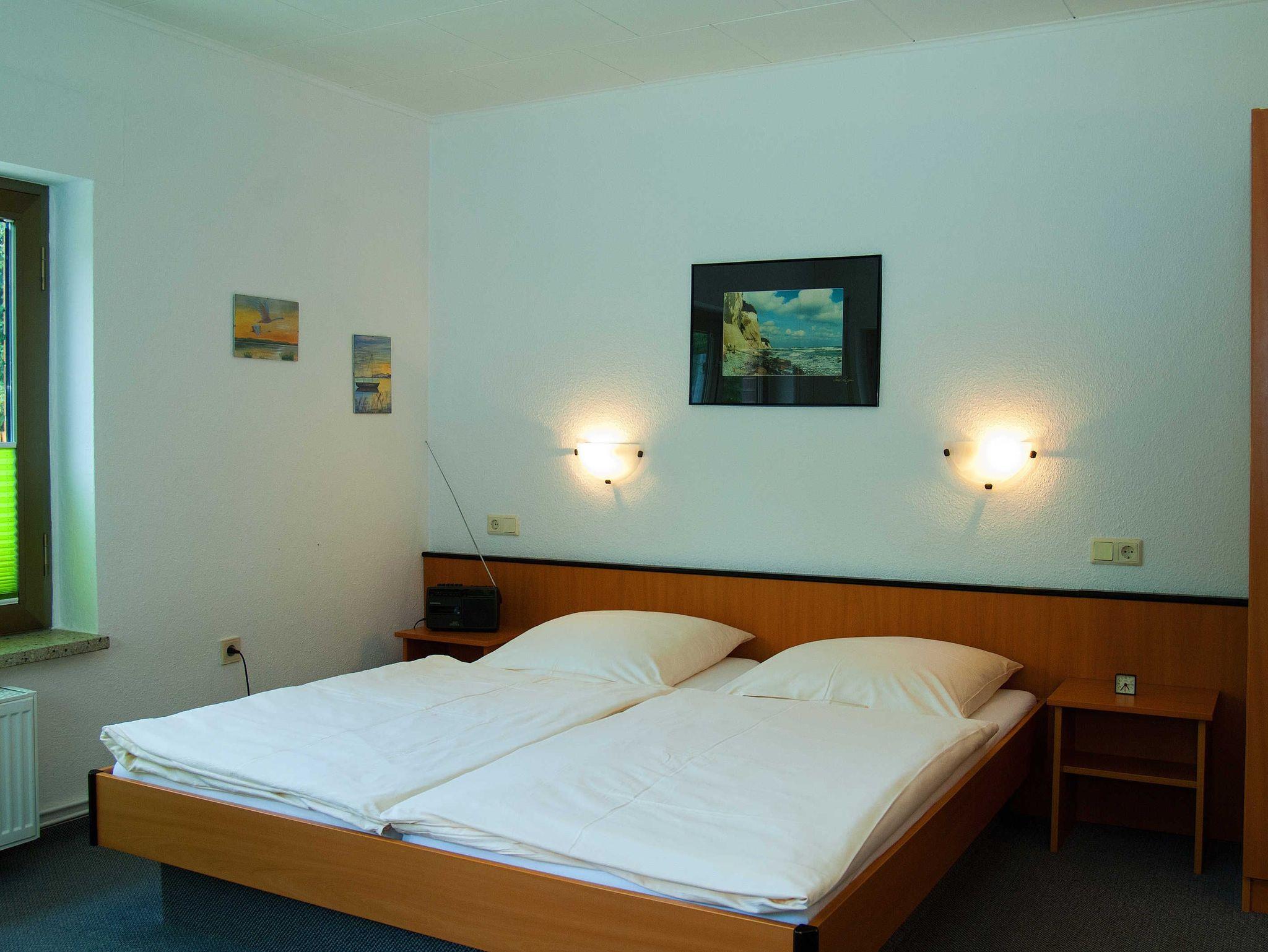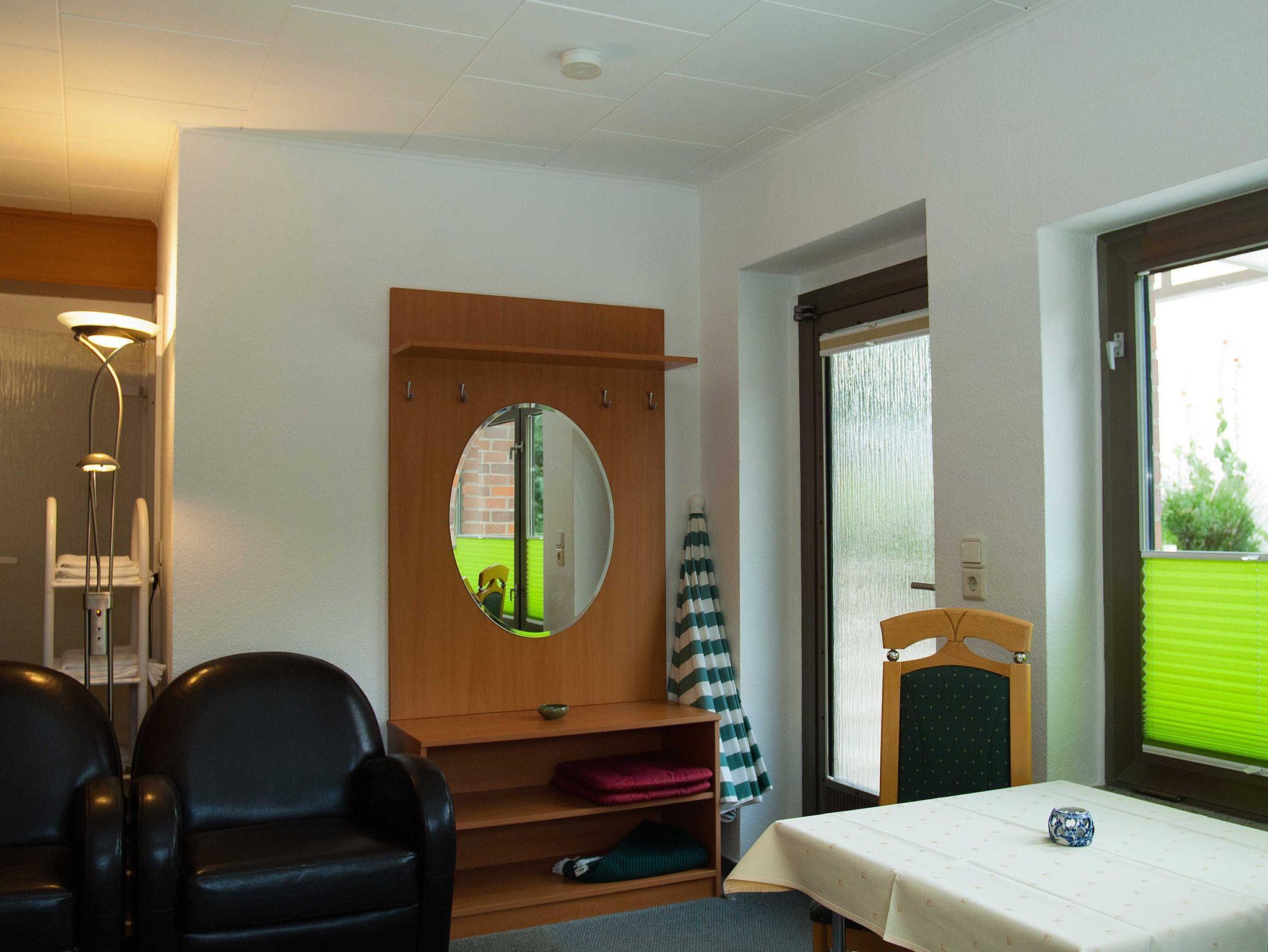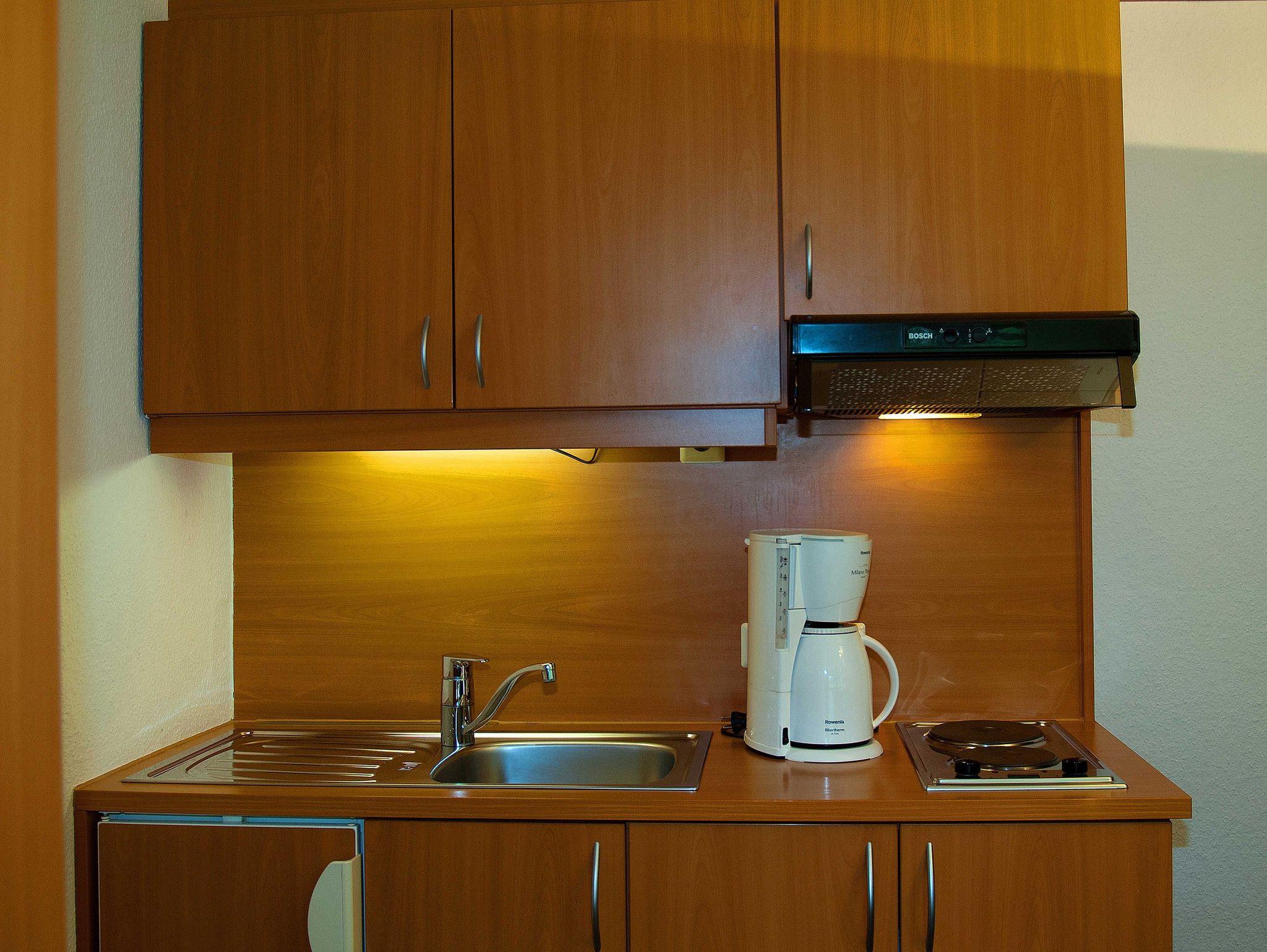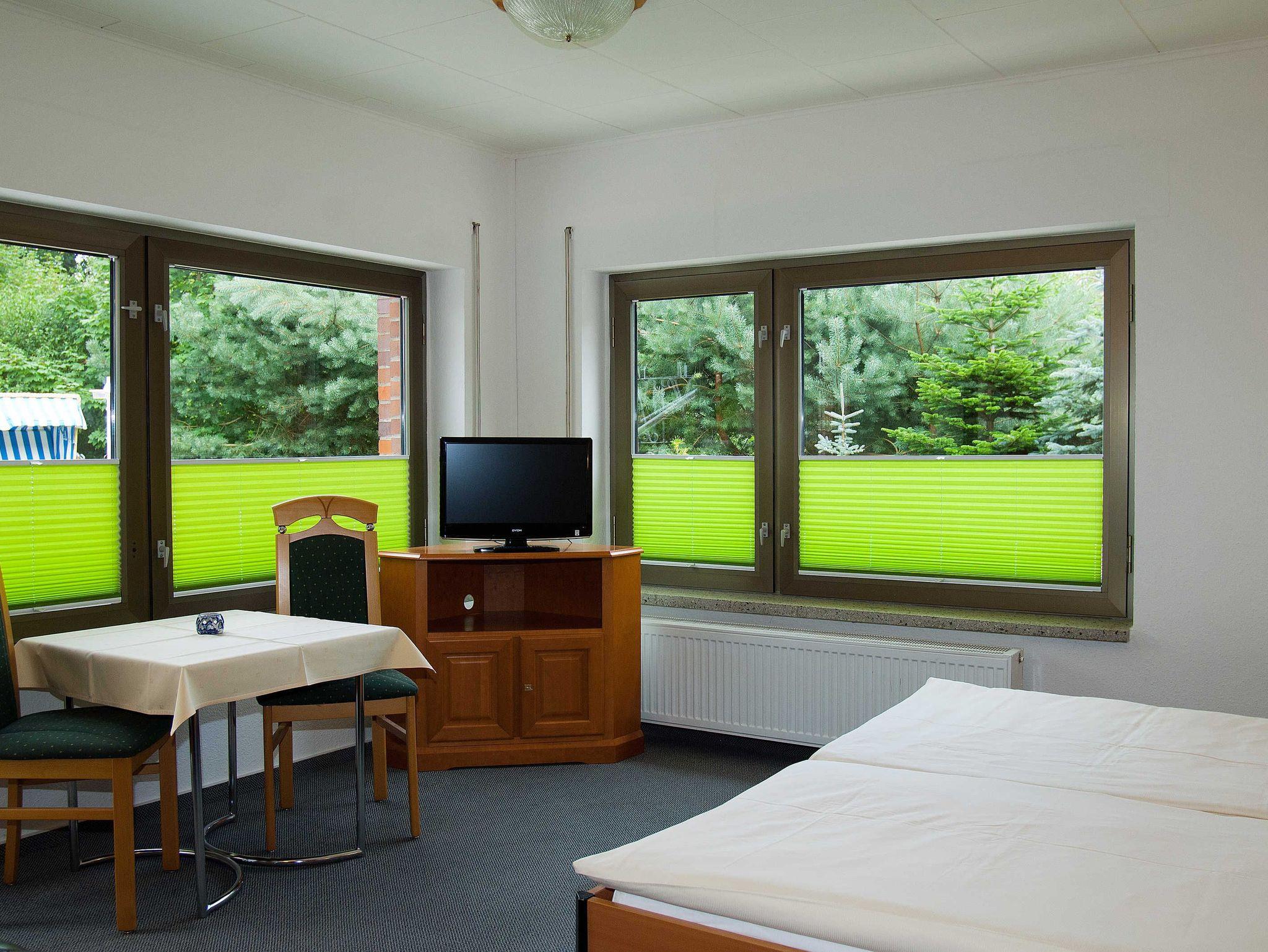 Dieses Doppelzimmer „Ostsee“ (25m²) hat eine kleine Küchenzeile. Im Wohnbereich befindet sich ein Schrank, ein kleiner Tisch mit je zwei Stühlen und ein Doppelbett (2 m x 1.80 m). Die kleine Küche ist mit Kühlschrank (ohne Gefrierfach) und 2-Platten-Ceranfeld (ohne Backofen), ausgestattet. Kochutensilien, Kaffeemaschine, Eierkocher, Wasserkocher, ein Toaster, ausreichend Geschirr und Besteck, sind ebenso vorhanden.
