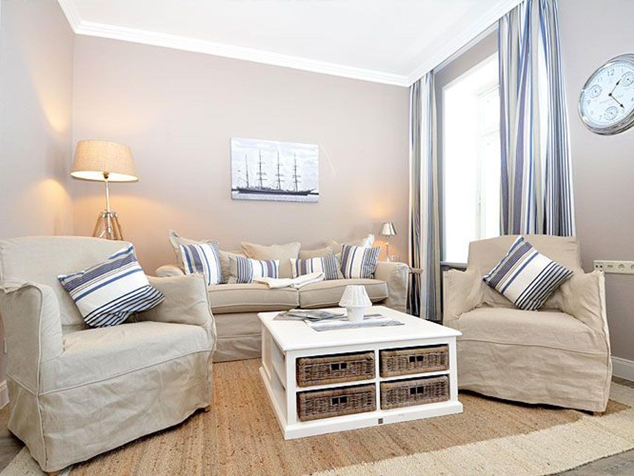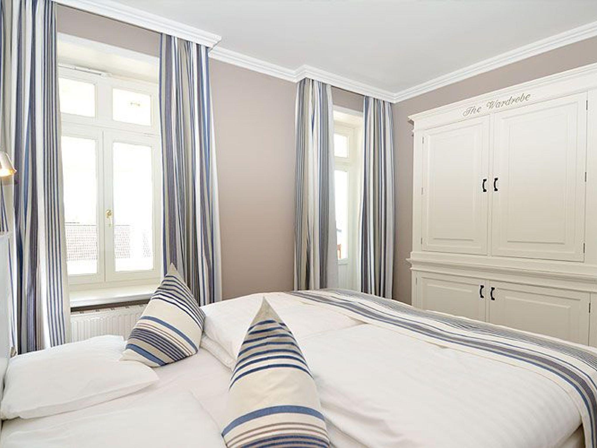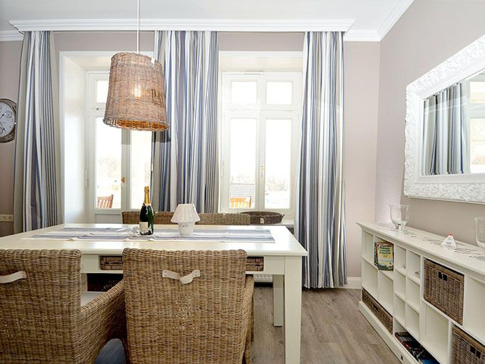 Dieses rund 70 m² große und sehr stilvoll eingerichtete 3-Raum-Appartement begrüßt Sie im 2. Obergeschoss und begeistert u.a. mit seinem ca. 20 m² möblierten Holzbalkon im Bäderstil zur Morgensonne mit Blick auf die Wilhelmstrasse. Dieser Balkon mit Teakholz-Möblierung ist sowohl vom Wohnzimmer als auch vom Schlafzimmer aus zu betreten. Die wunderschönen Landhausmöbel, ausgesuchte Stoffe und die warmen Erdtöne schaffen mit den leicht maritimen Akzenten ein ganz einzigartiges Wohlfühlambiente.
