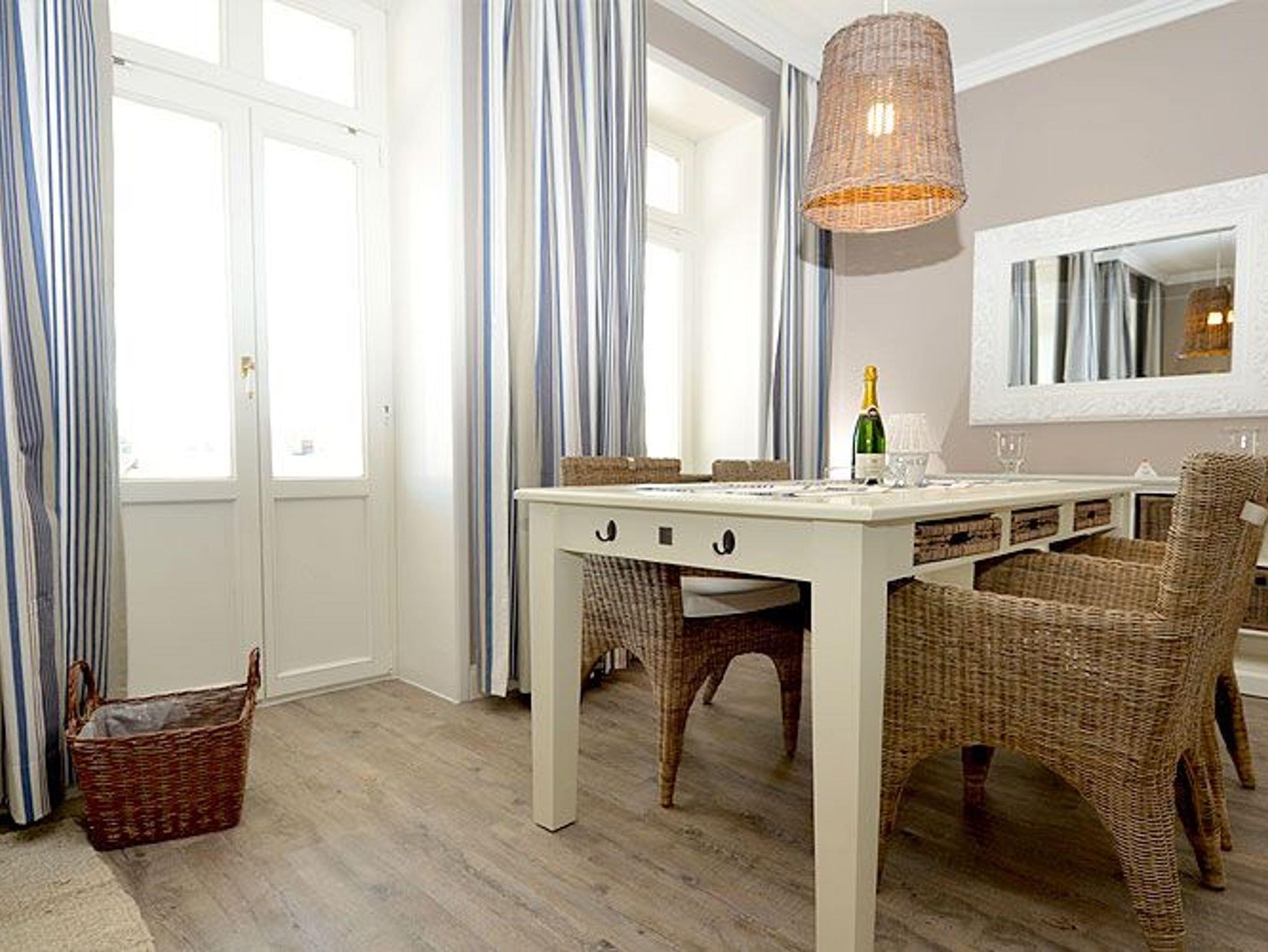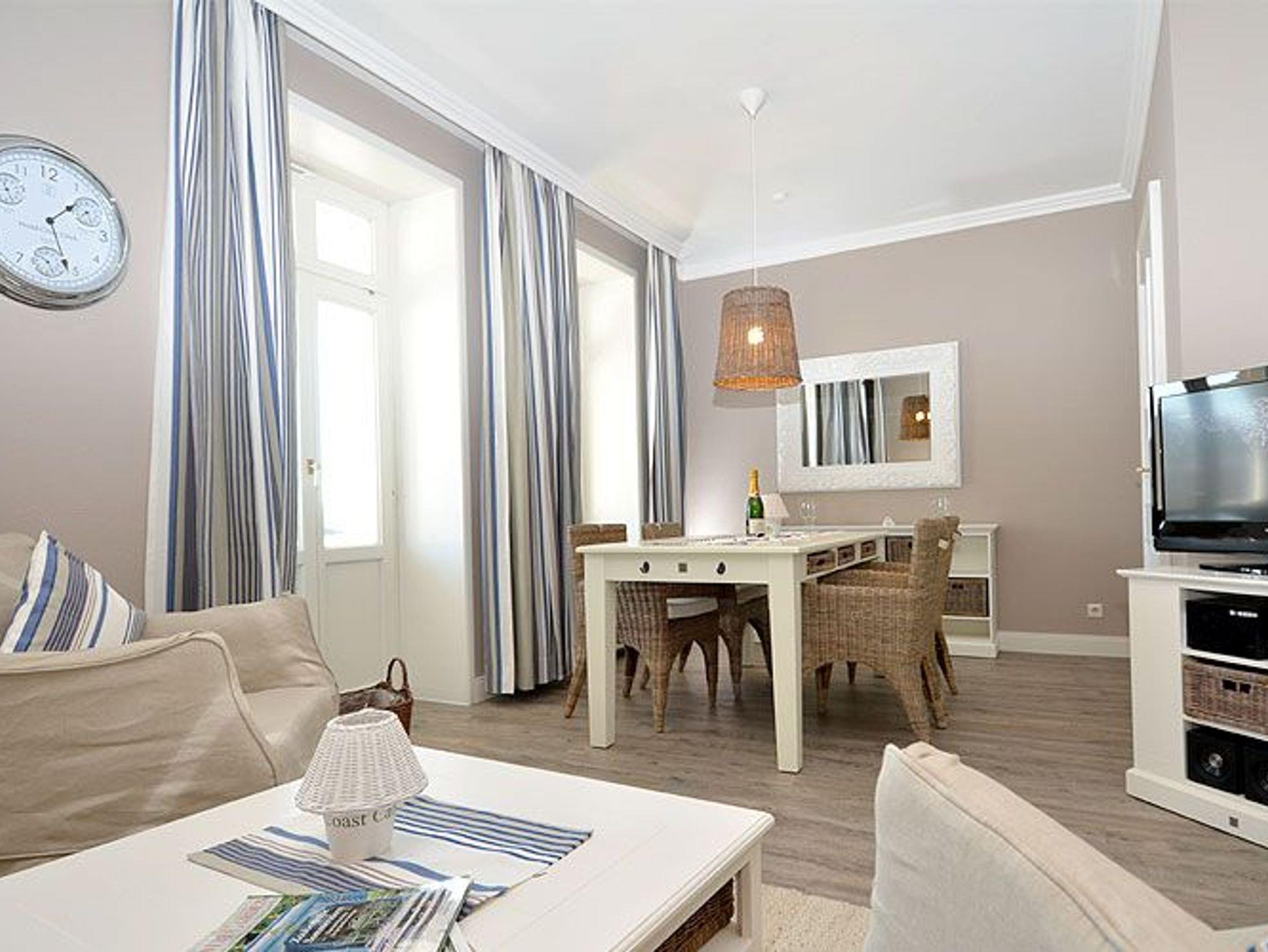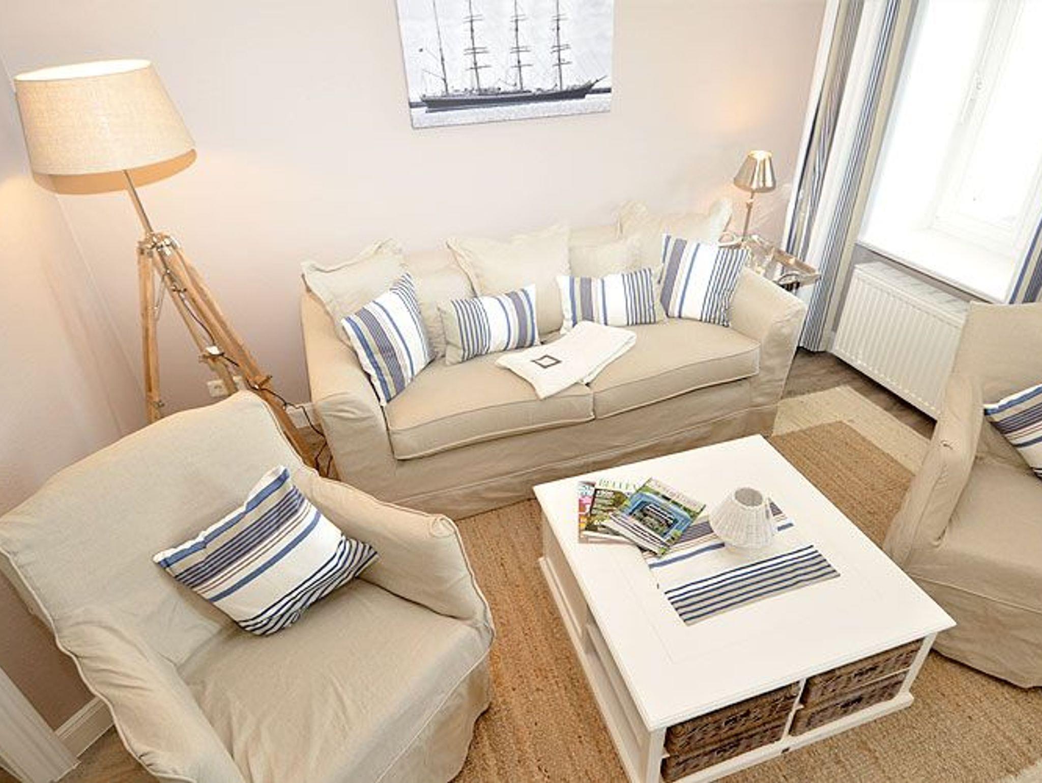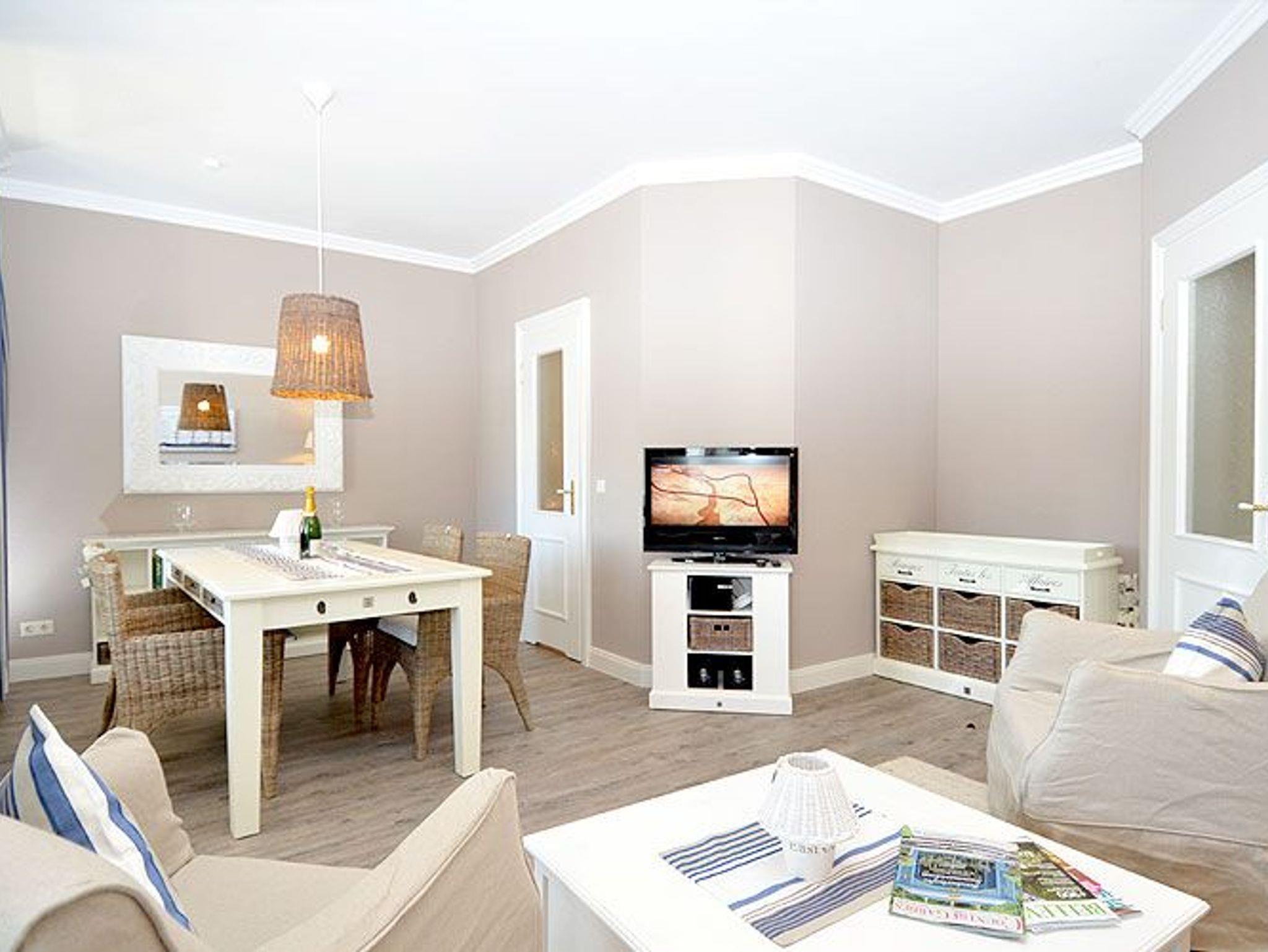 Dieses rund 70 m² große und sehr stilvoll eingerichtete 3-Raum-Appartement begrüßt Sie im 2. Obergeschoss und begeistert u.a. mit seinem ca. 20 m² möblierten Holzbalkon im Bäderstil zur Morgensonne mit Blick auf die Wilhelmstrasse. Dieser Balkon mit Teakholz-Möblierung ist sowohl vom Wohnzimmer als auch vom Schlafzimmer aus zu betreten. Die wunderschönen Landhausmöbel, ausgesuchte Stoffe und die warmen Erdtöne schaffen mit den leicht maritimen Akzenten ein ganz einzigartiges Wohlfühlambiente.