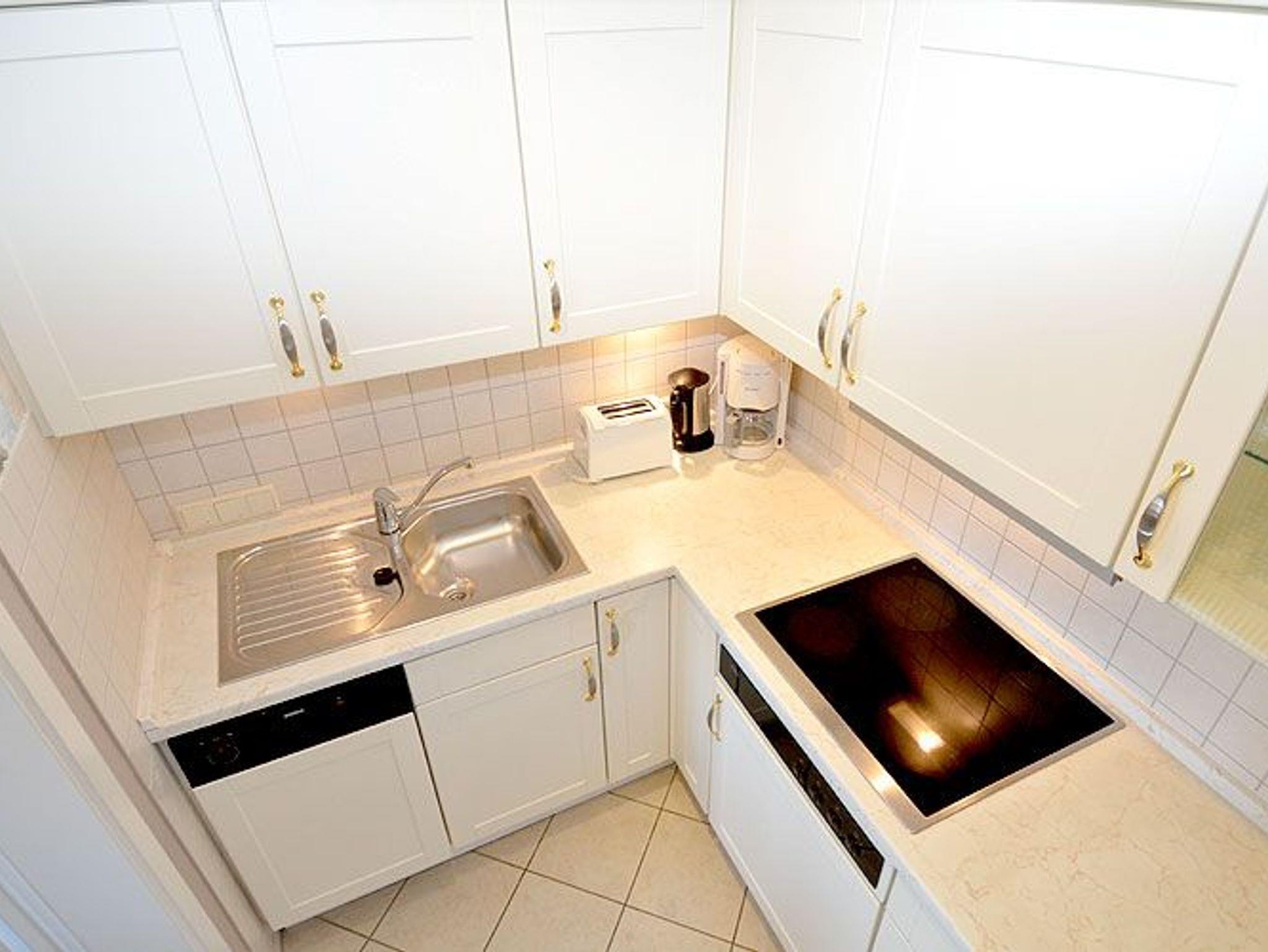 Die separate Küche ist ausgestattet mit einem Kühlschrank mit Gefrierfach, einem 4-Platten-Ceranfeld, einer Spülmaschine, einer Mikrowelle mit Grillfunktion und diversem Kleininventar, das die Küchenausstattung komplettiert.