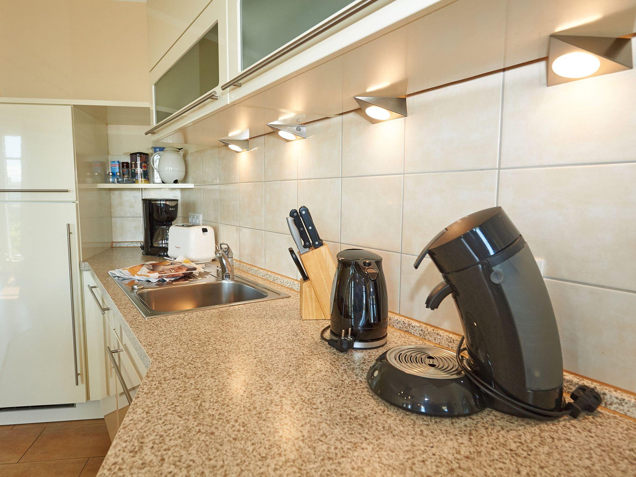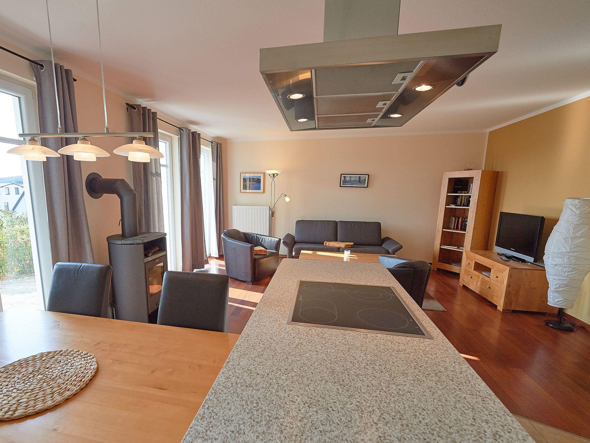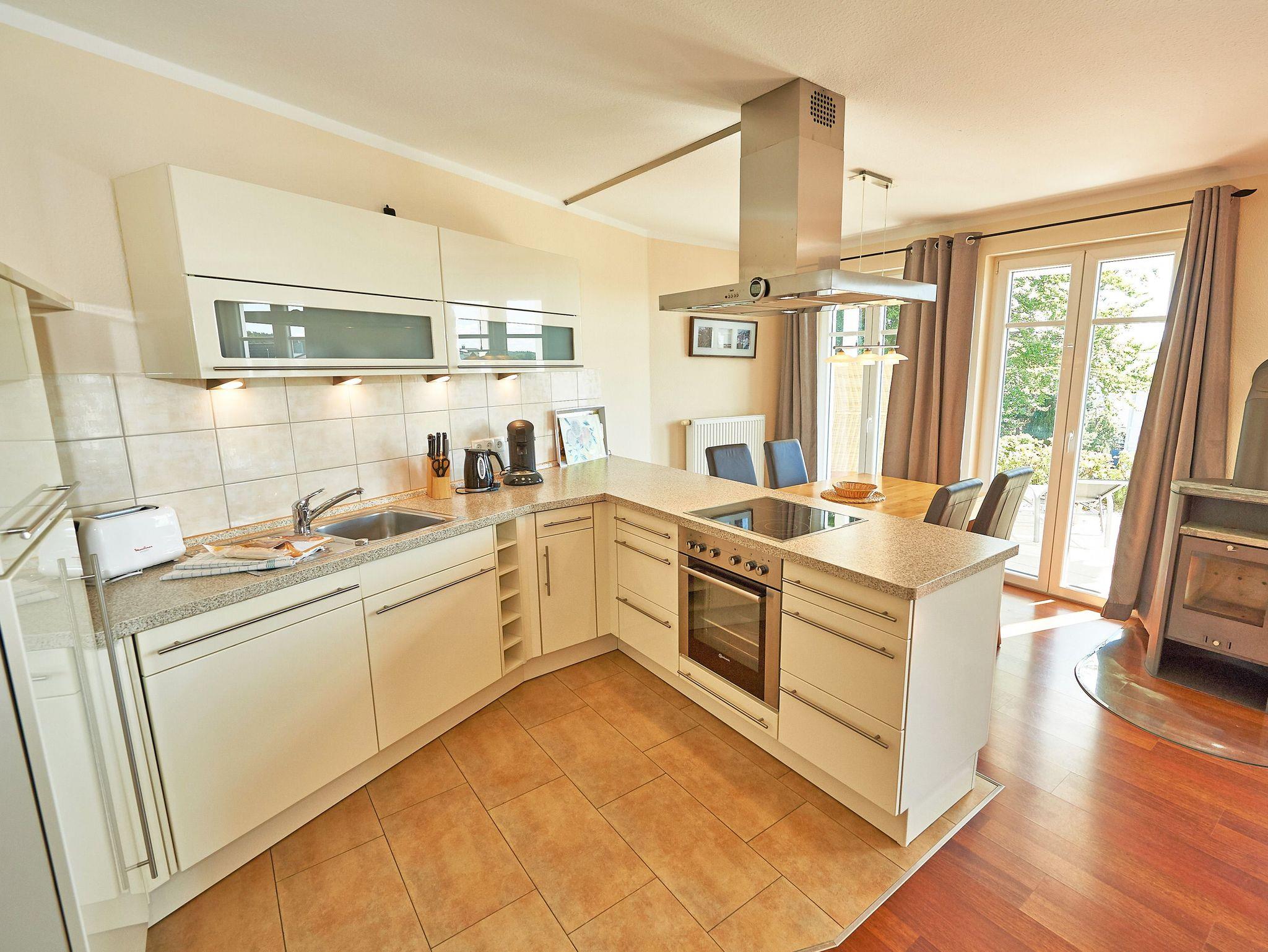 Die ca. 74 m² große Wohnung begrüßt Sie im Erdgeschoss und verfügt über einen Wohn-/Essbereich mit bequemer Sitzgruppe (Schlafcouch), Kamin, TV, Blu-ray-Player, Stereoanlage mit CD-Player, Büchern und Spielen. Die in den Wohnbereich harmonisch integrierte Küchenzeile ist mit Spülmaschine, Backofen, Ceran-Kochfeld mit vier Kochstellen, Mikrowelle, Kühlschrank mit Gefrierfach (***), Toaster, Kaffeemaschine, Senseo-Kaffeeautomat, Wasserkocher, Mixer, Backformen und vielen weiteren Utensilien hochwertig ausgerüstet.