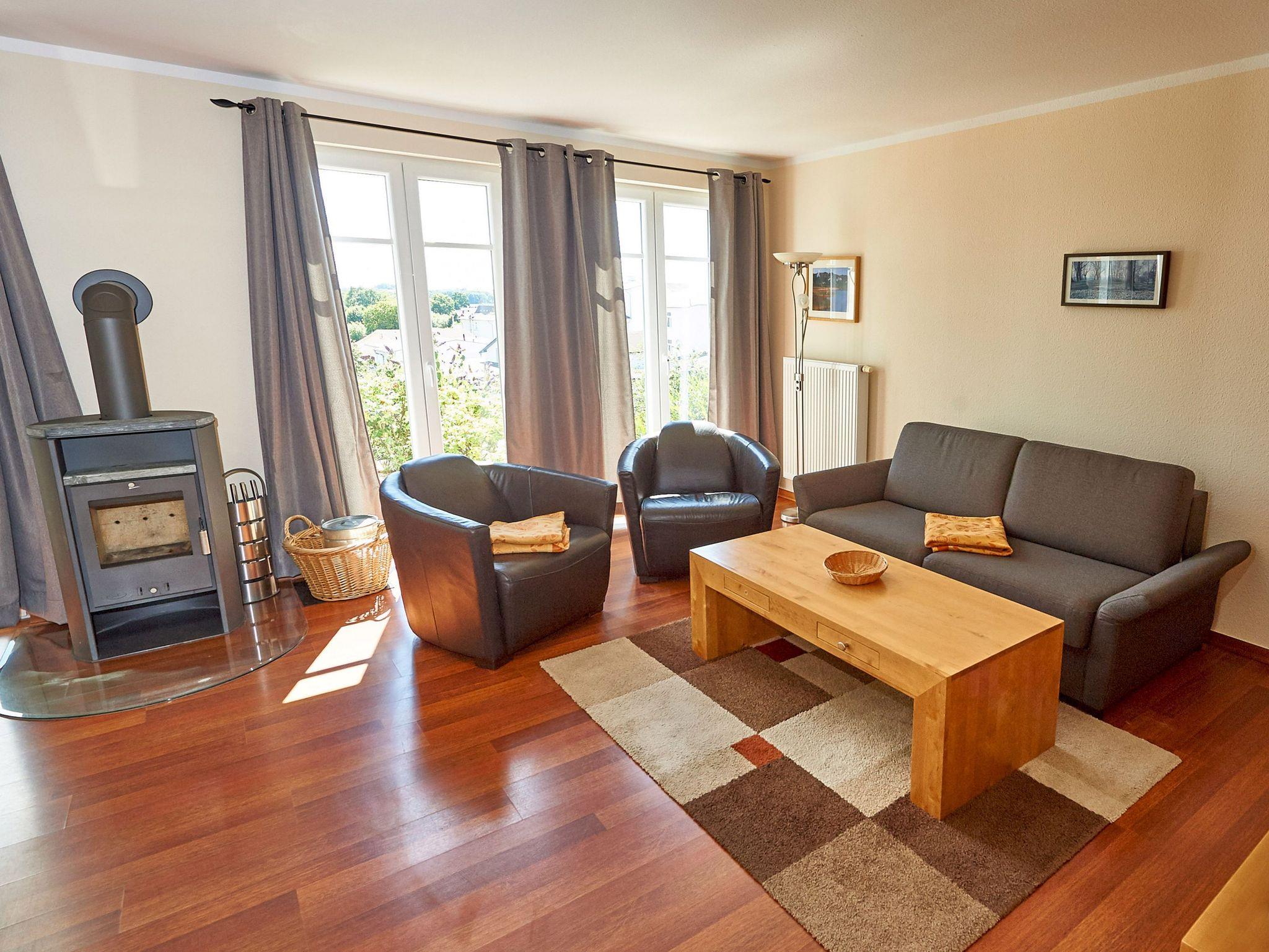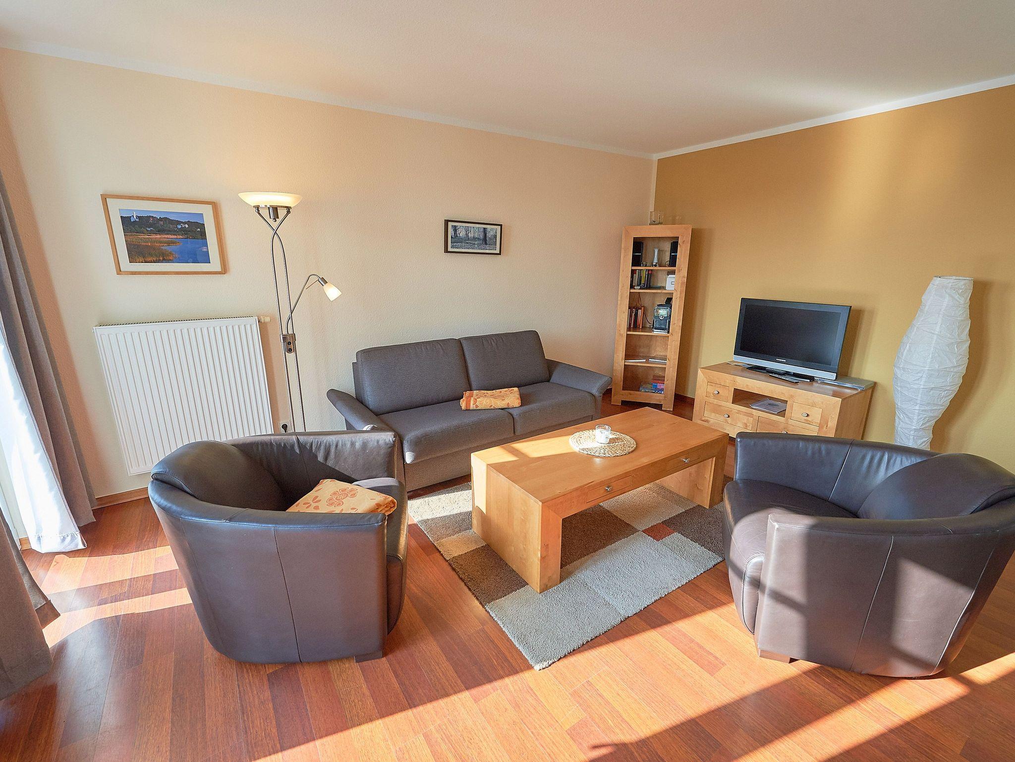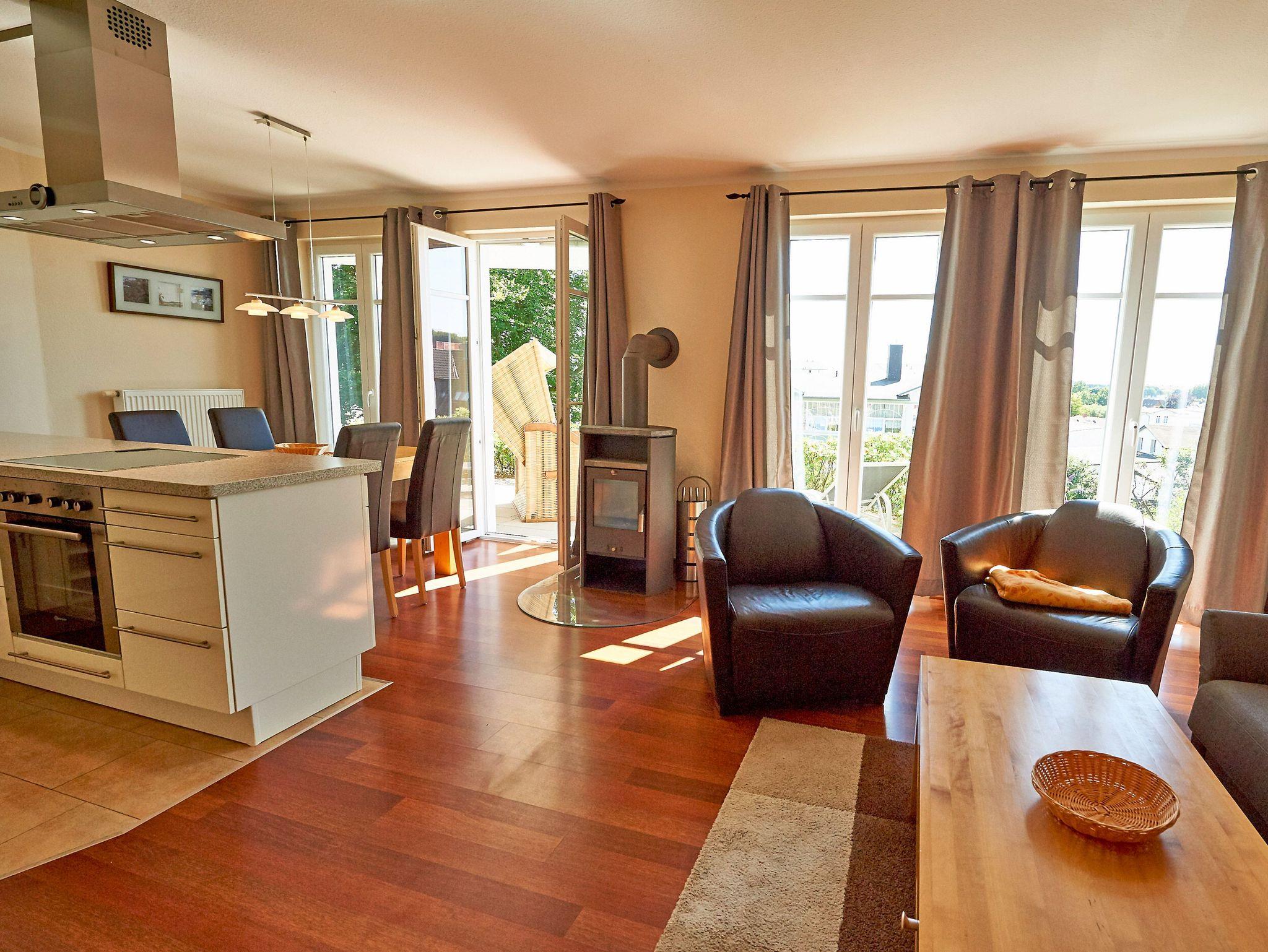 Die ca. 74 m² große Wohnung begrüßt Sie im Erdgeschoss und verfügt über einen Wohn-/Essbereich mit bequemer Sitzgruppe (Schlafcouch), Kamin, TV, Blu-ray-Player, Stereoanlage mit CD-Player, Büchern und Spielen. Die in den Wohnbereich harmonisch integrierte Küchenzeile ist mit Spülmaschine, Backofen, Ceran-Kochfeld mit vier Kochstellen, Mikrowelle, Kühlschrank mit Gefrierfach (***), Toaster, Kaffeemaschine, Senseo-Kaffeeautomat, Wasserkocher, Mixer, Backformen und vielen weiteren Utensilien hochwertig ausgerüstet.
