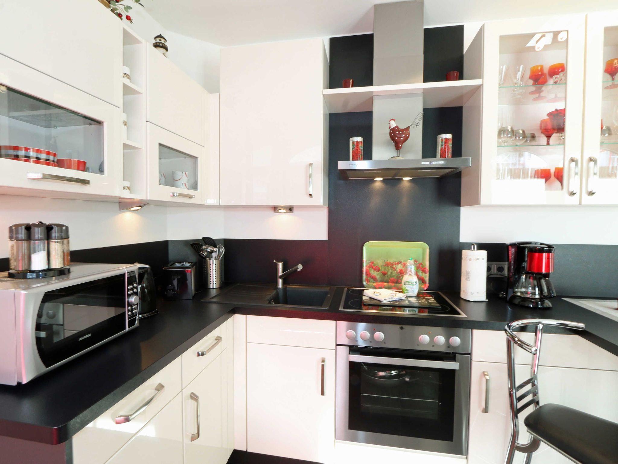 Die modern und hochwertig eingerichtete Nichtraucherwohnung befindet sich im 1. Obergeschoss. Sie umfasst ca. 45 qm und bietet für max. 2 Personen ausreichend Platz. Von der hauseigenen Tiefgarage gelangen Sie bequem mit dem Fahrstuhl direkt zur Wohnung. Der helle Wohnbereich bietet Ihnen eine bequeme Eckcouch mit Sessel, Couchtisch, Leselampe und sorgt so für eine angenehme Wohlfühlatmosphäre. Ein Smart-TV, Stereo-Anlage mit CD- und DVD-Player sowie eine Auswahl an Urlaubslektüre und verschiedene Gesellschaftsspiele bieten Ihnen eine abwechslungsreiche Unterhaltung. Eine WLAN-Verbindung steht Ihnen inklusive zur Verfügung. Die offene und helle Küchenzeile mit angrenzender Essecke ist mit hochwertigen Geräten wie einen 4-Zonen-Cerankochfeld mit Dunstabzugshaube, Backofen, Kühlschrank mit Gefrierfach, Geschirrspüler, Kombi-Mikrowelle, Kaffeemaschine, Wasserkocher, Toaster, Eierkocher sowie diversen Küchenutensilien ausgestattet. Ein überdachter, nach Süd-Ost, ausgerichteter Balkon mit Bestuhlung und Sonnenschirm erreichen Sie vom Wohnbereich. Das Schlafzimmer verfügt über ein Doppelbett (1,80 m x 2,00 m) mit 7-Zonen-Kaltschaummatratzen und verstellbaren Lattenrosten, Nachttischablagen und einem geräumigen Kleiderschrank. Für einen angenehmen Schlaf sorgt das Verdunkelungsrollo. Im Badezimmer befindet sich neben der runden und bodenebenen Glasdusche ein WC, ein beheizbarer Handtuchhalter, Fön, Kosmetikspiegel sowie ein moderner Waschplatz mit Beleuchtung. Bis auf das Schlafzimmer sind alle Böden gefliest und verfügen über eine Fußbodenheizung für angenehme Wärme. Ein Stellplatz (Nr. 02) ist direkt für Sie in der Tiefgarage (Einfahrtshöhe 2,00m) reserviert. Der Stellplatz (Doppelparker) ist für ein Auto bis 1,80 m Höhe und einer Länge bis 5,00 m geeignet (Gewicht bis 2 Tonnen). Waschmaschine und Trockner können im Untergeschoss gegen Extragebühr genutzt werden. Ein separater Fahrradunterstand ist auf dem Hintergrundstück durch einen kleinen Fußweg erreichbar. Für einen kurzen Weg zum Brötchenholen sorgt der im Haus zu findende Bäcker. Haustiere sind nicht erlaubt. Die Erstausstattung eines Wäschepaketes (komplette Bettwäsche, 1 Duschhandtuch, 2 kleine Handtücher) können Sie bis 14 Tage vor Anreise gegen einen Aufpreis dazu buchen oder durch eigene ergänzen. Ab 2 gebuchten Paketen erhalten Sie einmalig 1 Geschirrhandtuch und 1 Duschvorleger dazu.