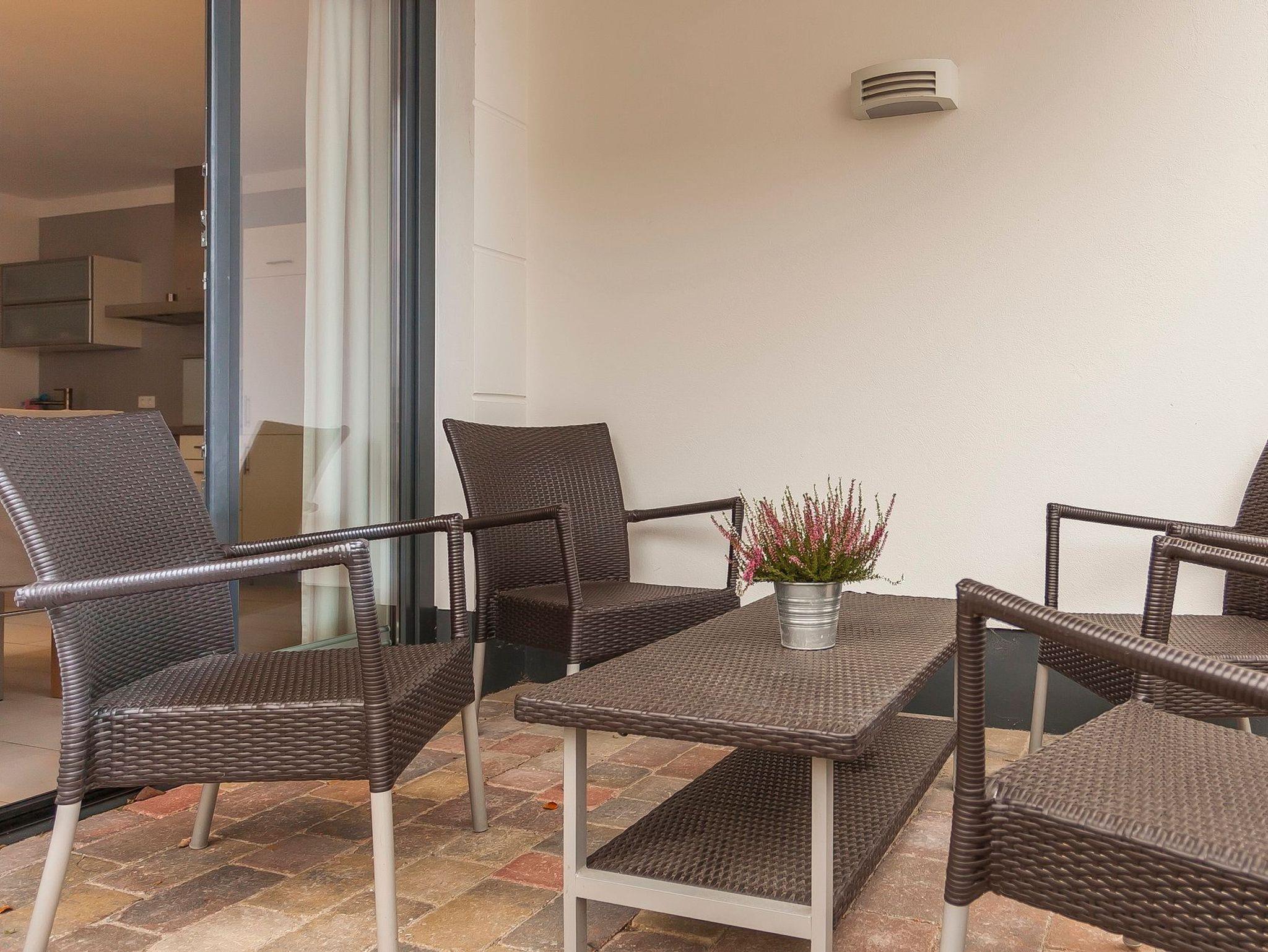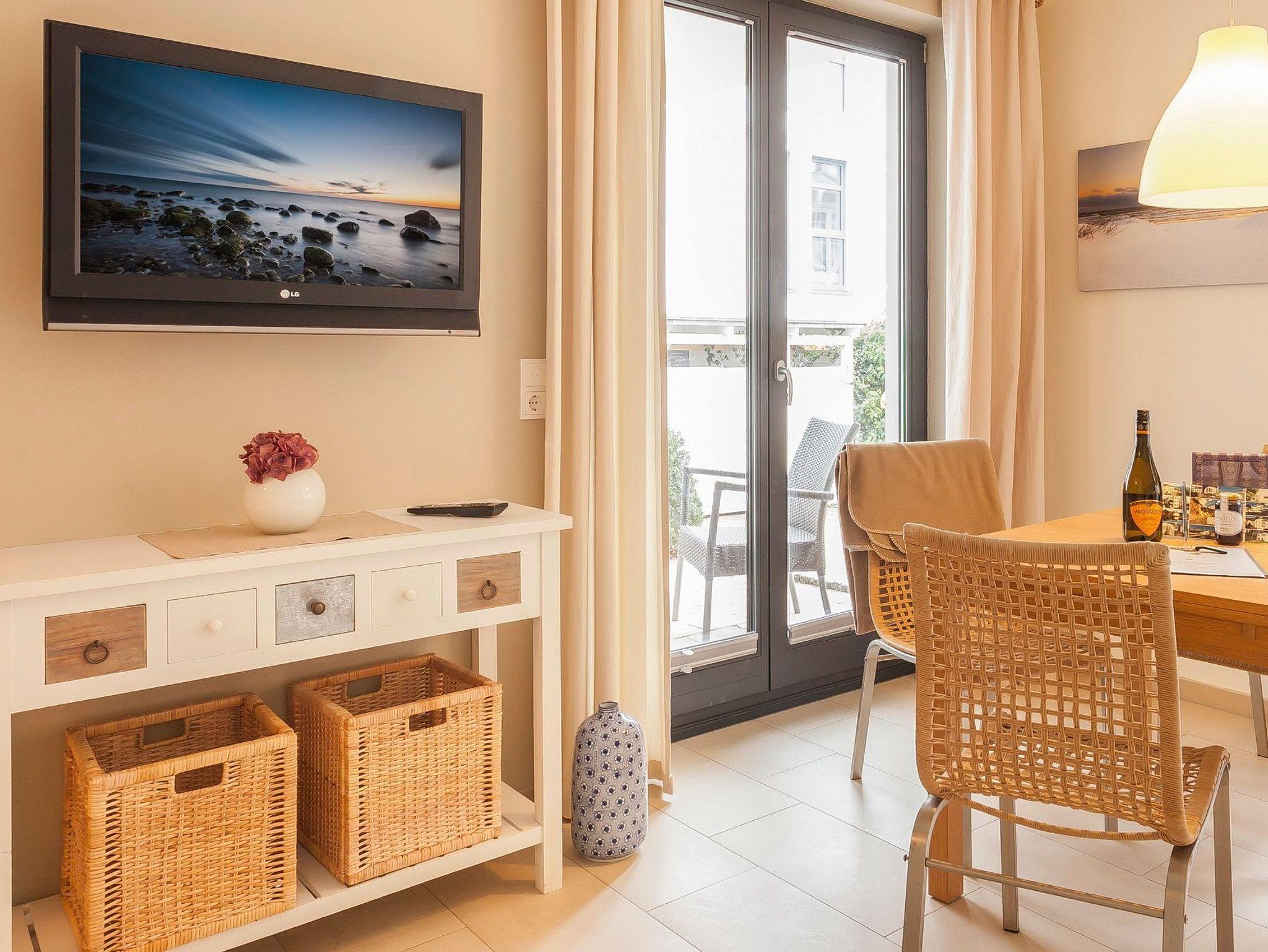 Das Doppelbett im Schlafzimmer ist geräumige 180 cm breit, im großen Schiebetürenschrank lassen sich alle Kleider problemlos unterbringen. Die hochwertig ausgestattete Markenküche im Wohn- und Esszimmer lädt Sie dazu ein, Ihren Kochkünsten freien Lauf zu lassen. Sehr angenehm fällt auch die Fußbodenheizung auf und bildet mit dem schmucken Bad mit seiner bodentiefen Dusche ein weiteres Highlight Ihres Urlaubsdomizils. Auch die technische Ausstattung Ihrer Fewo kann sich sehen lassen: 32 Kabel-Fernseher, Mini-Stereoanlage und kostenfreies W-LAN sorgen für Unterhaltung und Abwechslung, während die angeschlossene Terrasse bei schönem Wetter mit einer bequemen Lounge-Sitzgruppe zum Relaxen einlädt.