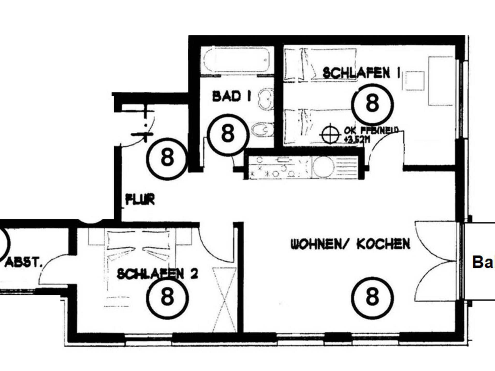 Die schöne Drei-Zimmer Ferienwohnung Nr. 8 mit einer Größe von 64 m² für bis zu 6 Personen liegt im 2. Obergeschoss und hat die folgende Einrichtung / Ausstattung: