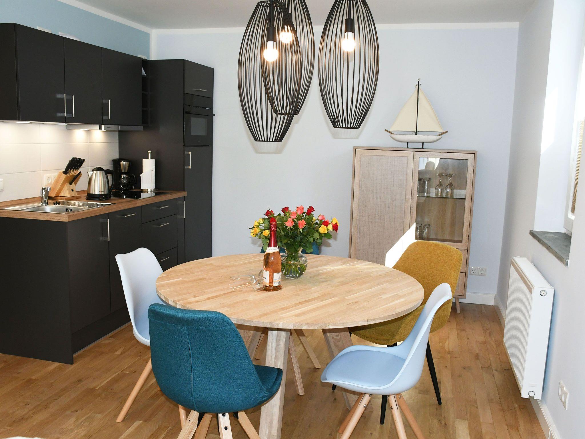 Für die, wie in einer Ferienwohnung üblich, Zubereitung kleiner Mahlzeiten stellt die Küchenzeile ausreichend Möglichkeit dar. Die Küchenzeile ist komplett mit Induktionskochfeld, Backofen, Kühlschrank, Spülmaschine, Kaffeemaschine, Toaster, Wasserkocher und Geschirr ausgestattet. Der runde, robuste und pflegeleichte Esstisch bietet einen Rahmen für gesellige Mahlzeiten.