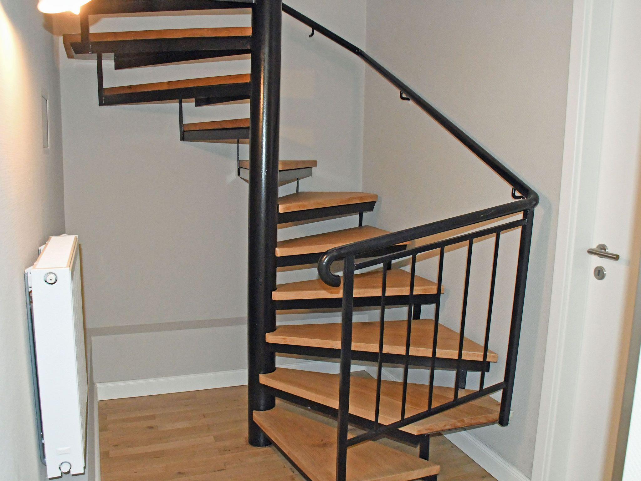 Vom Flur aus gelangt man über die Wendeltreppe in den unteren Wohnbereich der Ferienwohnung mit Küche, Wohn- und Essbereich, sowie dem Zugang zur in westlicher Richtung ausgerichteten Terrasse. Die Wohnungen sind ausgestattet mit einem Parkettboden im warmen Holzfarbton, weißen Fenstern und Zimmertüren.