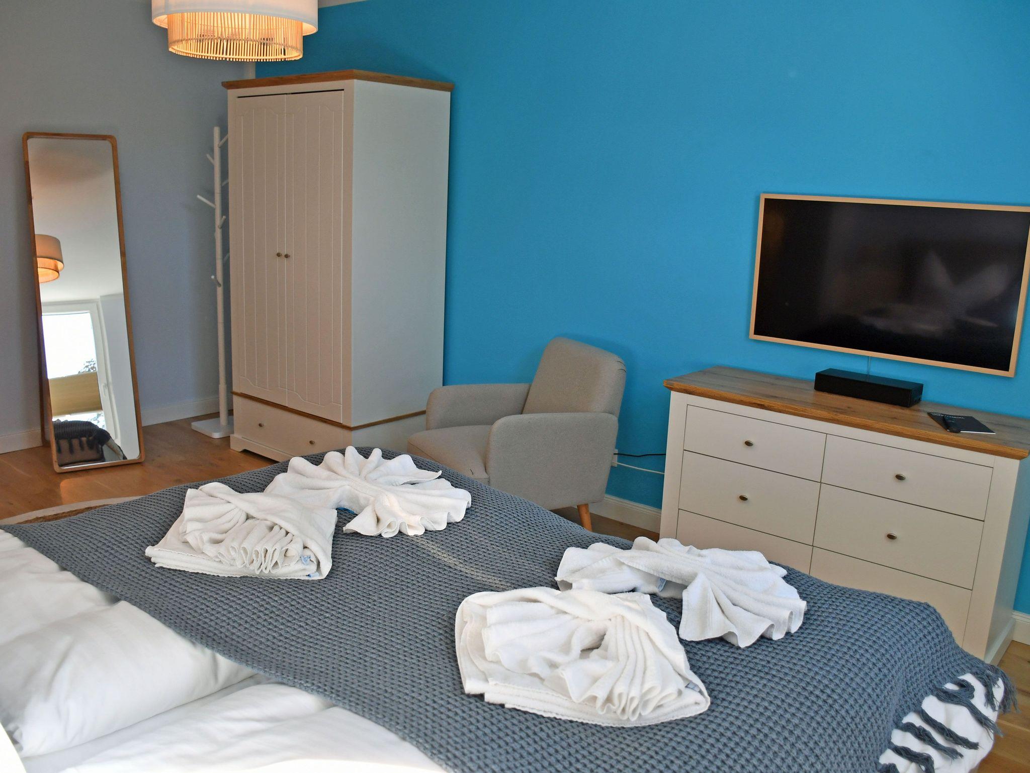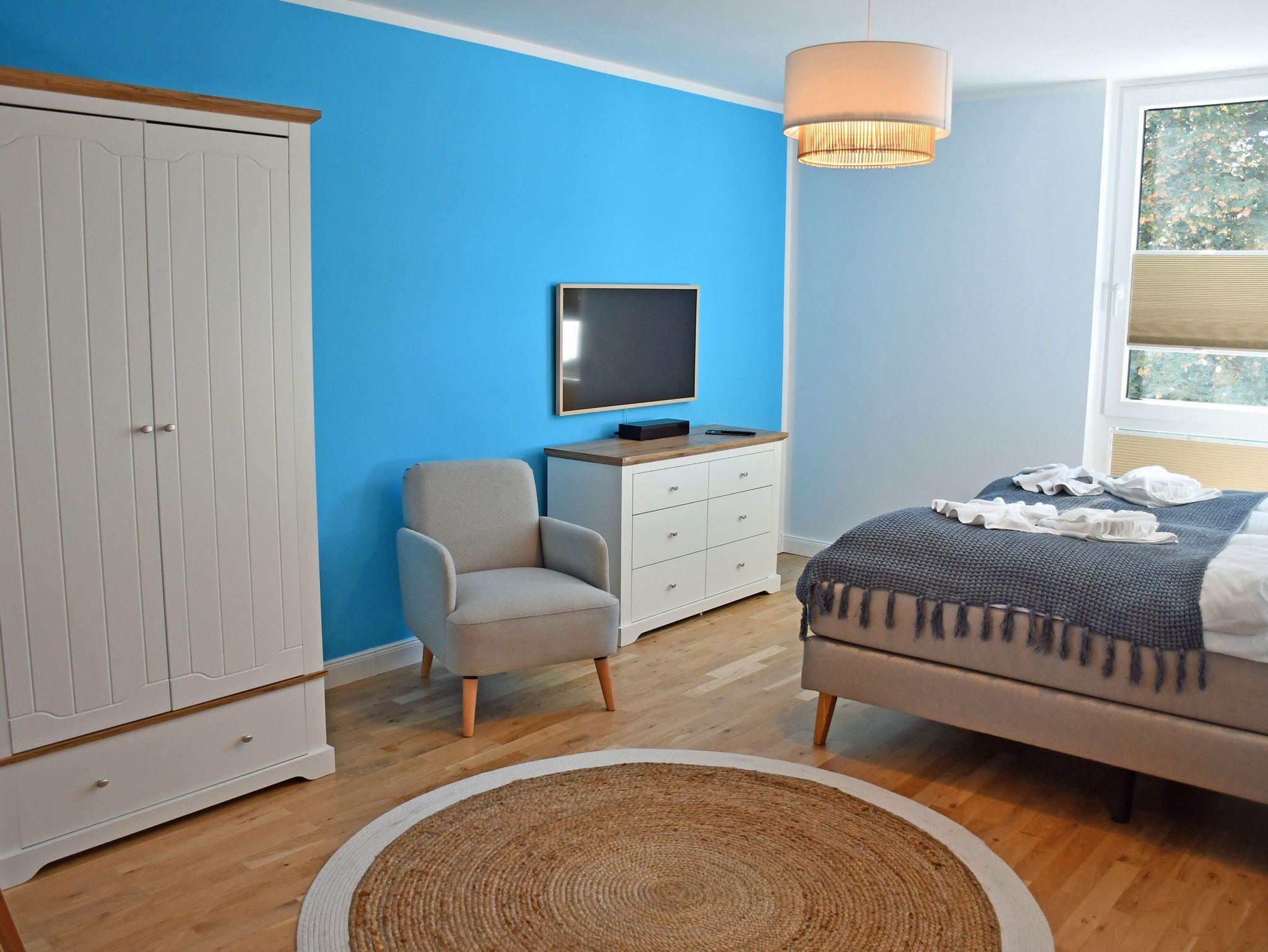 Jede der Wohnung wird ebenerdig über die Eingangstür betreten. Hier erstreckt sich gleich rechtsseitig ein kleines Duschbad, sowie dem Flur folgend ein großzügiger langgezogener Schlafraum. Ein bequemes Boxspringbett (1,80 m) mit Nachttischen und Leselampen sorgt hier für hohen Komfort und erholsamen Schlaf der Gäste und bildet den zentralen Punkt des Raumes. Ein 3- türiger Kleiderschrank und eine Kommode bieten ausreichend Stauraum für Kleider. Der große Bettkasten bietet Stauraum für die zur Aufbettung zusätzlich benötigten Bettdecken. Die Fenster können bei Bedarf zum Schlafen verdunkelt werden.
