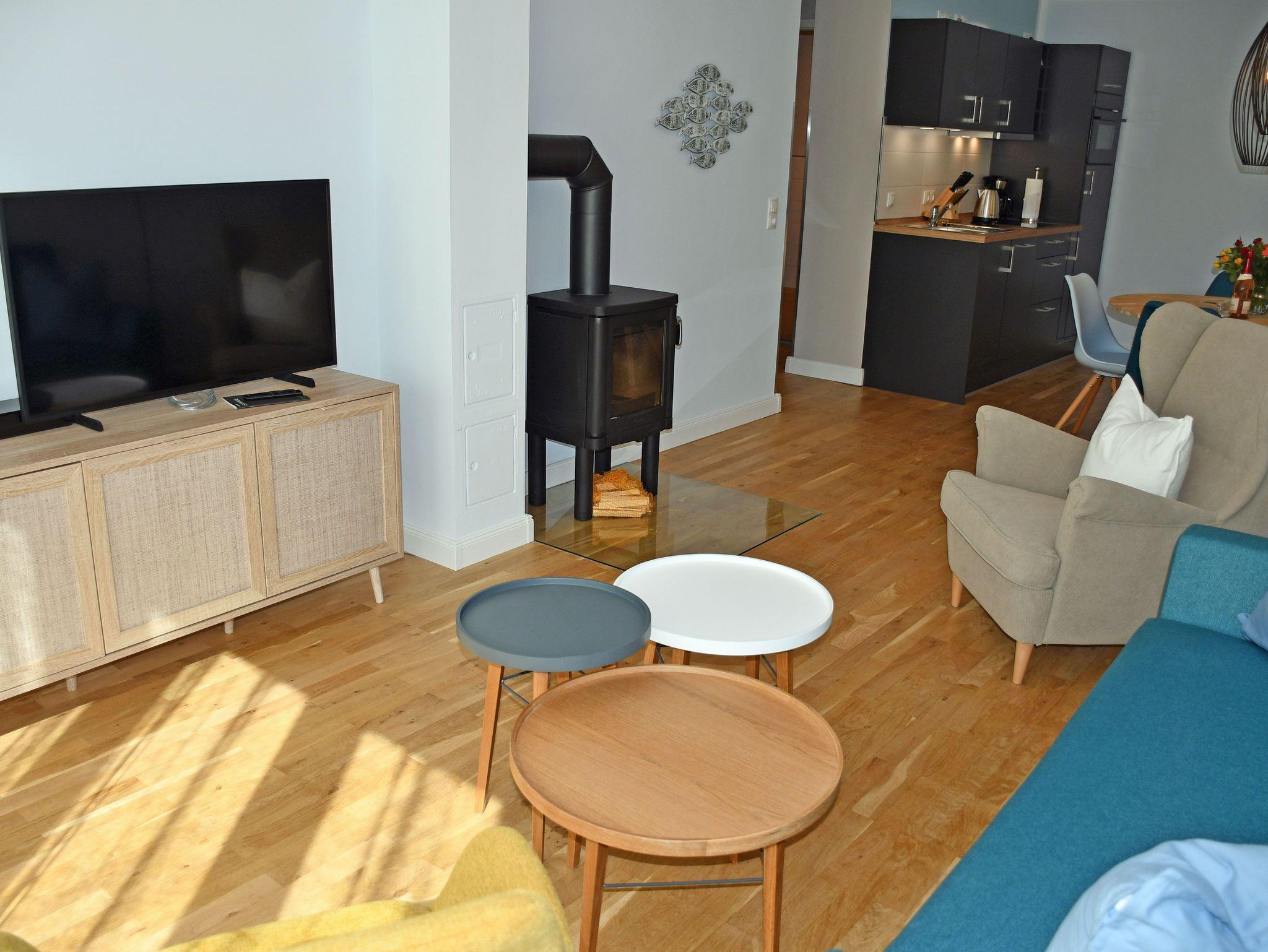 Das Wohnzimmer verfügt über einen Flachbild-TV, eine Sitzcouch, Sessel, Tisch, eine Essecke und eine Schlafcouch (1,60 m). Ein kleiner Kaminofen wird die Attraktivität der Ferienwohnung besonders in der dunklen Jahreszeit erheblich steigern. Auf der Schlafcouch können zwei Aufbettungen hergestellt werden.