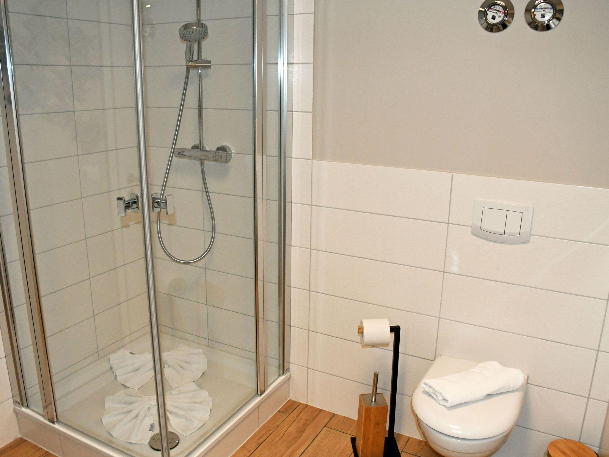Das Bad ist mit Dusche und WC ausgestattet und verfügt über Tageslicht.