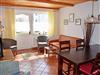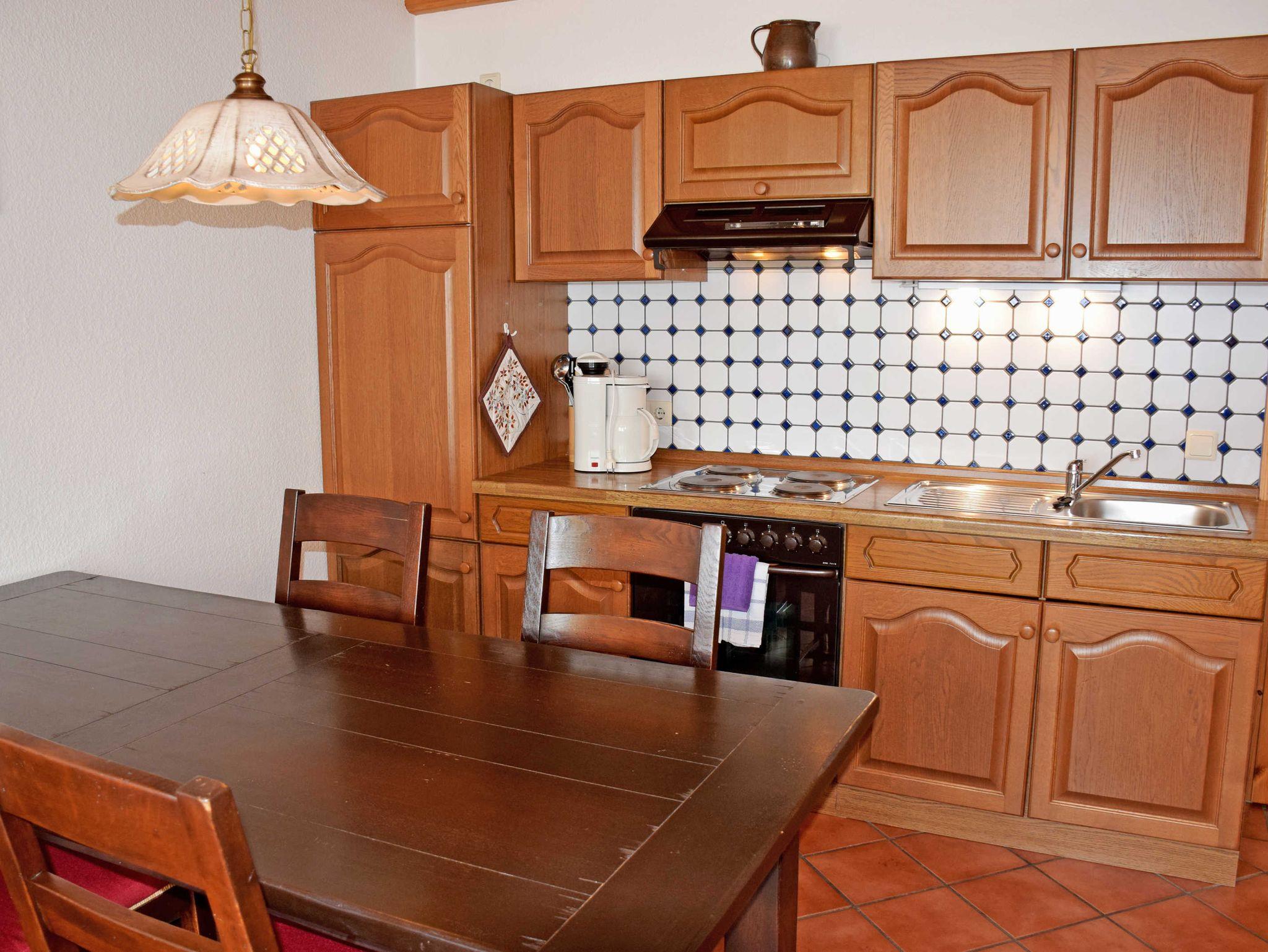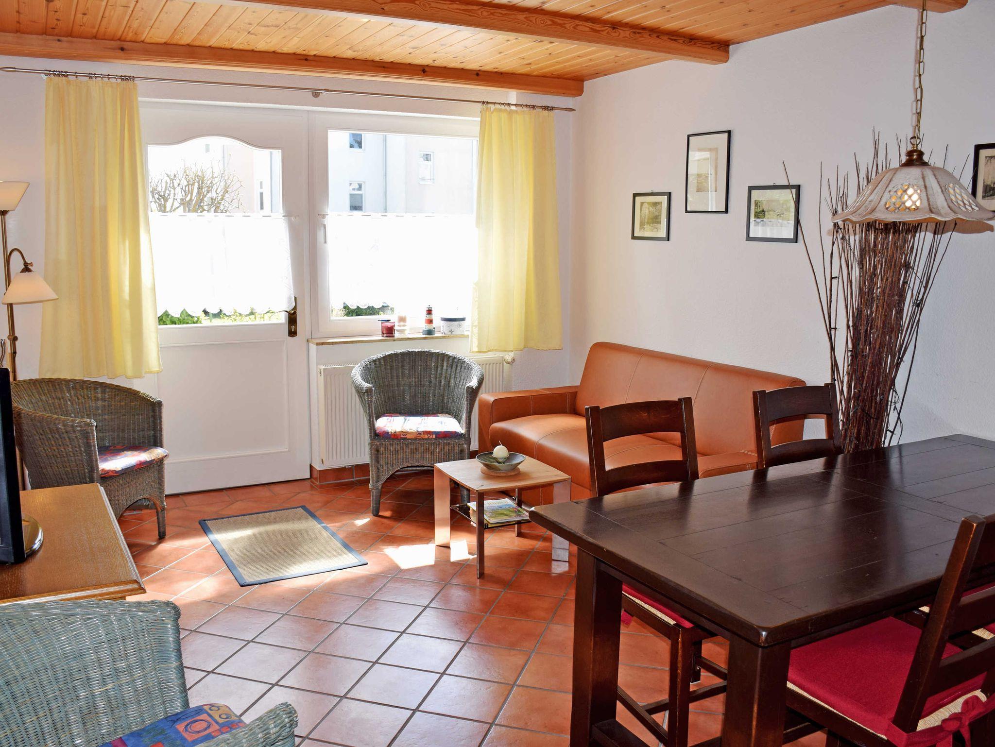 Hier befinden sich eine Sitzcouch mit Tisch und drei Sessel sowie ein Schrank mit TV-Gerät und ein Esstisch mit Stühlen. Dieses Ferienappartement verfügt über ein kostenloses WLAN - Internet. Die Küchenzeile ist mit einem Herd, Abzugshaube, Backofen, Wasserkocher, Kaffeemaschine, Toaster und Kühlschrank mit Tiefkühlfach komplett ausgestattet.