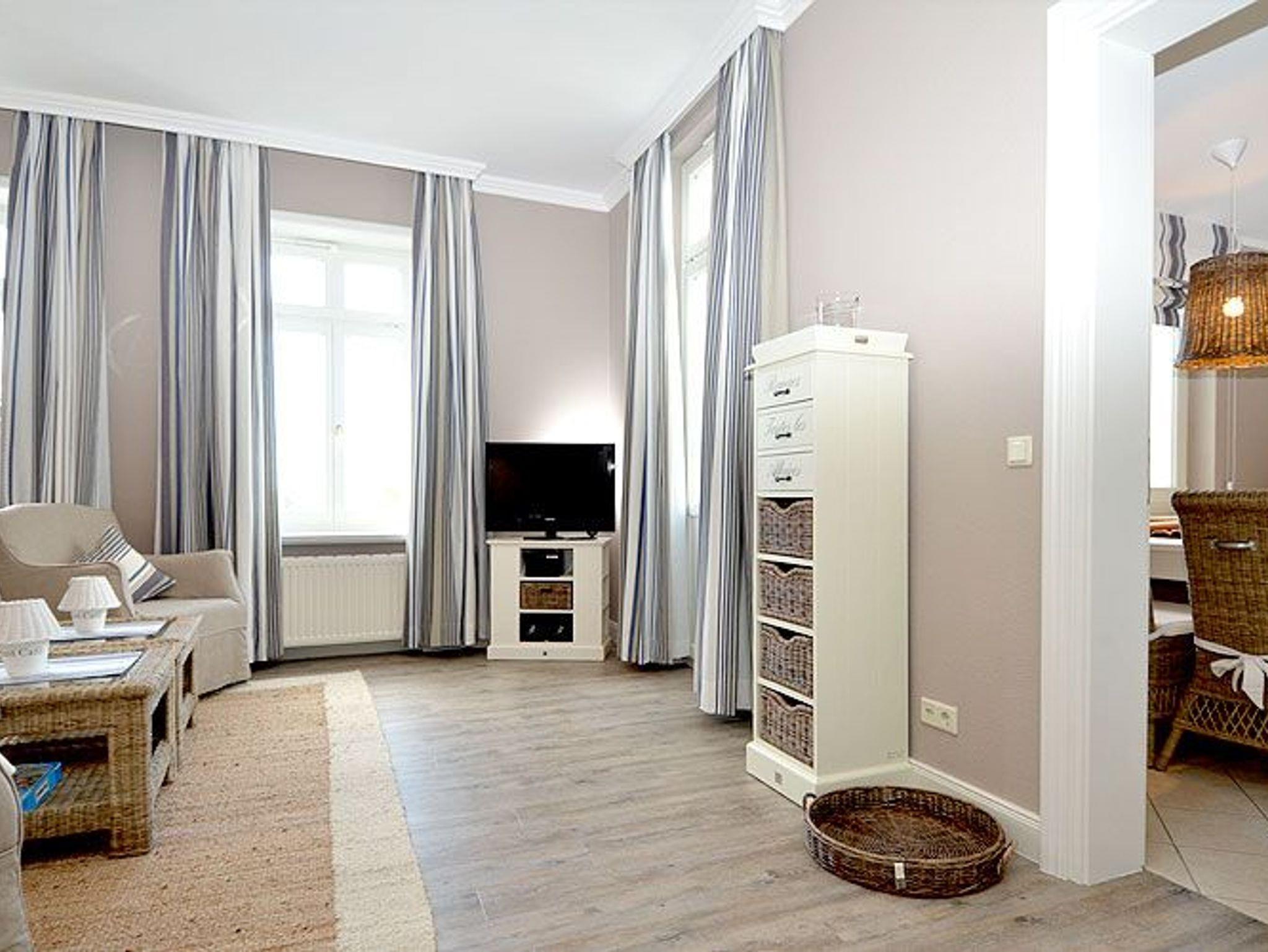Dieses rund 50 m² große und stilvoll eingerichtete 2-Raum-Appartement befindet sich im 2. Obergeschoss und hat einen 5 m² möblierten Balkon. Die wunderschönen Landhausmöbel, ausgesuchte Stoffe und die warmen Erdtöne schaffen mit den leicht maritimen Akzenten ein ganz einzigartiges Wohlfühlambiente.