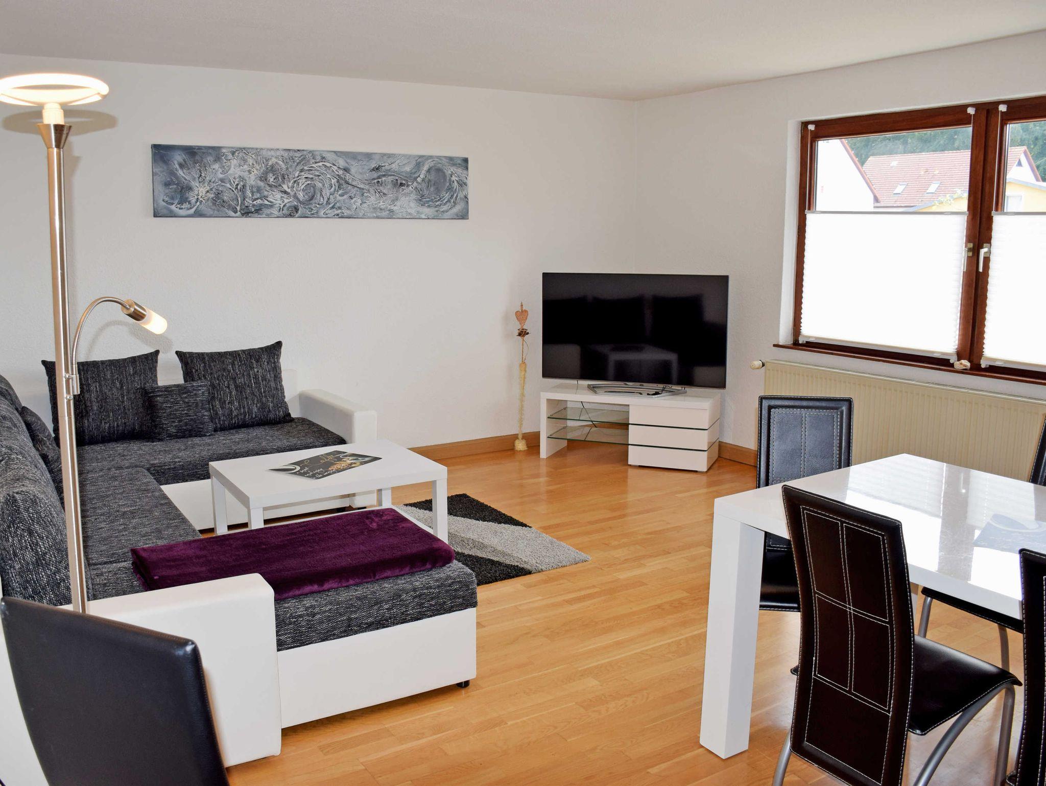 Im Wohnbereich befindet sich ein moderner Flachbildfernseher.