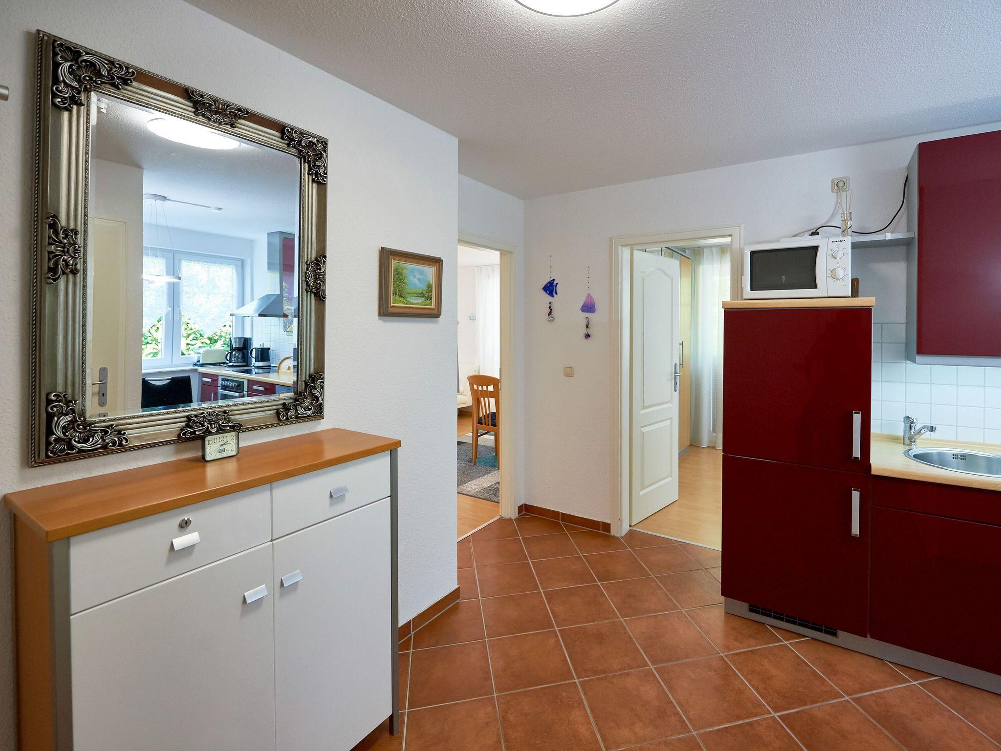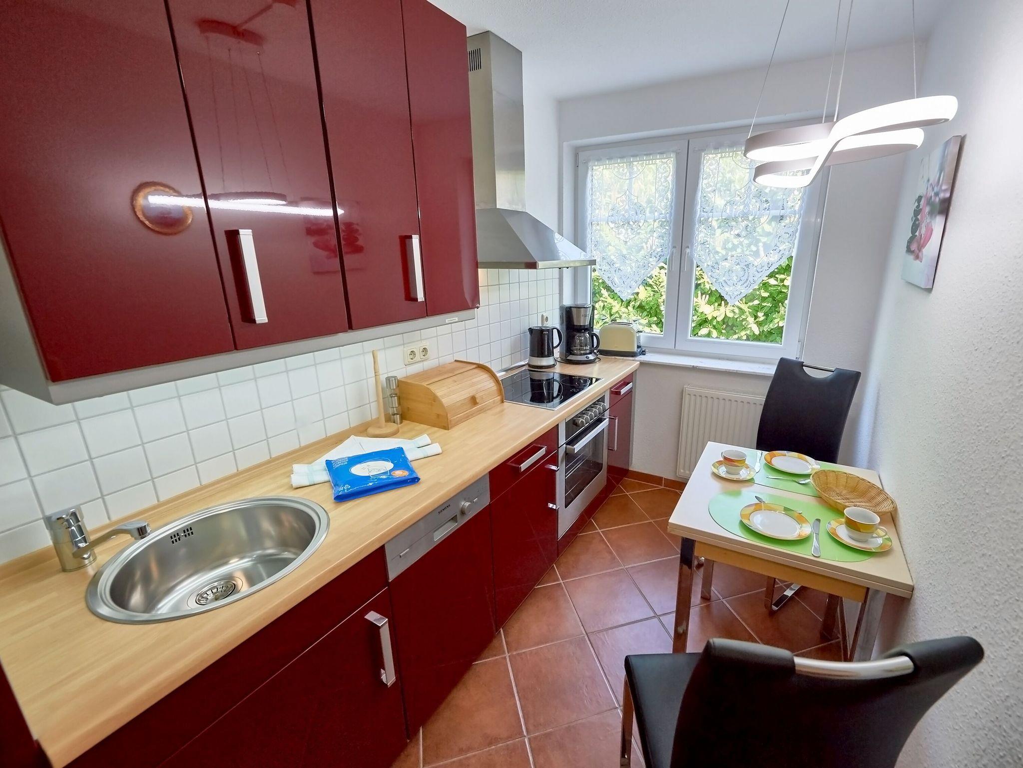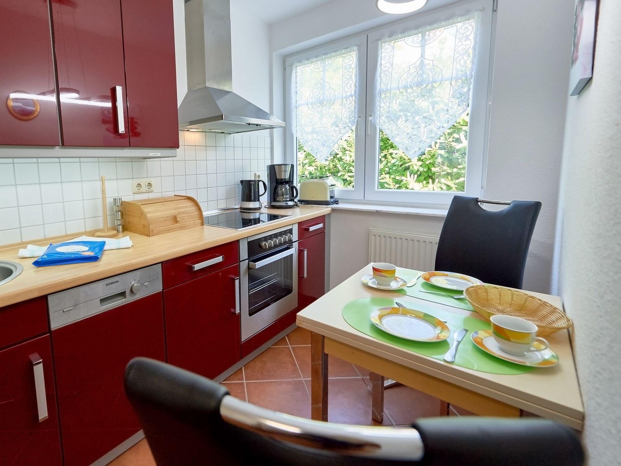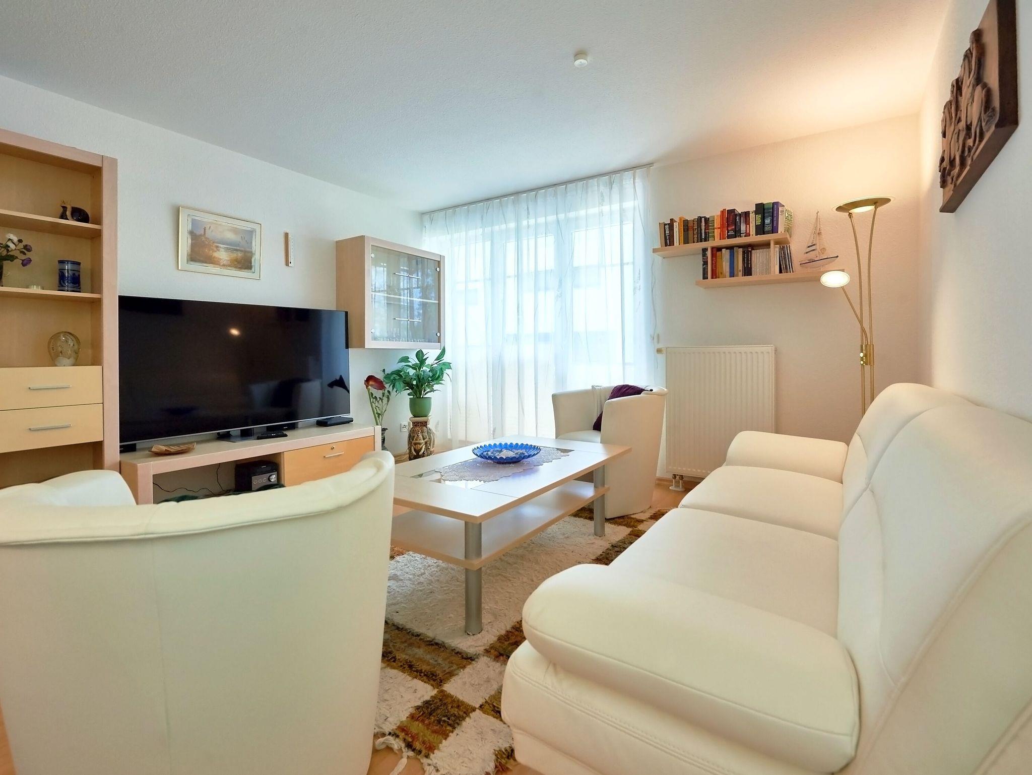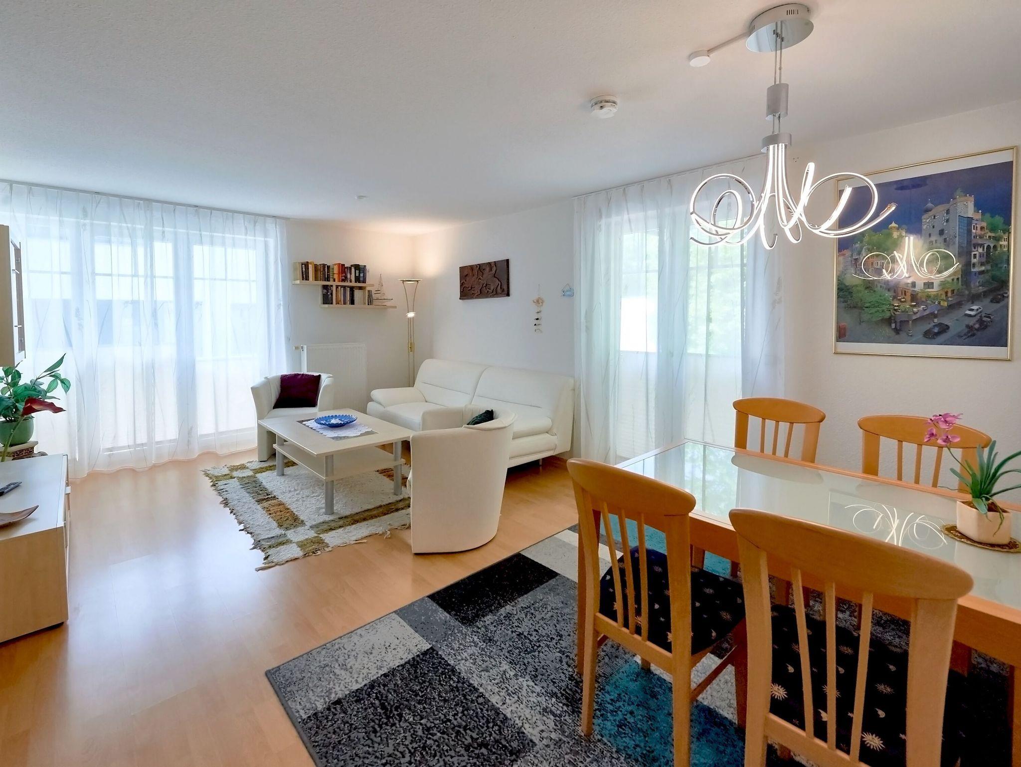 Dieses sehr schöne 2-Raum-Appartement im 1.Obergeschoss ist rund 65 m² groß und hat gleich zwei Balkone. Das große Wohnzimmer ist mit einer gemütlichen Couch, einem Esstisch, einem großformatigen Flachbild-TV und einer Stereoanlage mit CD-Player ausgestattet. W-LAN ist kostenfrei verfügbar.