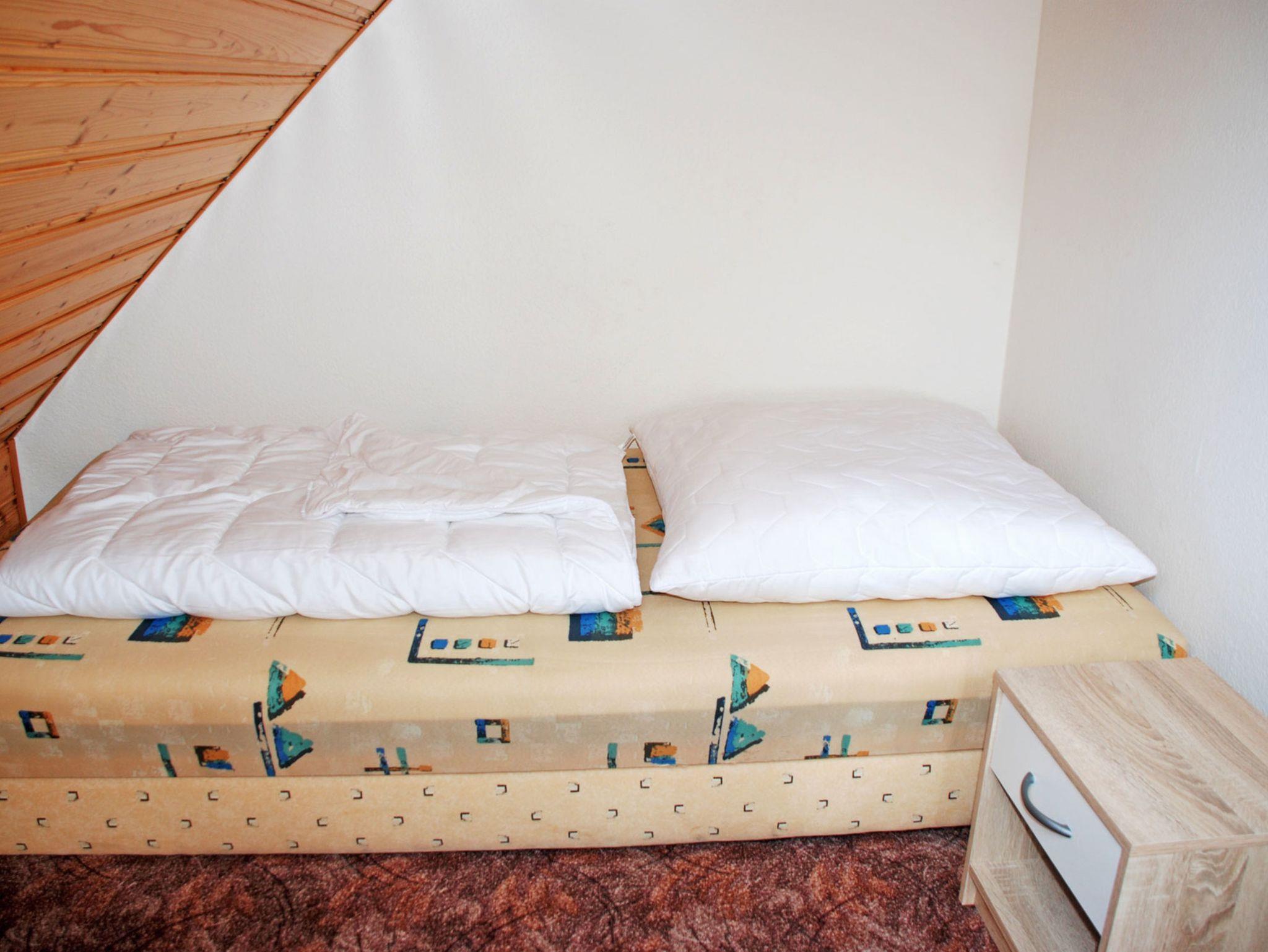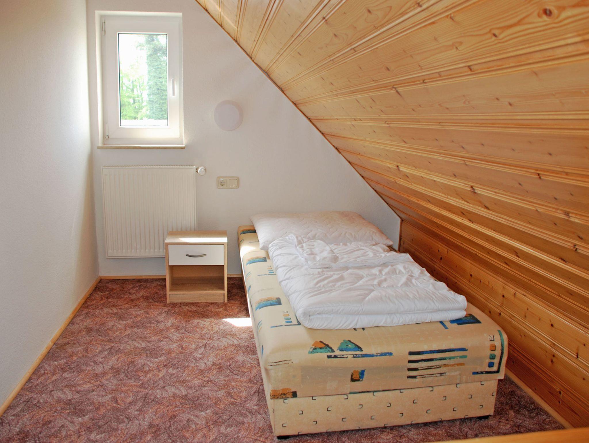 Diese modern eingerichtete Ferienwohnung liegt im Obergeschoss und bietet auf 42 qm Platz für max. 4 Gäste und hat Internet WLAN. Über den separaten Eingang in Hausflur gelangen Sie in den Flur mit Garderobe und Kleiderschrank. Im gemütlichen Wohnzimmer stehen eine Polstersitzgruppe mit Tisch und Sesseln und ein Schrank mit TV - Gerät. Hier steht auch ein Esstisch mit Stühlen. Im ersten Schlafzimmer stehen ein bequemes Doppelbett (durchgehende Matratze) mit Nachttischen und Leselampen sowie ein Kleiderschrank. Über eine Holztreppe im Wohnbereich gelangt man in den ausgebauten Dachboden, hier stehen zwei Einzelbetten mit Leselampen und zwei kleine Schränke.